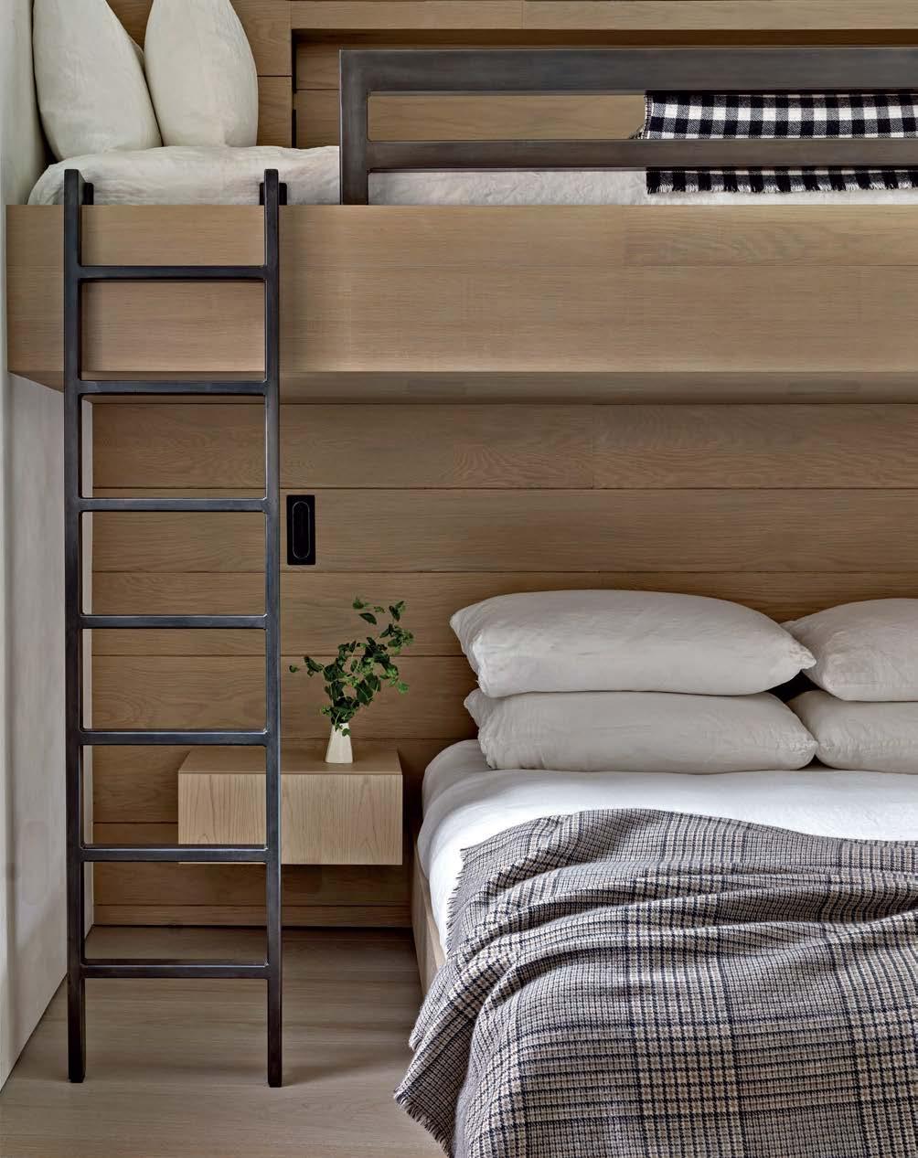Above: The bunk room, converted from a former open loft space, contains twin beds floating above a queen—bespoke pieces dreamed up by designer Sarah Rankin and built by Grand Woodworks, Inc. The ladder and rail are blackened steel.