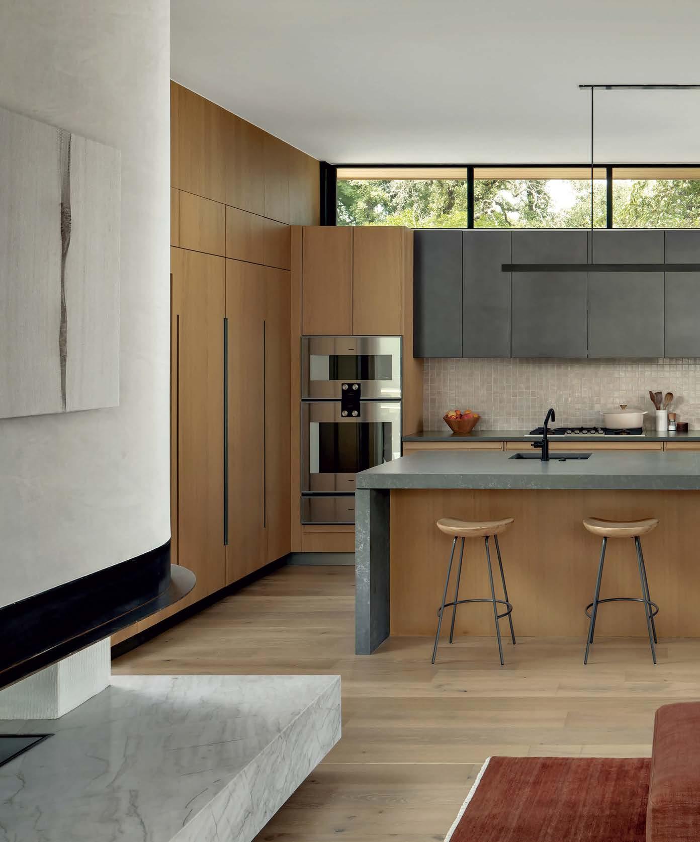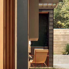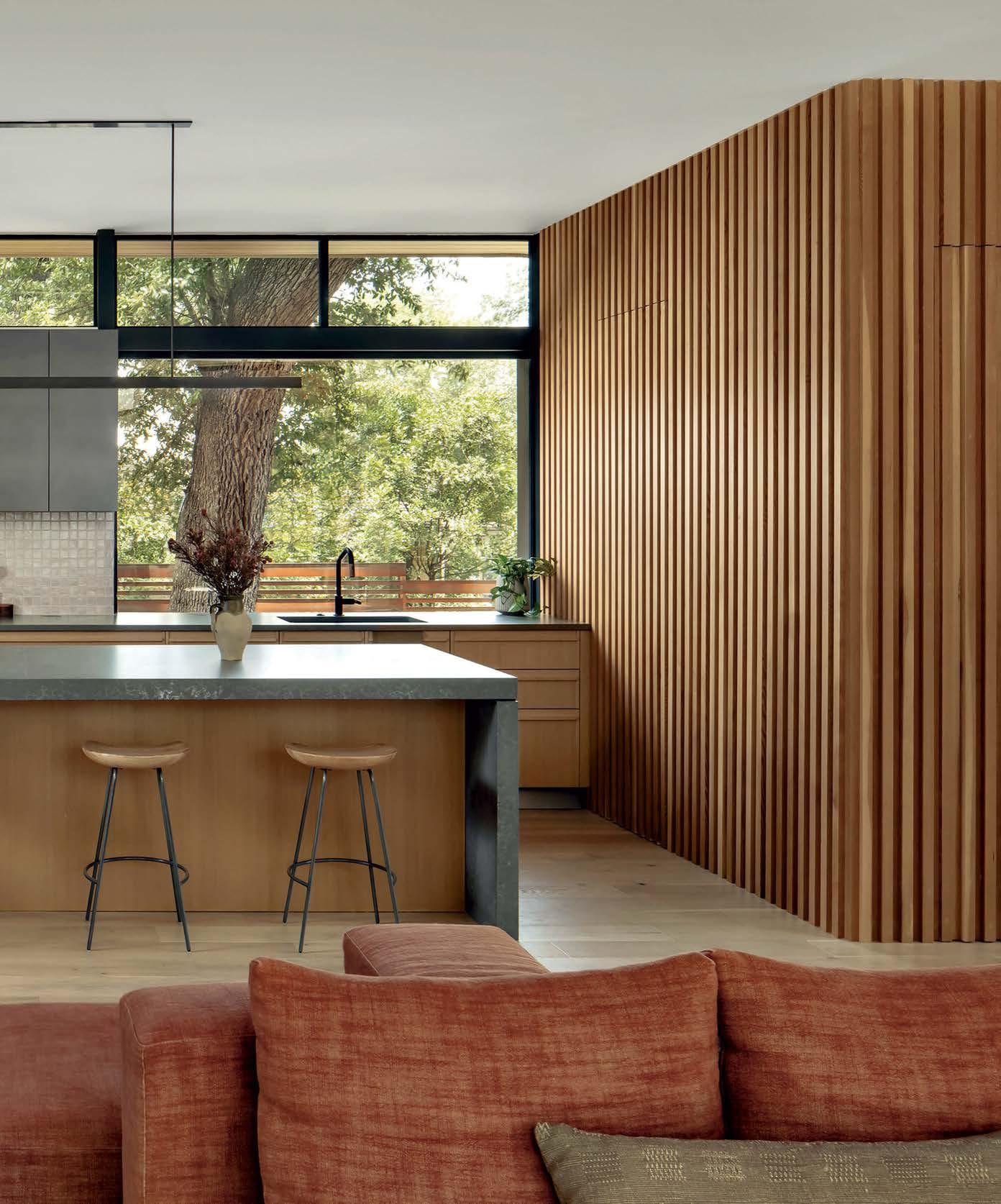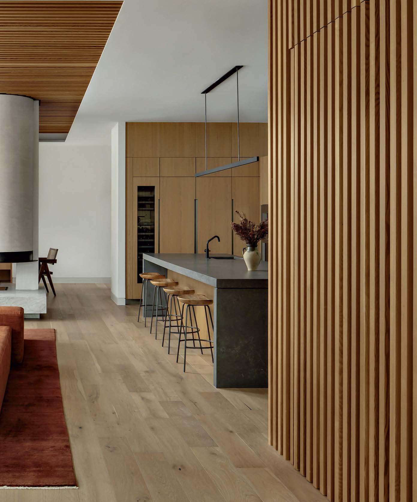 The architecture duo continued the exterior palette inside, most dramatically with slatted hemlock ceiling and wall panels in the main living areas. It’s a dynamic feature that adds texture and character. “The various woods and nishes used throughout the home, as well as the contrast of smooth and rough, light and dark, give the house a handcrafted feel,” Frank observes. The living room and kitchen, on axis with the courtyard for an easy ow, share a certain synergy, while the dining room is separated by a see-through replace. “Sometimes an open plan can be too open,” Megan muses. “People want different spaces again, and this replace connects the main rooms while still de ning them.”