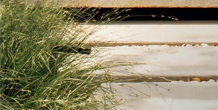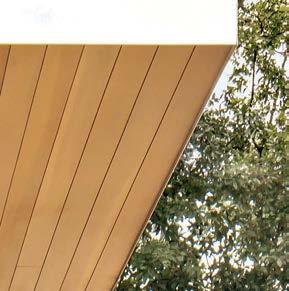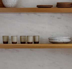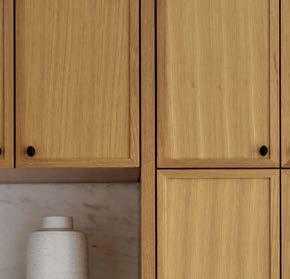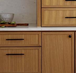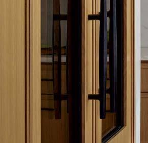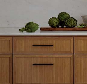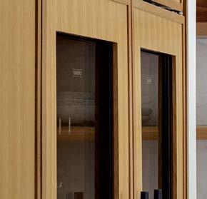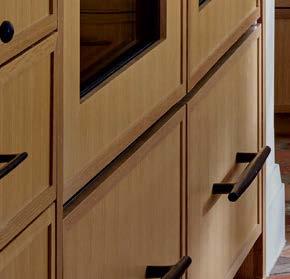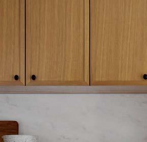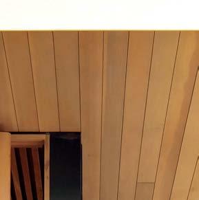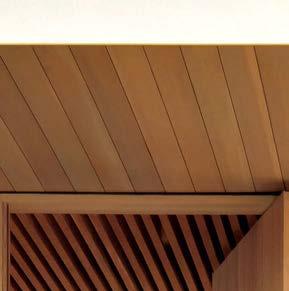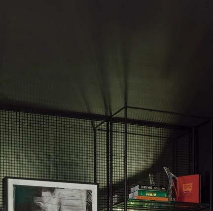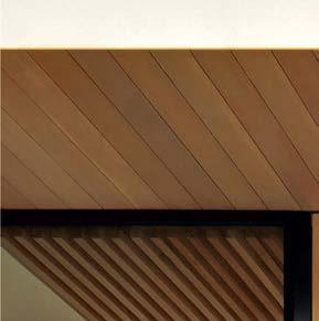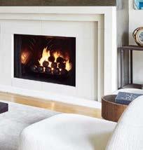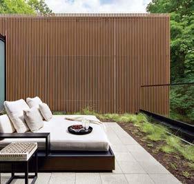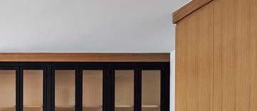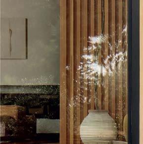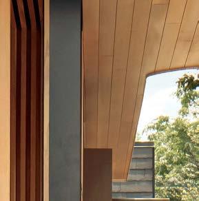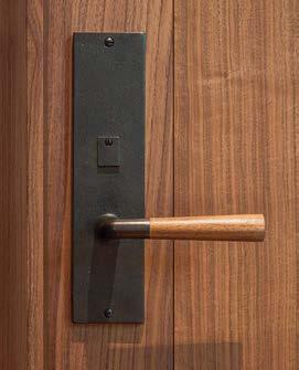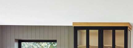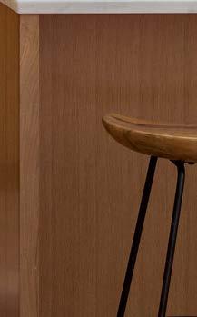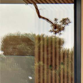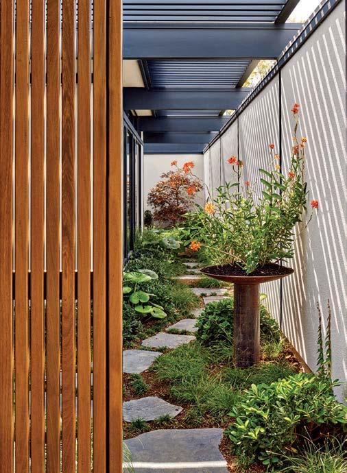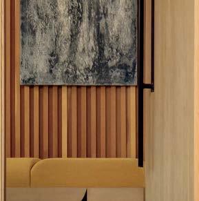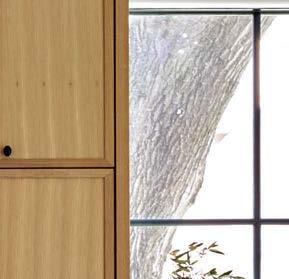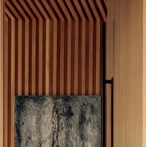 The architecture duo continued the exterior palette inside, most dramatically with slatted hemlock ceiling and wall panels in the main living areas. It’s a dynamic feature that adds texture and character. “The various woods and nishes used throughout the home, as well as the contrast of smooth and rough, light and dark, give the house a handcrafted feel,” Frank observes. The living room and kitchen, on axis with the courtyard for an easy ow, share a certain synergy, while the dining room is separated by a see-through replace. “Sometimes an open plan can be too open,” Megan muses. “People want different spaces again, and this replace connects the main rooms while still de ning them.”