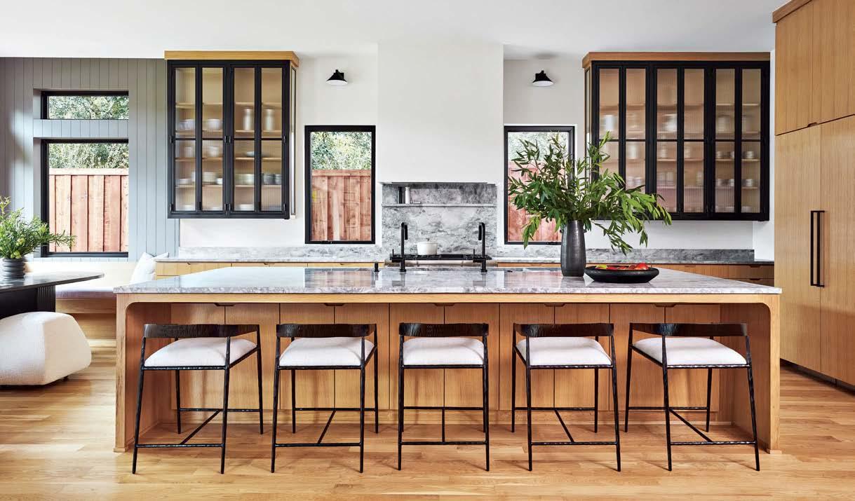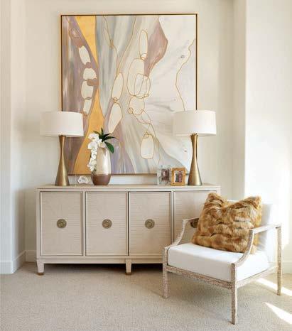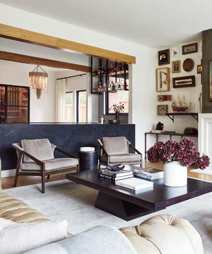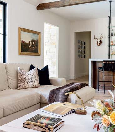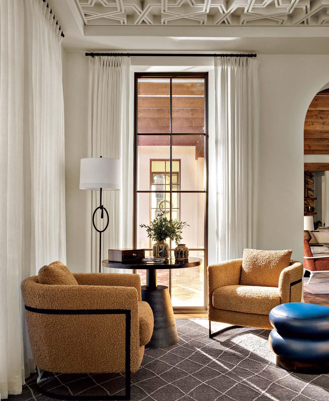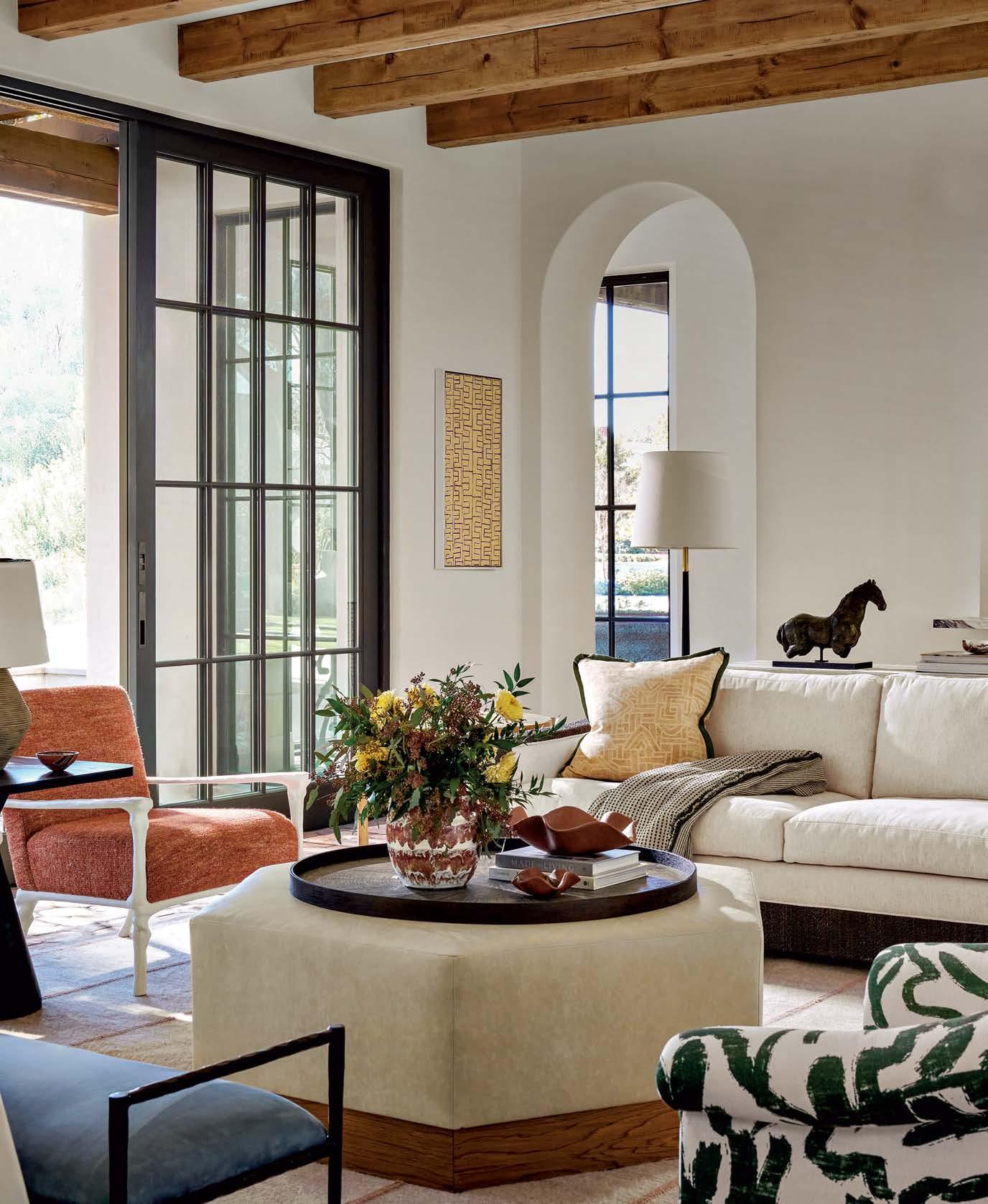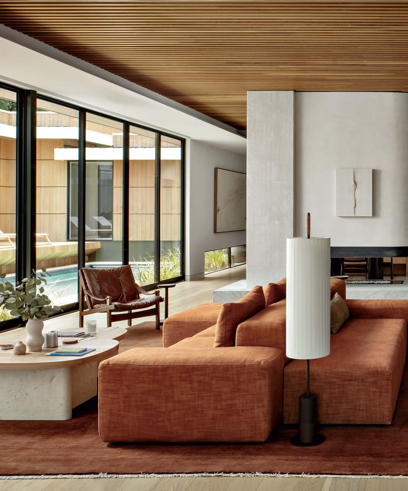 that mitigate light while adding privacy. Tucker also focused on an earthy palette and textural fabrics like the slub linen used on the living room’s multisided sofa, a design chosen to elicit easy conversation with anyone in the kitchen and living space as well as engage with the pool area outside. “We didn’t want the traditional sofa-andchairs setup because this couple often cooks and entertains by the pool,” the designer elaborates. “More conventional furnishings would have been too static in this space.”