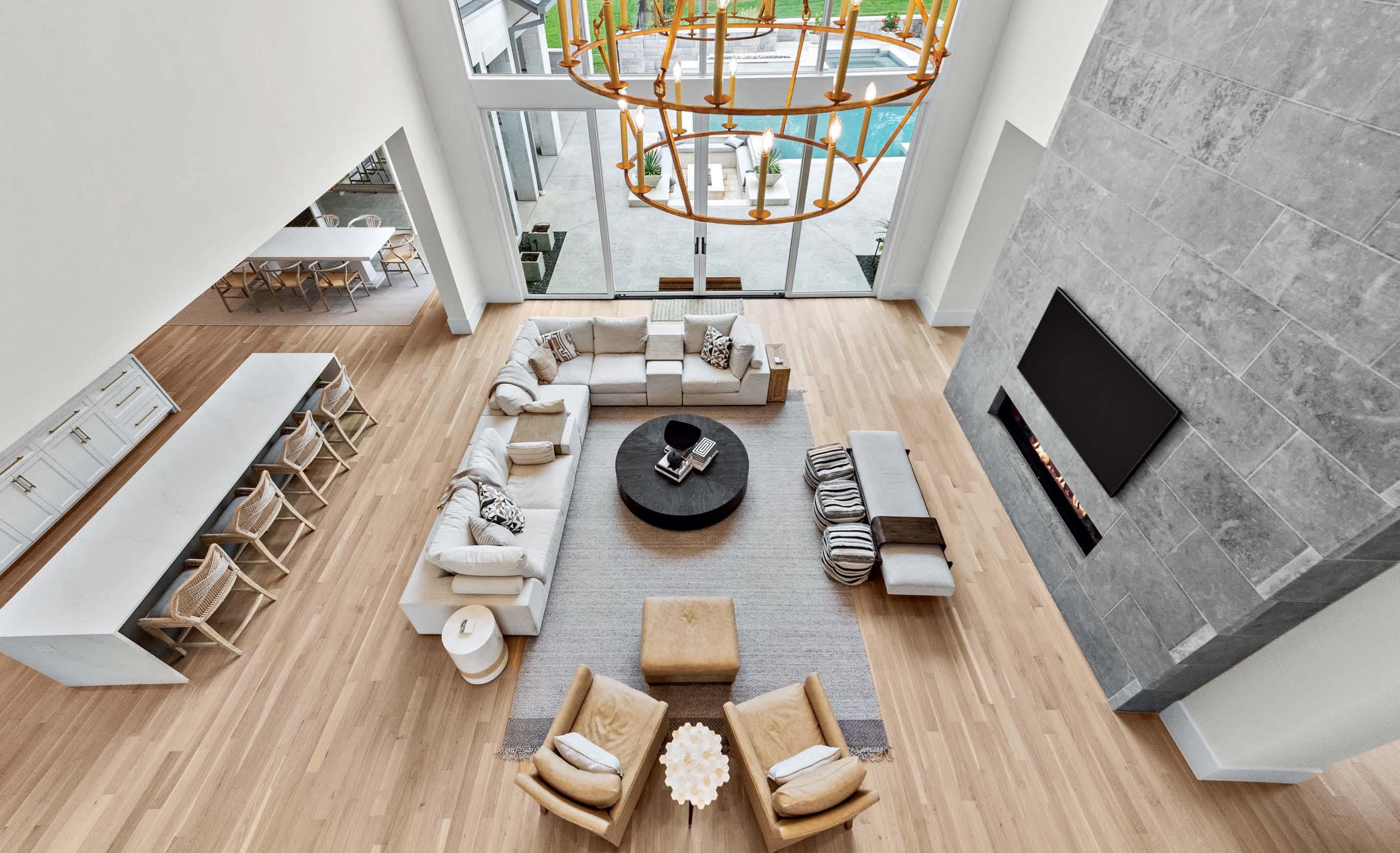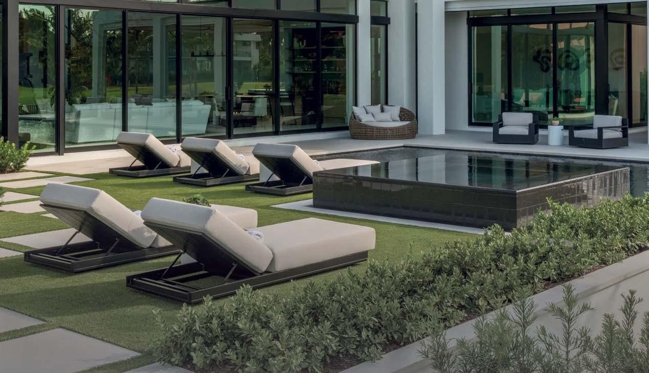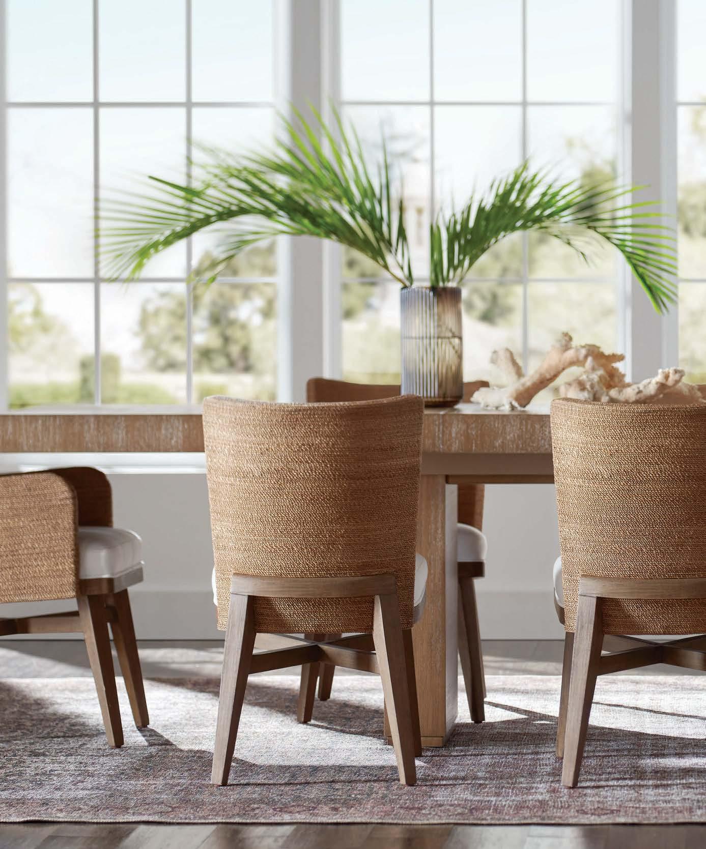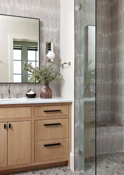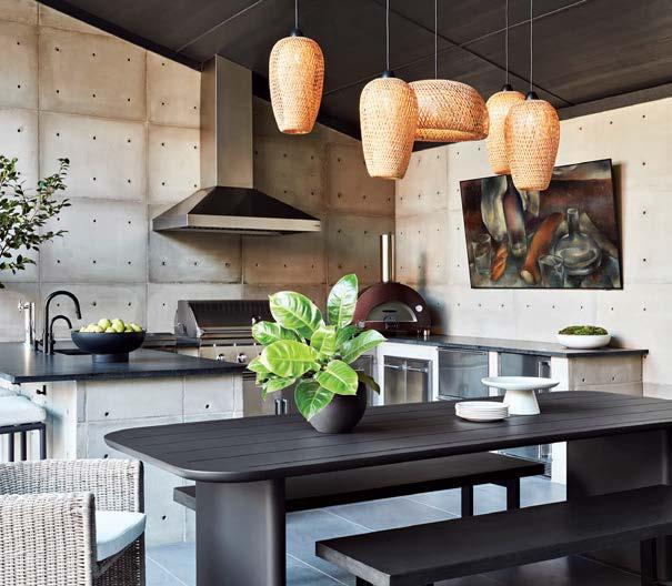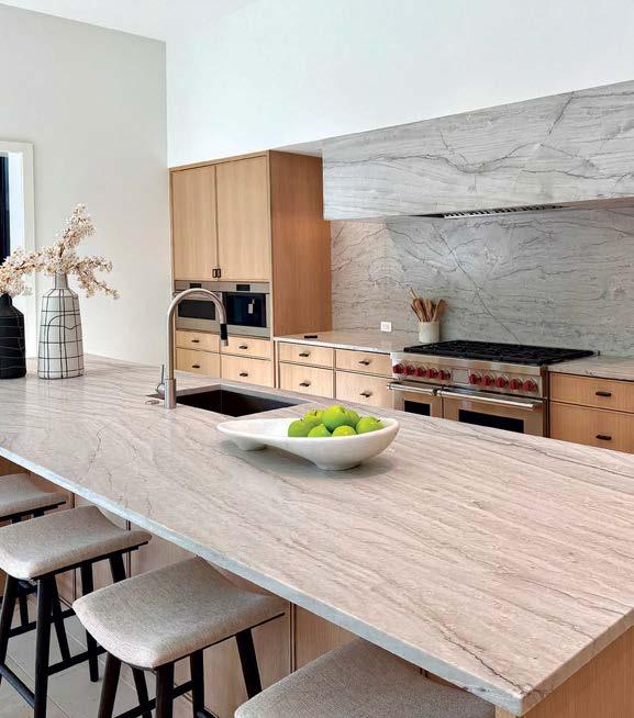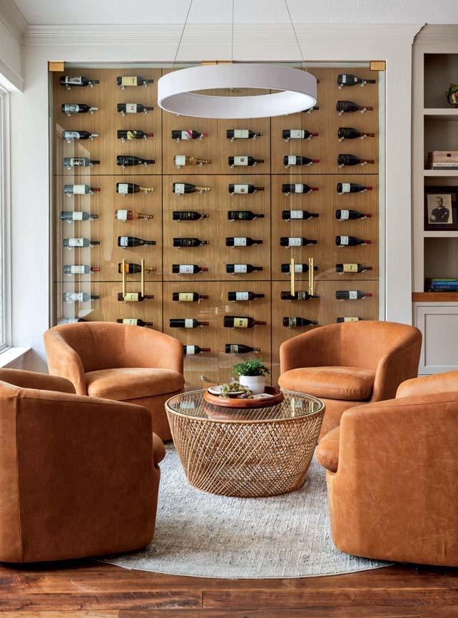 that mitigate light while adding privacy. Tucker also focused on an earthy palette and textural fabrics like the slub linen used on the living room’s multisided sofa, a design chosen to elicit easy conversation with anyone in the kitchen and living space as well as engage with the pool area outside. “We didn’t want the traditional sofa-andchairs setup because this couple often cooks and entertains by the pool,” the designer elaborates. “More conventional furnishings would have been too static in this space.”