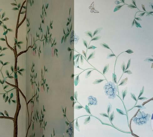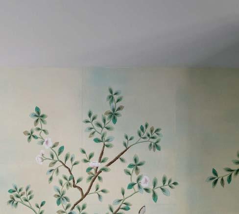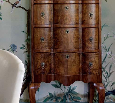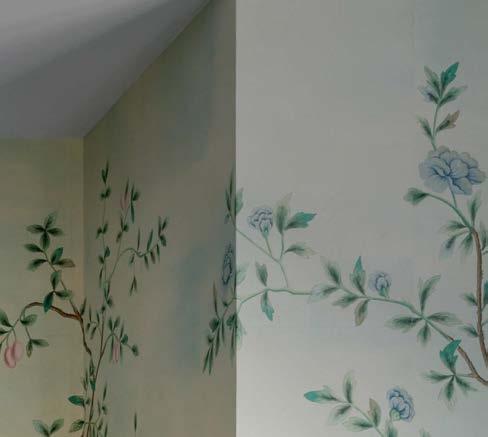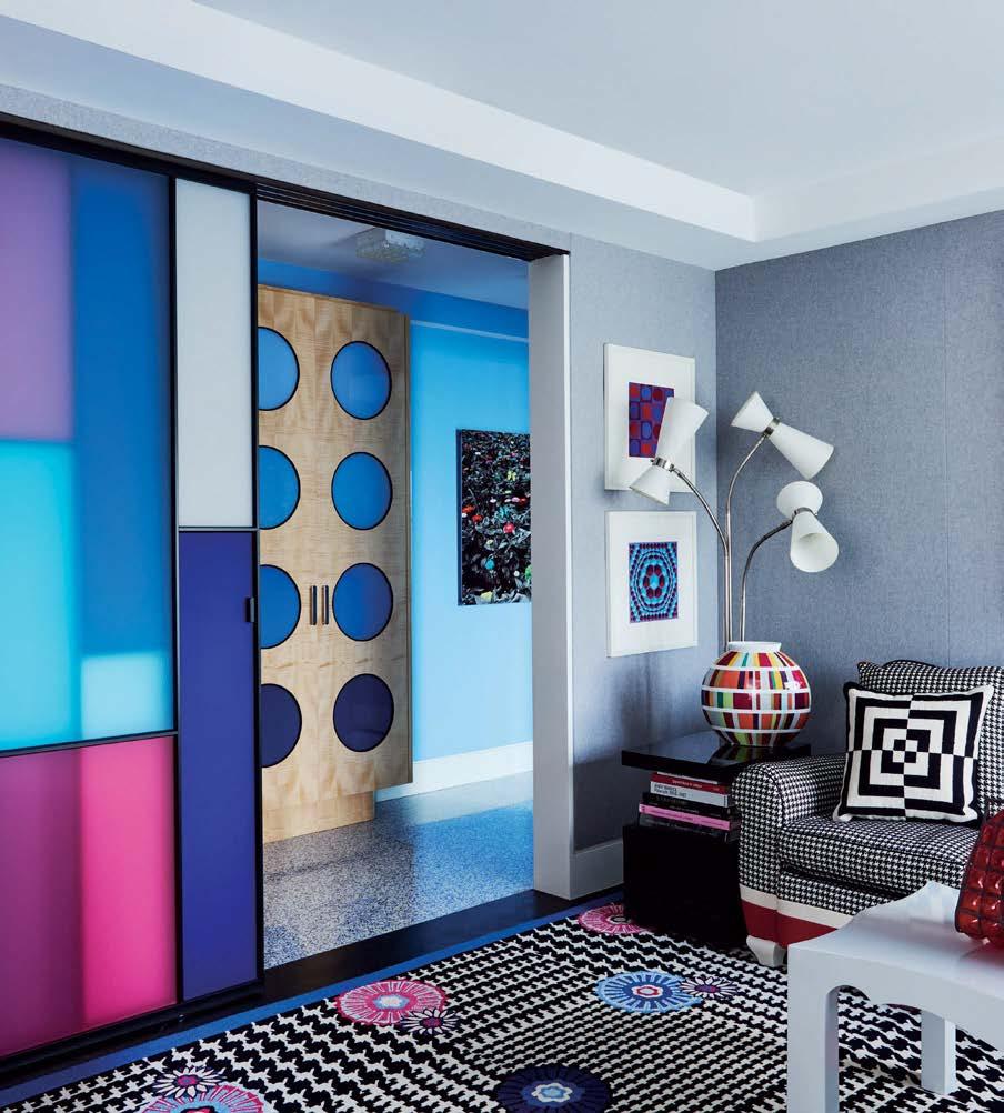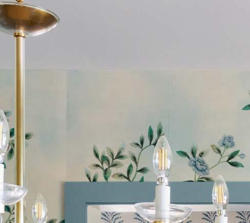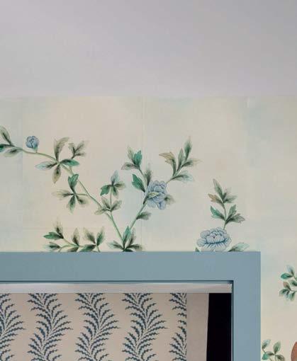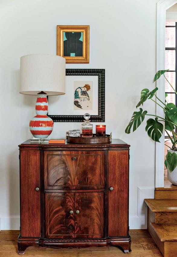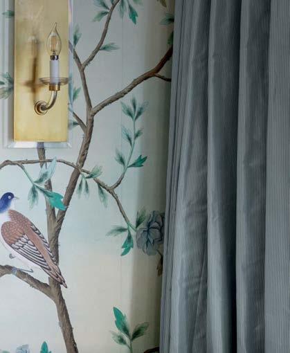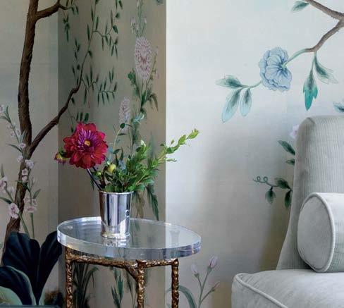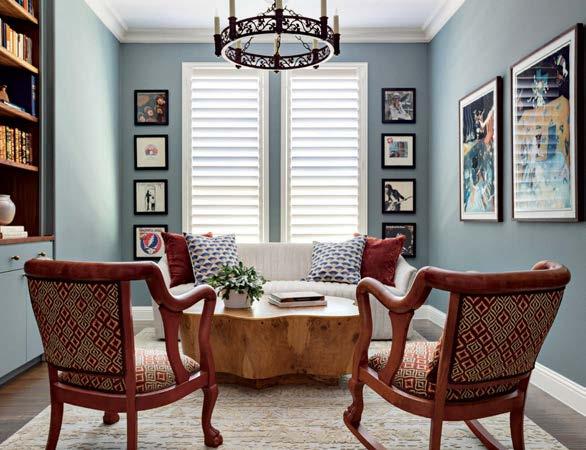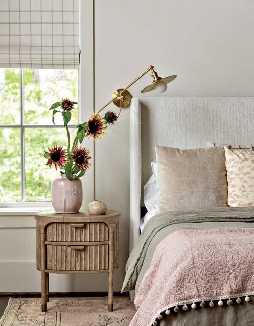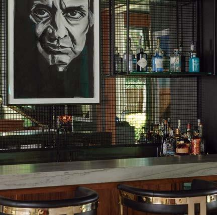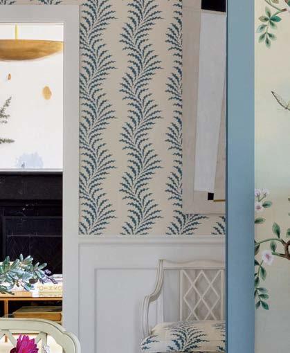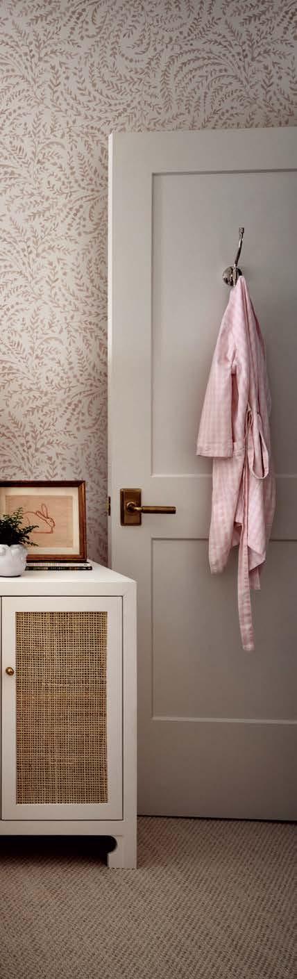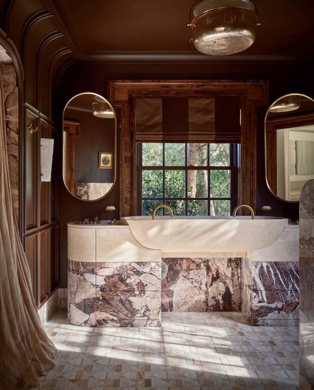 Because the client often uses the property to gather for special occasions, guest quarters take on the vibe of a boutique hotel, each with its own personality and descriptive name. The Blue Room, for instance, is covered in a cerulean-andwhite pattern that repeats in the wallpaper and drapes, adding levity to an otherwise cozy area. Just like the rest of the home, these rooms hold wisdom from eras past. “There’s a duality to the spirit of the design,” Contreras muses. “There’s this reflection on generations before but also an optimism of looking toward the future.”