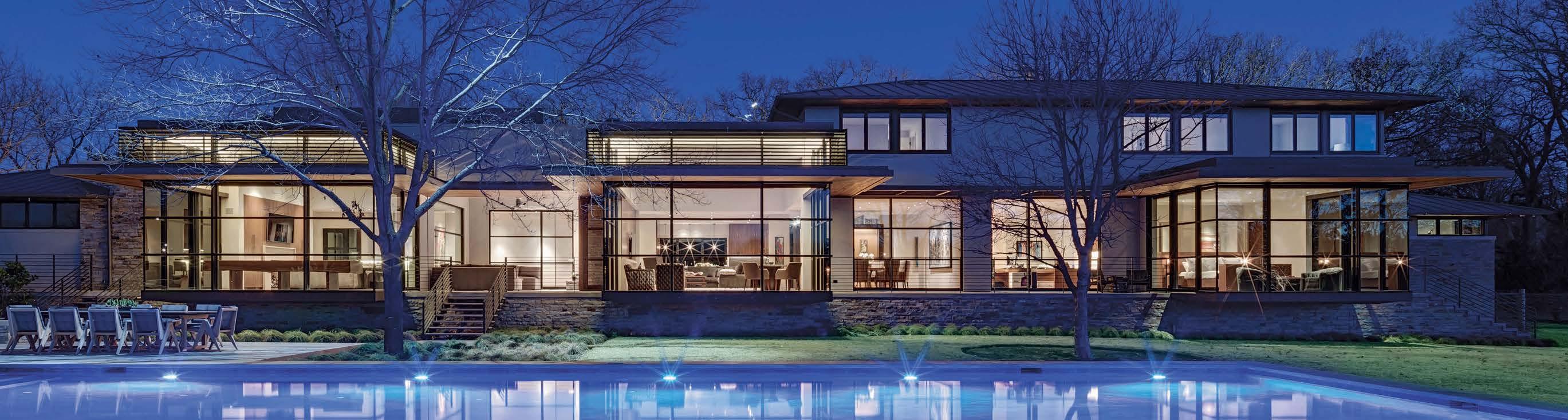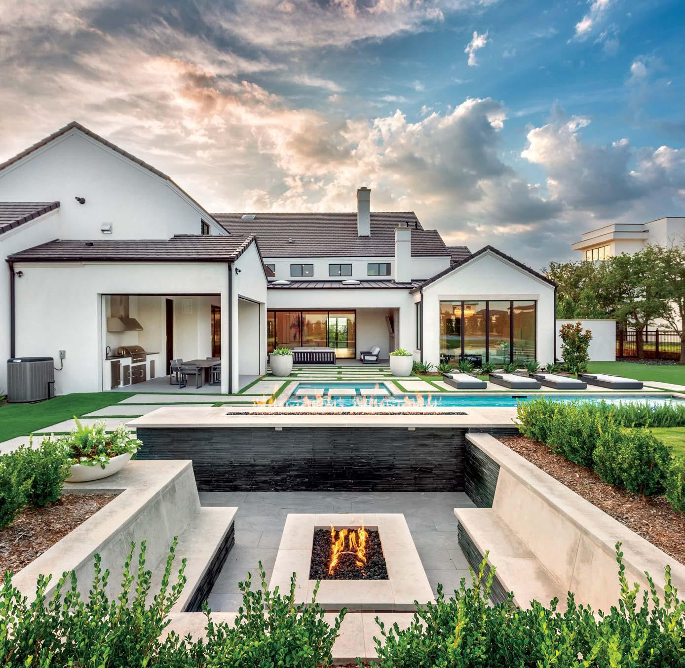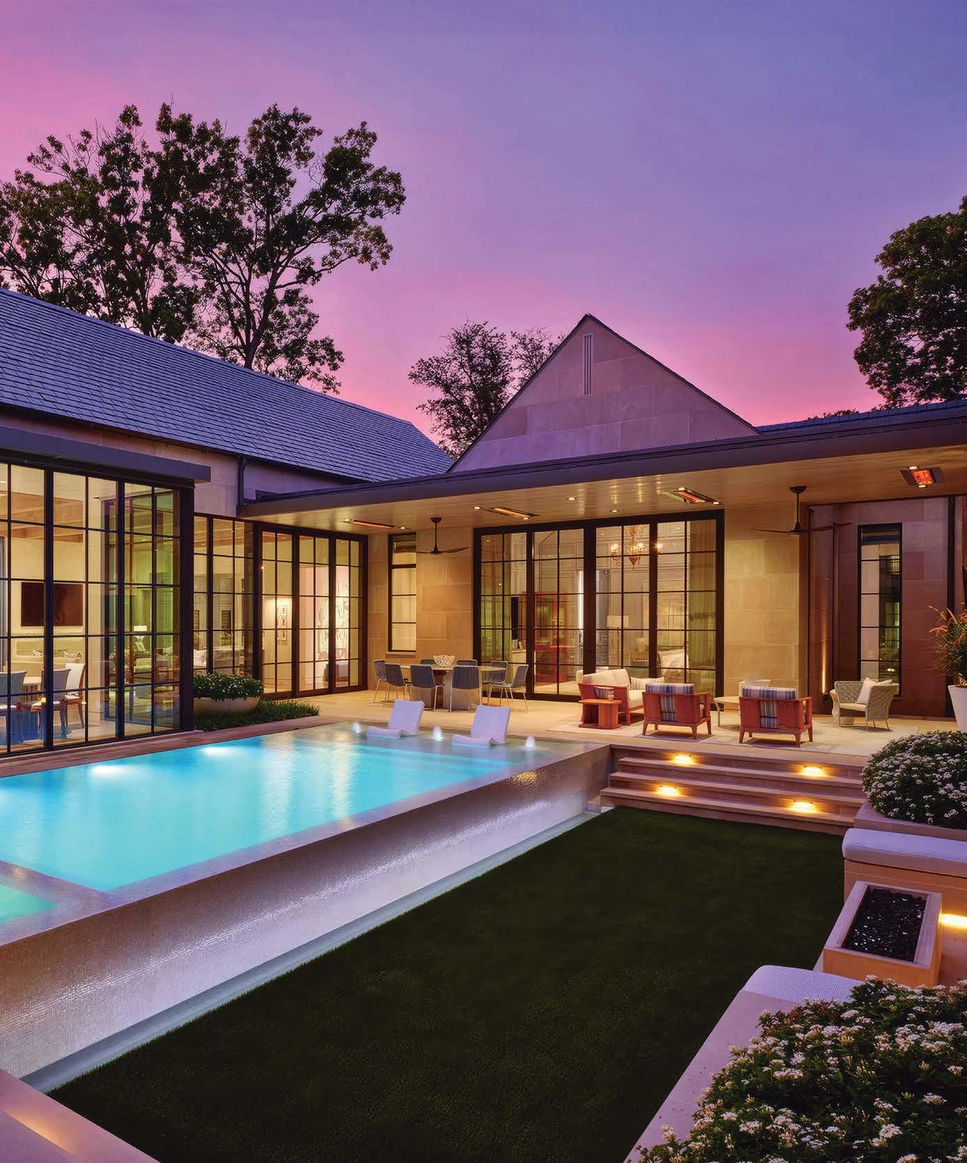Top This Highland Park home on Beverly Drive was designed by architecture firm smitharc. Left A Nakoma Drive backyard in Greenway Parks stuns at sunset. Right The spacious interior hallway is from a home on Northaven Road designed by David Webster George. Opposite left The definition of curb appeal, this majestic home in Devonshire was designed by Paul Turney. Opposite right The backyard of a Woodland Drive home in Preston Hollow offers lots of different environments for entertaining.
