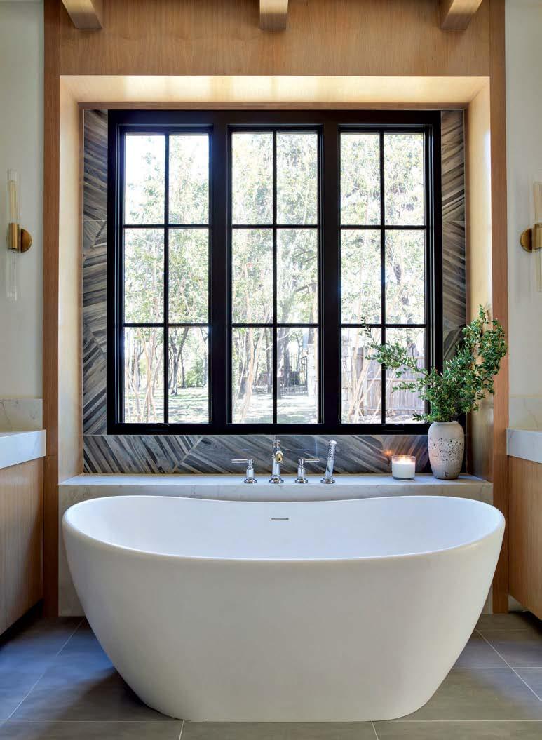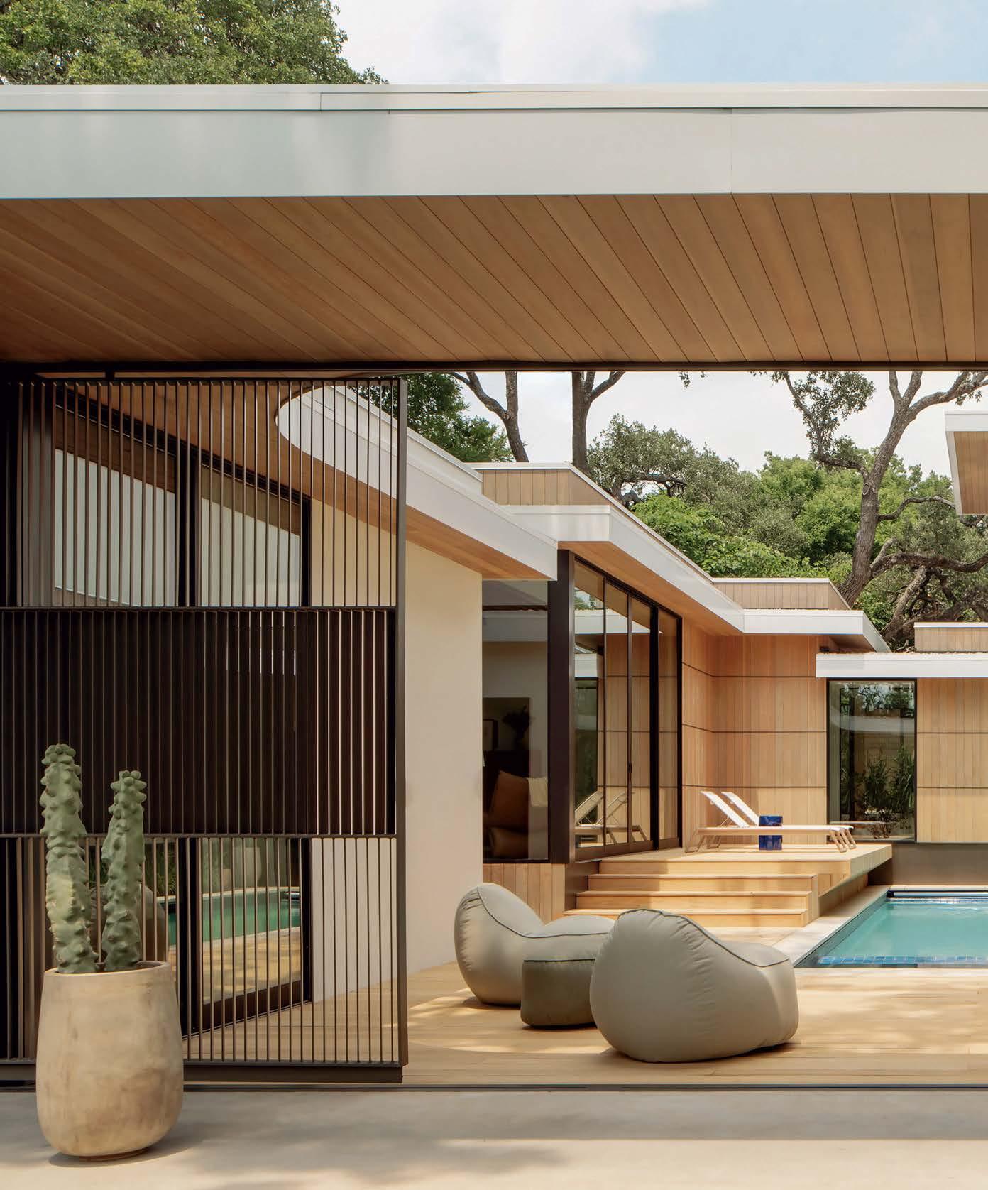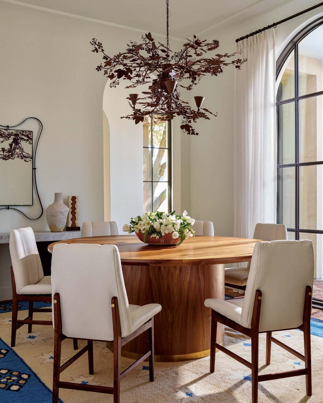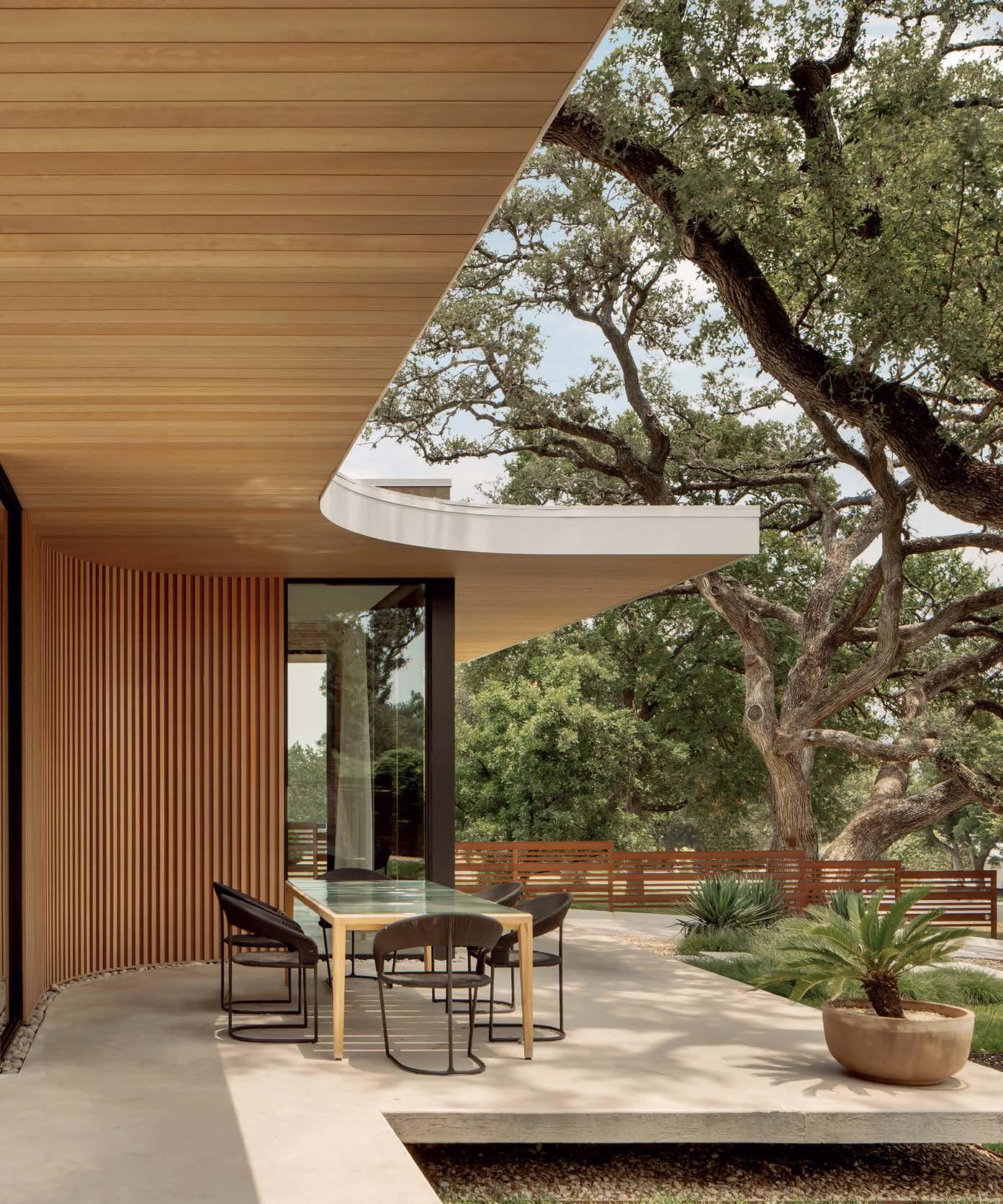Key for Tucker, who worked with associates Anna Henry and Rebecca Brown on the home, was creating an arc of time. The team sourced design classics, such as a vintage Torbjørn Afdal lounge chair in the living room and contemporary editions of a 1950s Pierre Jeanneret chair for the dining room. “The clients wanted comfortable but great-looking pieces, and they were interested in acquiring things with history—they weren’t afraid of patina,” the designer remembers. In their bedroom, she paired a vintage leather chaise with a round painting by British artist Tahnee Lonsdale, which hangs on a drapery-covered wall for an unexpected backdrop. “I like a little surprise, something that engages the eye,” Tucker adds. Another important factor was creating exibility within the home. “Some spaces are uid, with multiple functions, while others are programmed for a speci c use, like the meditation room and a casita dedicated as the wife’s office,” the designer describes. “Having to leave the main house for the office creates a good mental shift in the day.” It also provides an opportunity to commune with nature. “The less ‘designing’ we do, the less damage we do,” landscape designer Brian Pearson says of his hands-off approach. “And because there’s a great microclimate under the oaks, we left the original lawn. It even survives summers without irrigation.” Pearson augmented the existing greenery with yuccas and grasses for softness and added Hill Country river rock for contrast. “It’s the oaks that really matter here— everything is subservient to them,” he says.