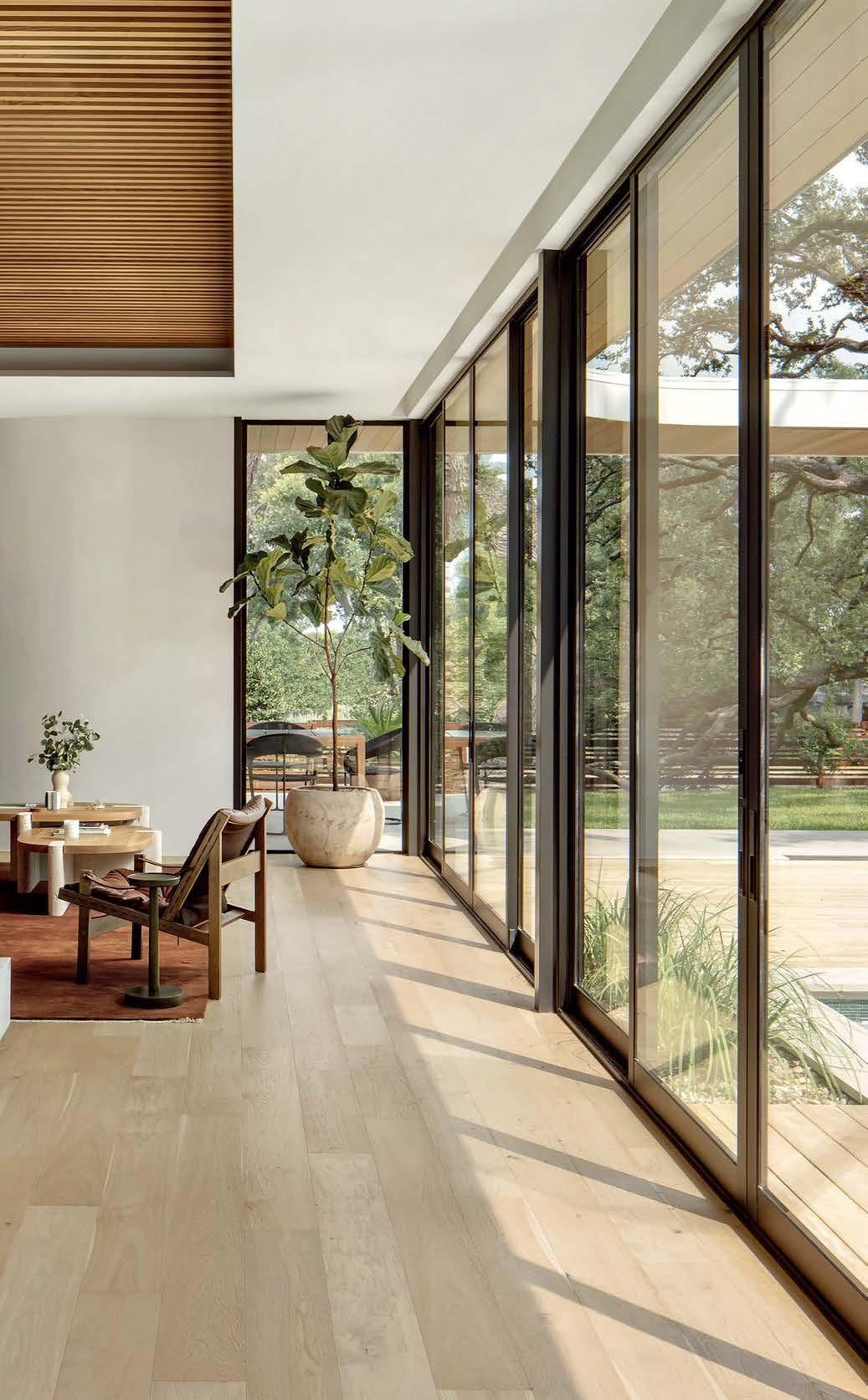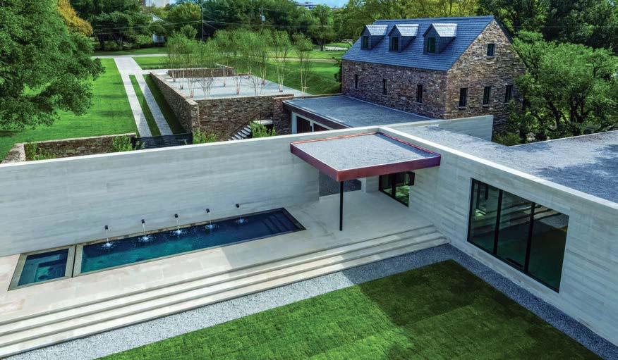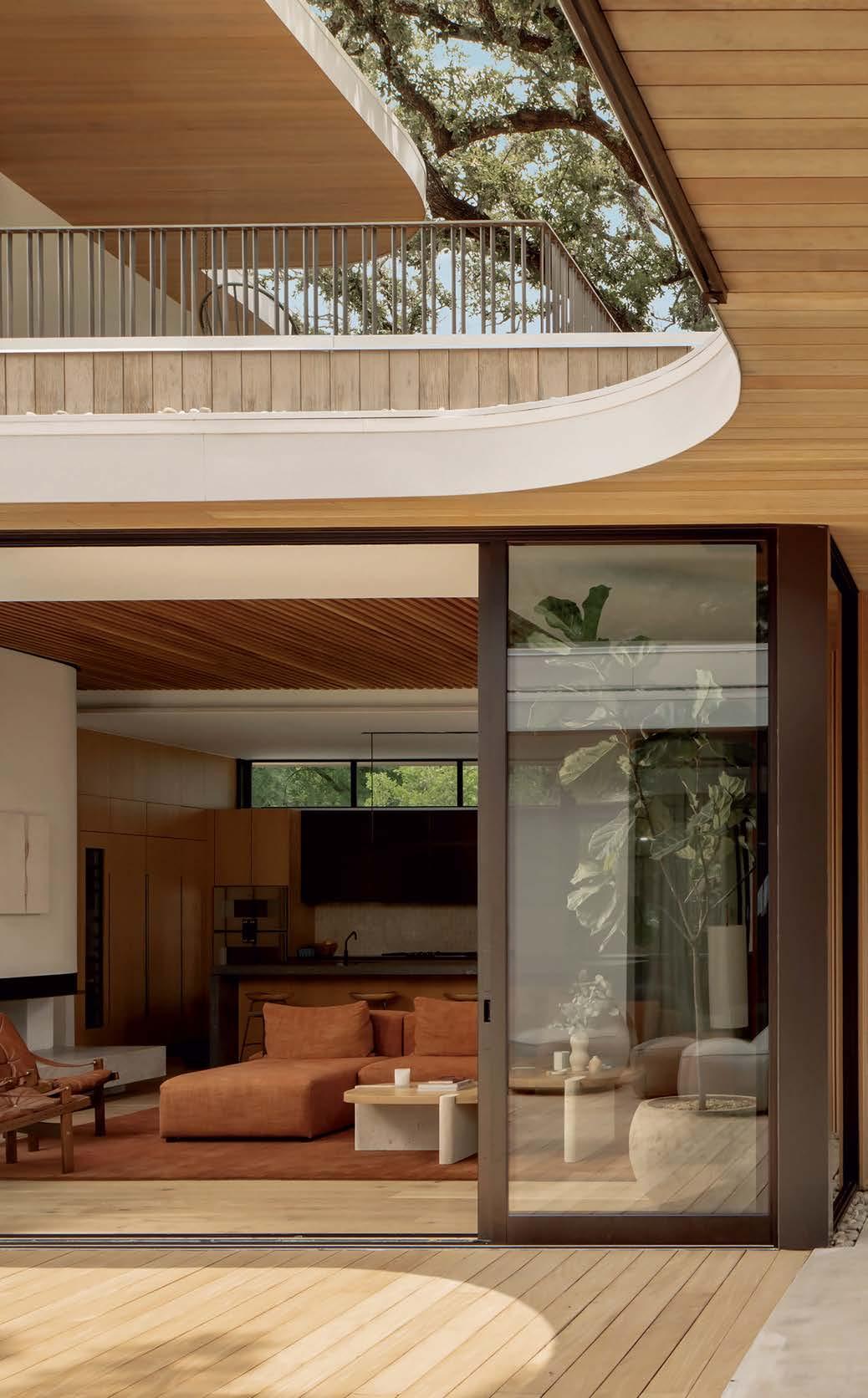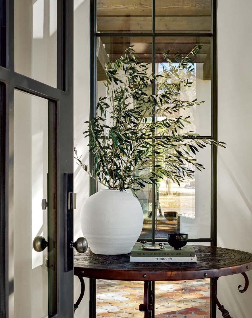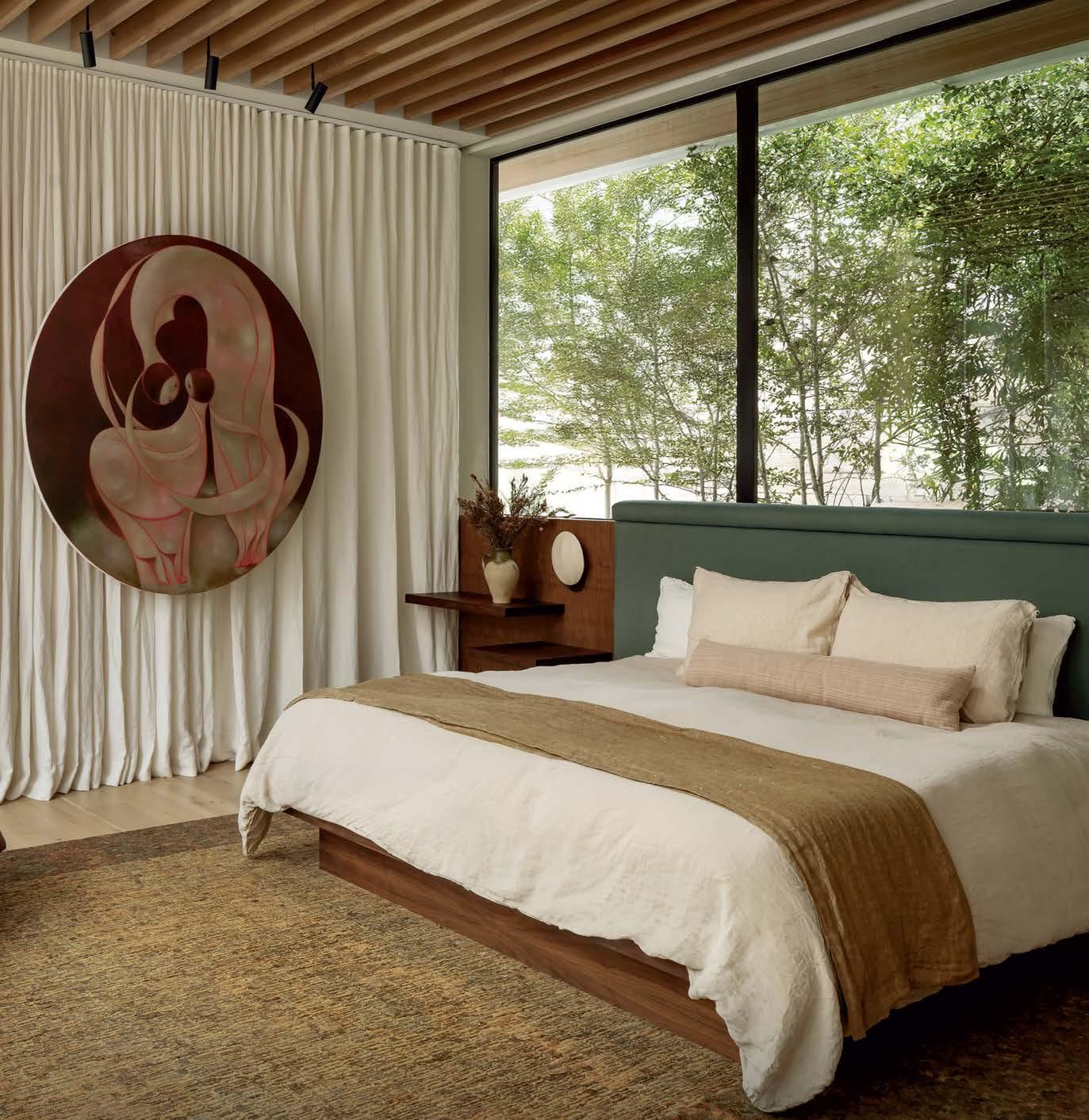 Key for Tucker, who worked with associates Anna Henry and Rebecca Brown on the home, was creating an arc of time. The team sourced design classics, such as a vintage Torbjørn Afdal lounge chair in the living room and contemporary editions of a 1950s Pierre Jeanneret chair for the dining room. “The clients wanted comfortable but great-looking pieces, and they were interested in acquiring things with history—they weren’t afraid of patina,” the designer remembers. In their bedroom, she paired a vintage leather chaise with a round painting by British artist Tahnee Lonsdale, which hangs on a drapery-covered wall for an unexpected backdrop. “I like a little surprise, something that engages the eye,” Tucker adds. Another important factor was creating exibility within the home. “Some spaces are uid, with multiple functions, while others are programmed for a speci c use, like the meditation room and a casita dedicated as the wife’s office,” the designer describes. “Having to leave the main house for the office creates a good mental shift in the day.” It also provides an opportunity to commune with nature. “The less ‘designing’ we do, the less damage we do,” landscape designer Brian Pearson says of his hands-off approach. “And because there’s a great microclimate under the oaks, we left the original lawn. It even survives summers without irrigation.” Pearson augmented the existing greenery with yuccas and grasses for softness and added Hill Country river rock for contrast. “It’s the oaks that really matter here— everything is subservient to them,” he says.