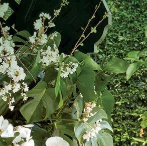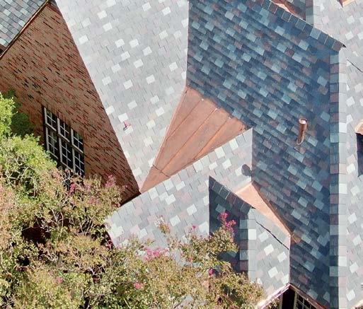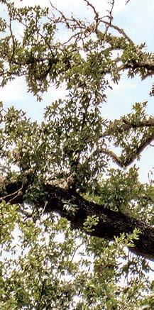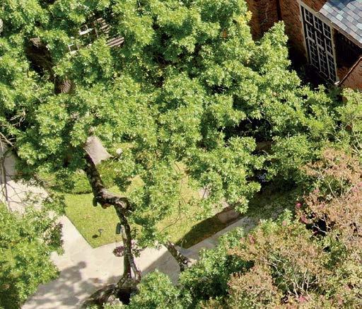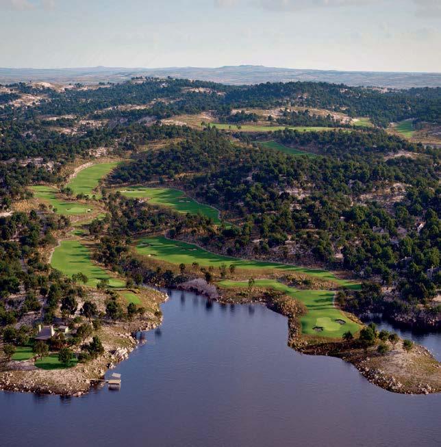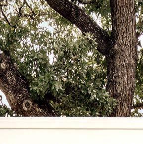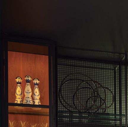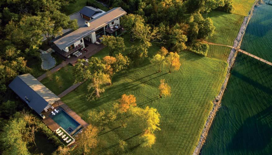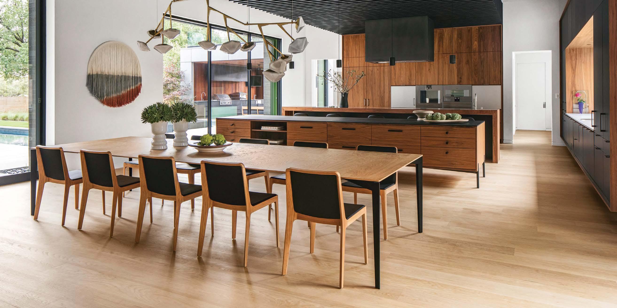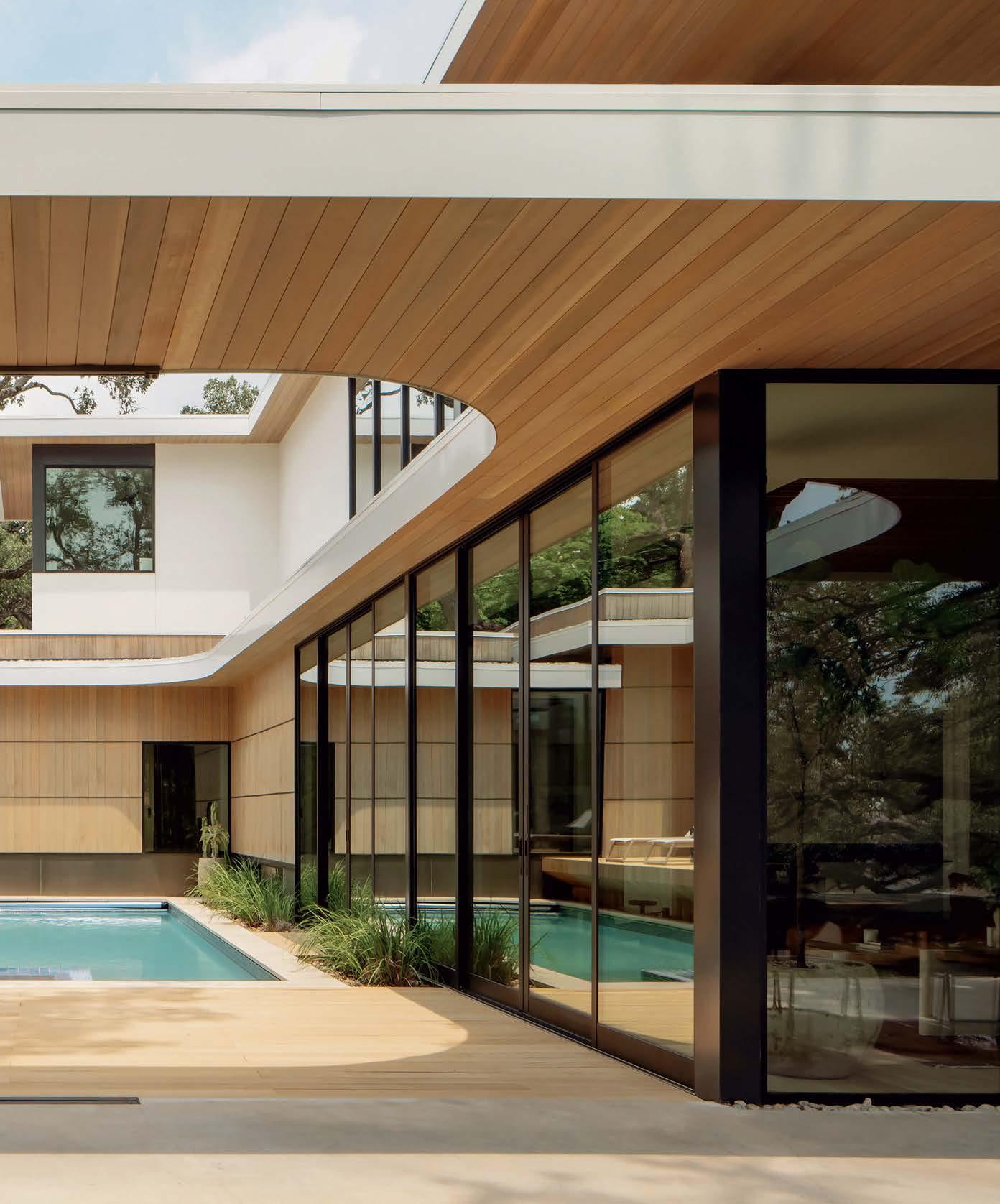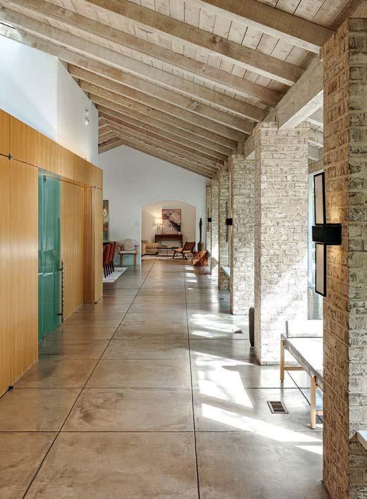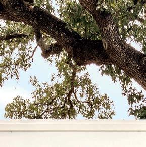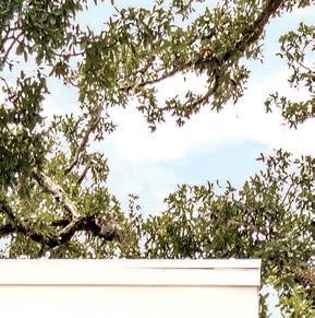 Key for Tucker, who worked with associates Anna Henry and Rebecca Brown on the home, was creating an arc of time. The team sourced design classics, such as a vintage Torbjørn Afdal lounge chair in the living room and contemporary editions of a 1950s Pierre Jeanneret chair for the dining room. “The clients wanted comfortable but great-looking pieces, and they were interested in acquiring things with history—they weren’t afraid of patina,” the designer remembers. In their bedroom, she paired a vintage leather chaise with a round painting by British artist Tahnee Lonsdale, which hangs on a drapery-covered wall for an unexpected backdrop. “I like a little surprise, something that engages the eye,” Tucker adds. Another important factor was creating exibility within the home. “Some spaces are uid, with multiple functions, while others are programmed for a speci c use, like the meditation room and a casita dedicated as the wife’s office,” the designer describes. “Having to leave the main house for the office creates a good mental shift in the day.” It also provides an opportunity to commune with nature. “The less ‘designing’ we do, the less damage we do,” landscape designer Brian Pearson says of his hands-off approach. “And because there’s a great microclimate under the oaks, we left the original lawn. It even survives summers without irrigation.” Pearson augmented the existing greenery with yuccas and grasses for softness and added Hill Country river rock for contrast. “It’s the oaks that really matter here— everything is subservient to them,” he says.