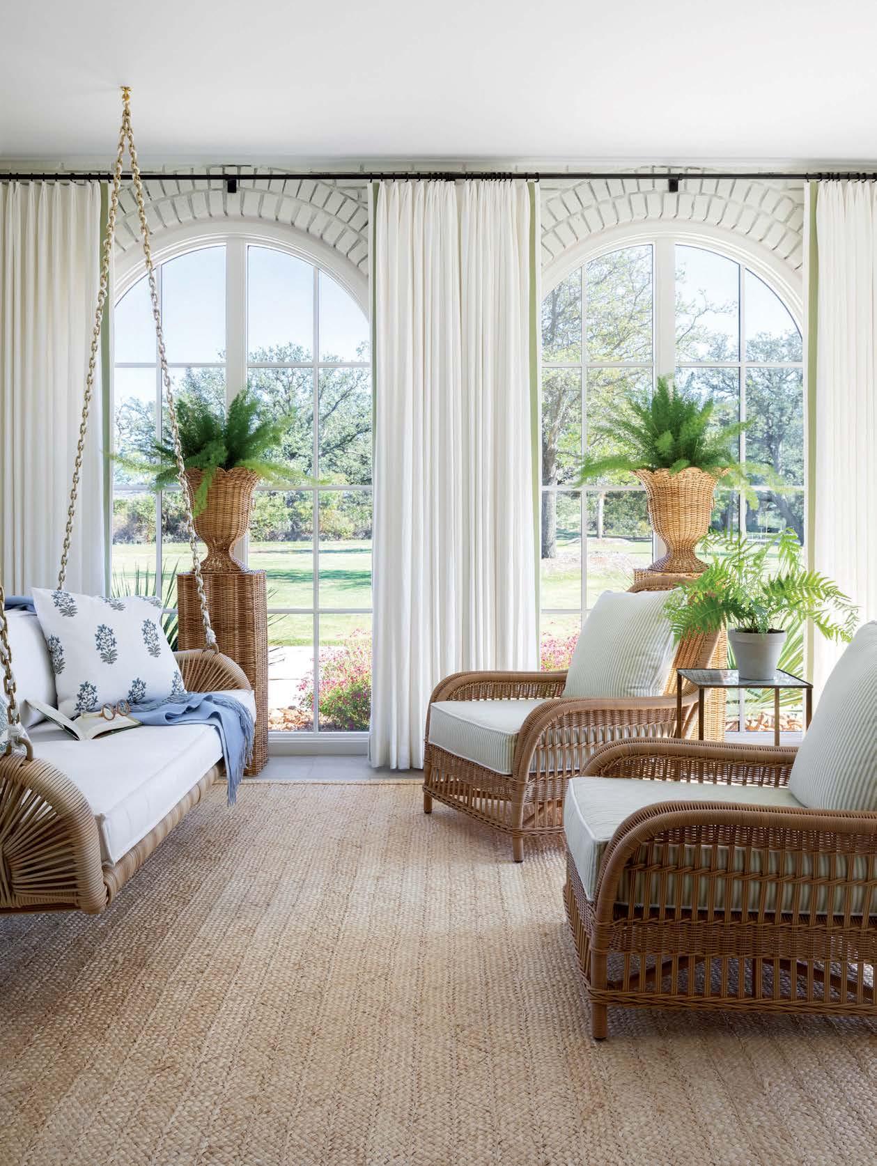 Nearby, the team also transformed a former porte cochere into a bright sun room. The original arched doorways were filled with windows, and an ivory paint was applied to the original brick. The space was filled with natural materials, as in the jute rug, wicker chairs and a swinging sofa.