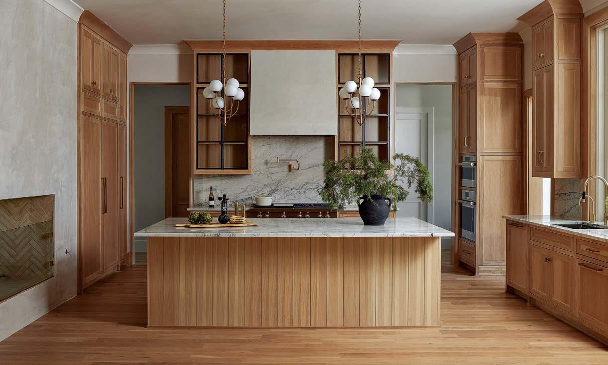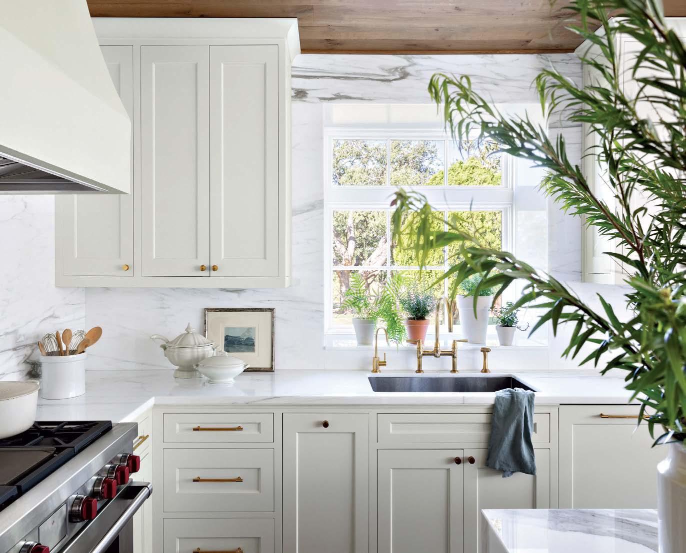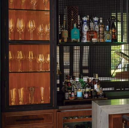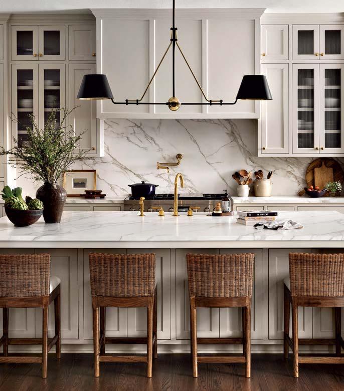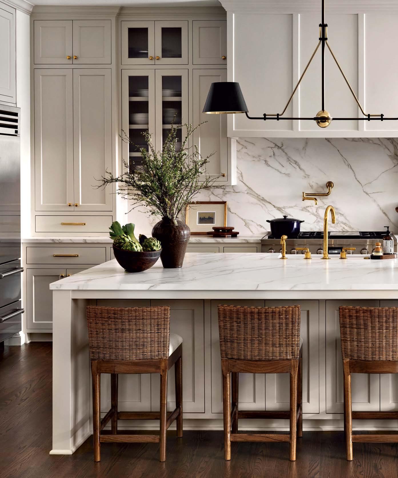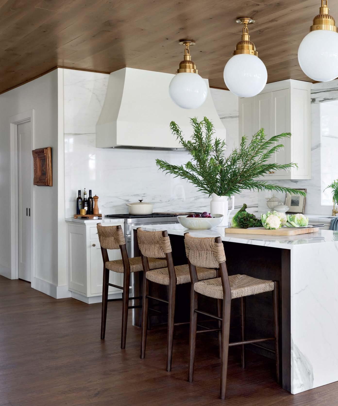 it because so much more entertaining happens in the kitchen these days,” he says of the formerly small and dim area. New windows were added, and the room was expanded to include a sunny dining space. “It was envisioned like a conservatory, with a lot of glass to bring light in,” he adds. Daintily gold-veined marble on the counters amplifies the natural illumination, continuing as a backsplash all the way to the rich wood ceiling. Vintage-inspired pendants over the island further nod to the property’s history, offset by a long and linear pendant above the table.