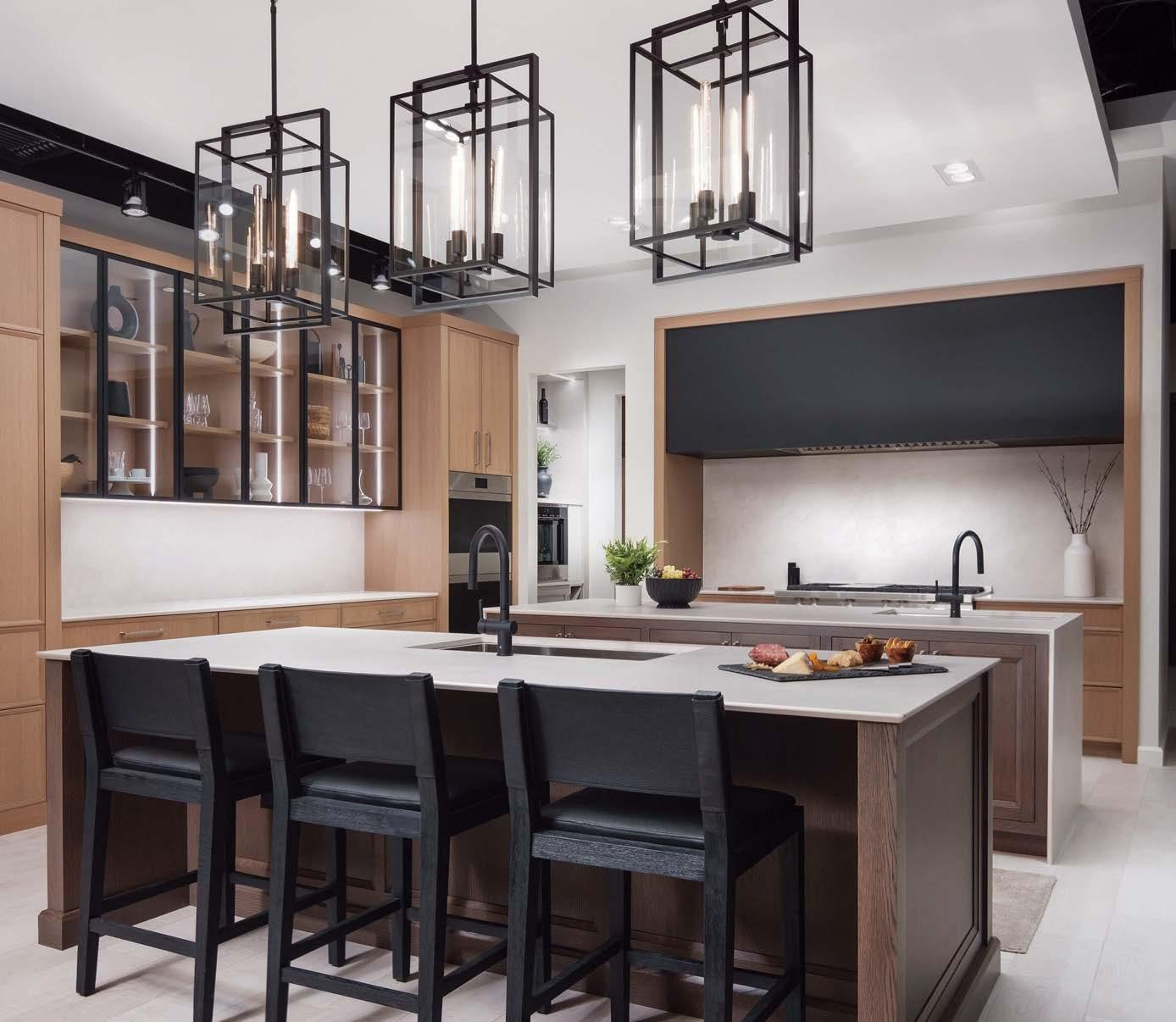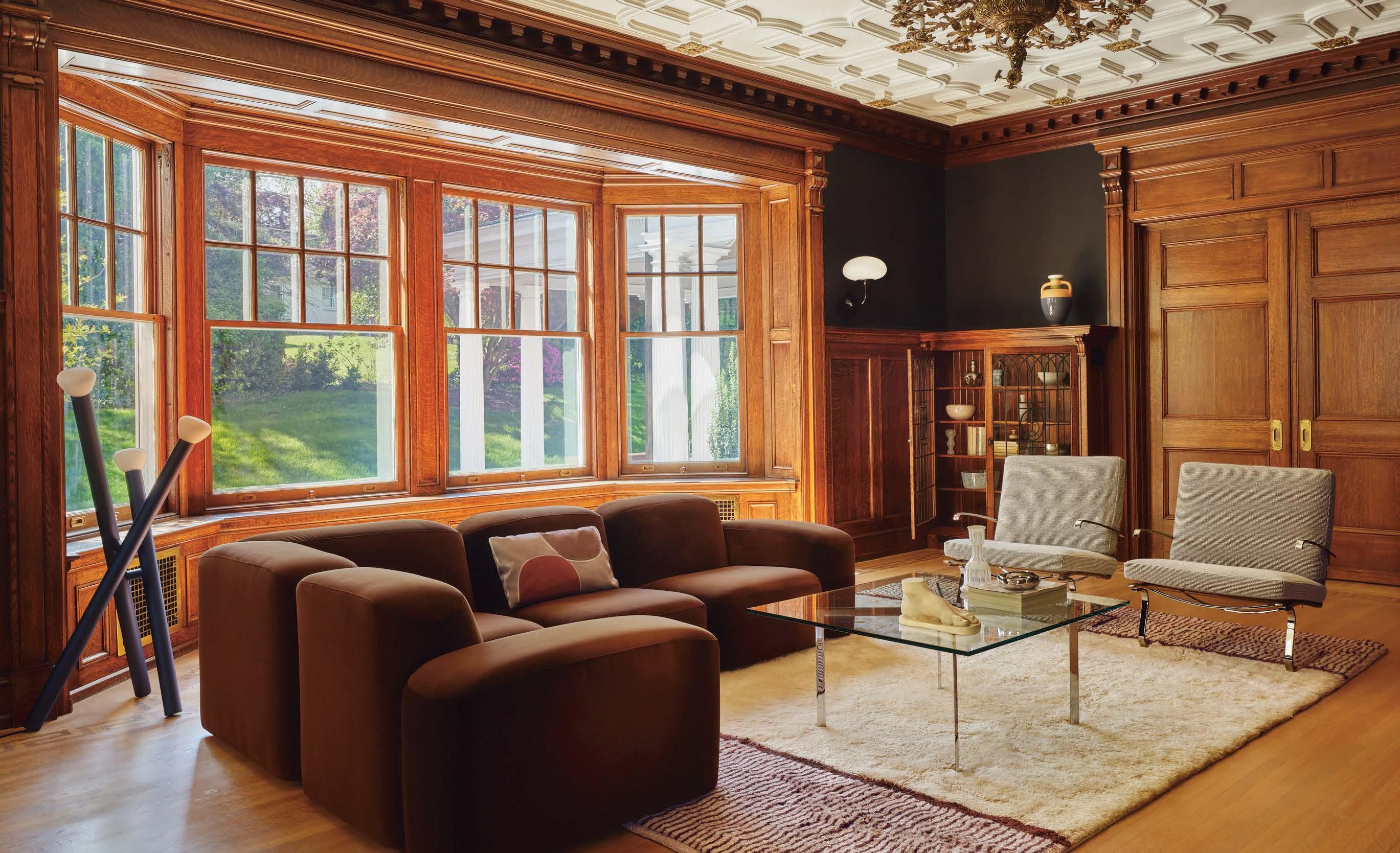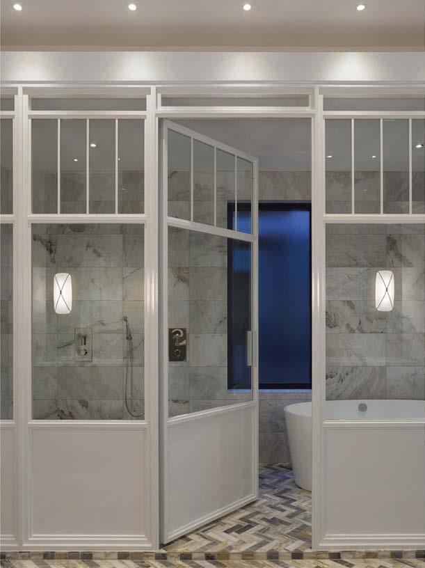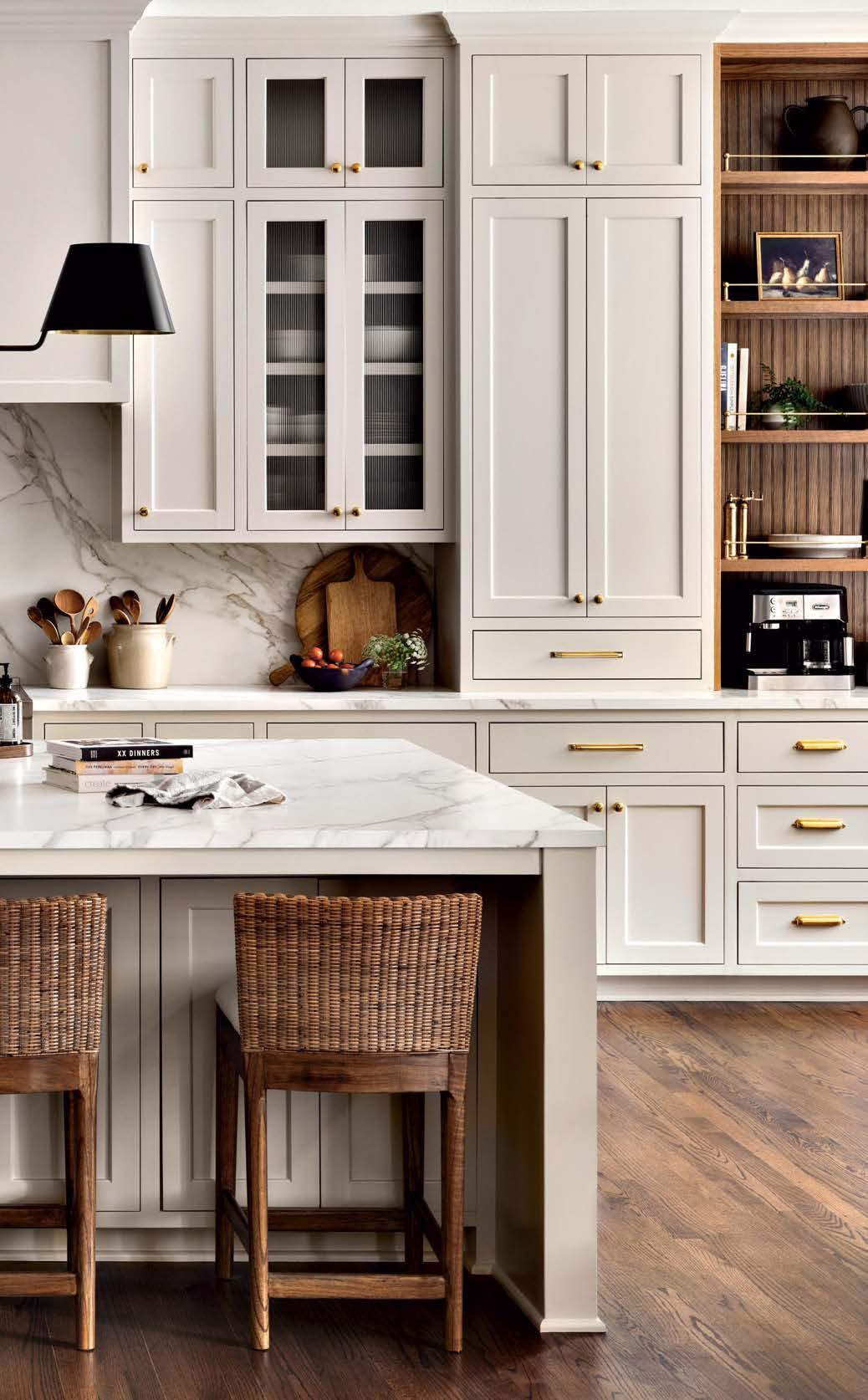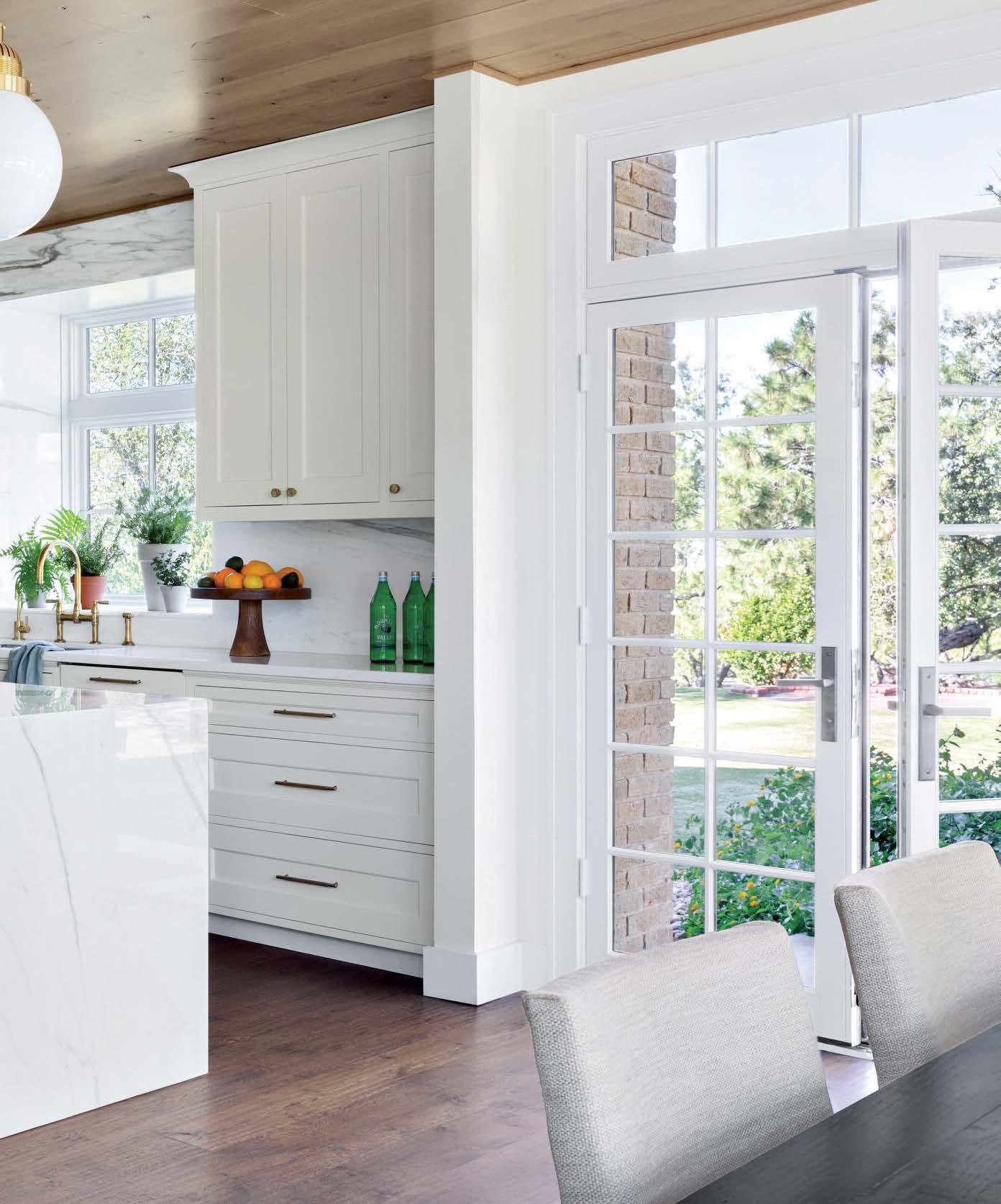 it because so much more entertaining happens in the kitchen these days,” he says of the formerly small and dim area. New windows were added, and the room was expanded to include a sunny dining space. “It was envisioned like a conservatory, with a lot of glass to bring light in,” he adds. Daintily gold-veined marble on the counters amplifies the natural illumination, continuing as a backsplash all the way to the rich wood ceiling. Vintage-inspired pendants over the island further nod to the property’s history, offset by a long and linear pendant above the table.