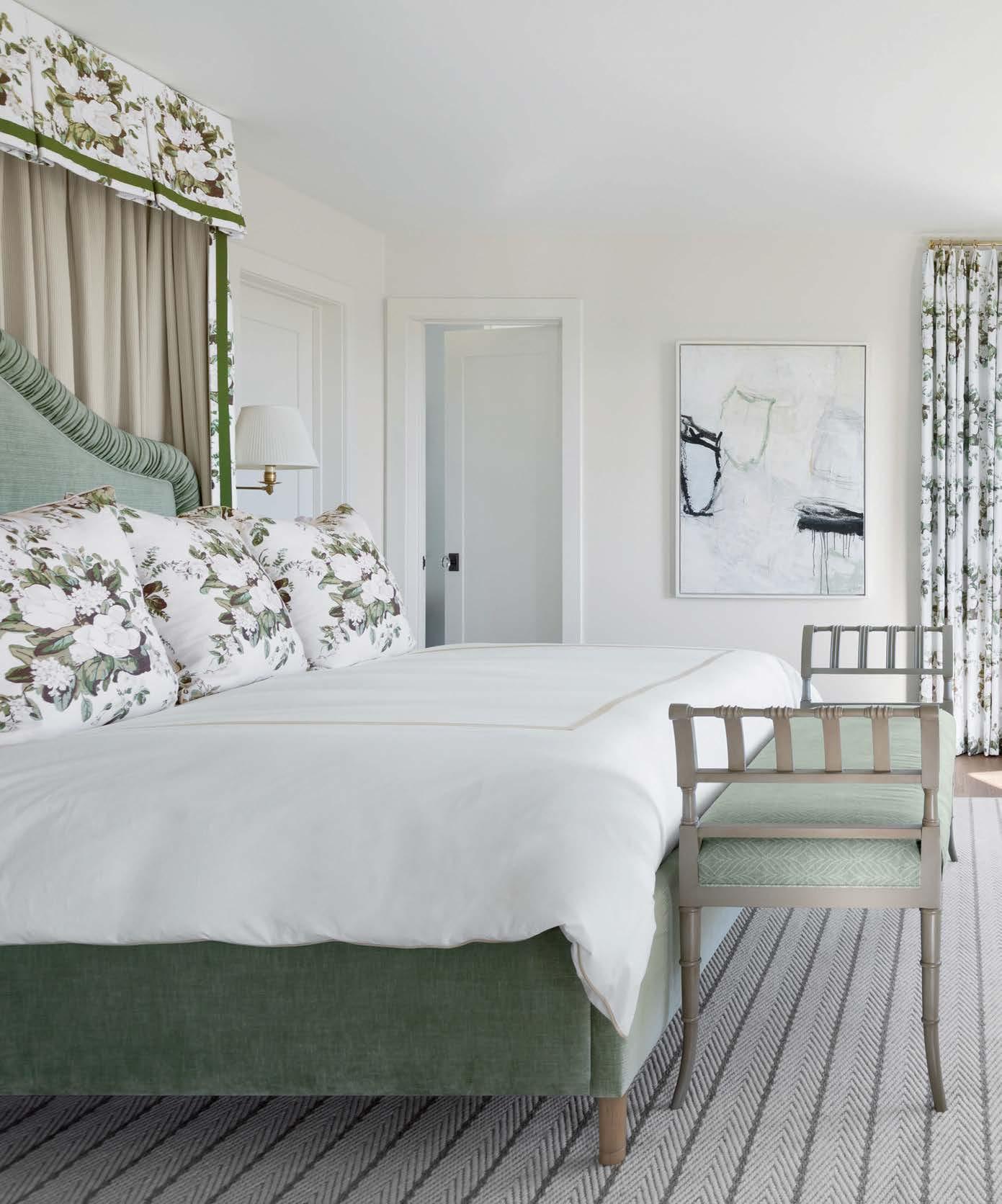 To inject a sense of grandeur to the primary bedroom, a custom canopied bed in Venetian velvet is swathed in Matouk bedding. Lee Jofa’s Aurora fabric by Paolo Moschino forms the cornice, pillows and draperies, accompanied by two tufted armchairs by Mr. and Mrs. Howard for Sherrill Furniture.