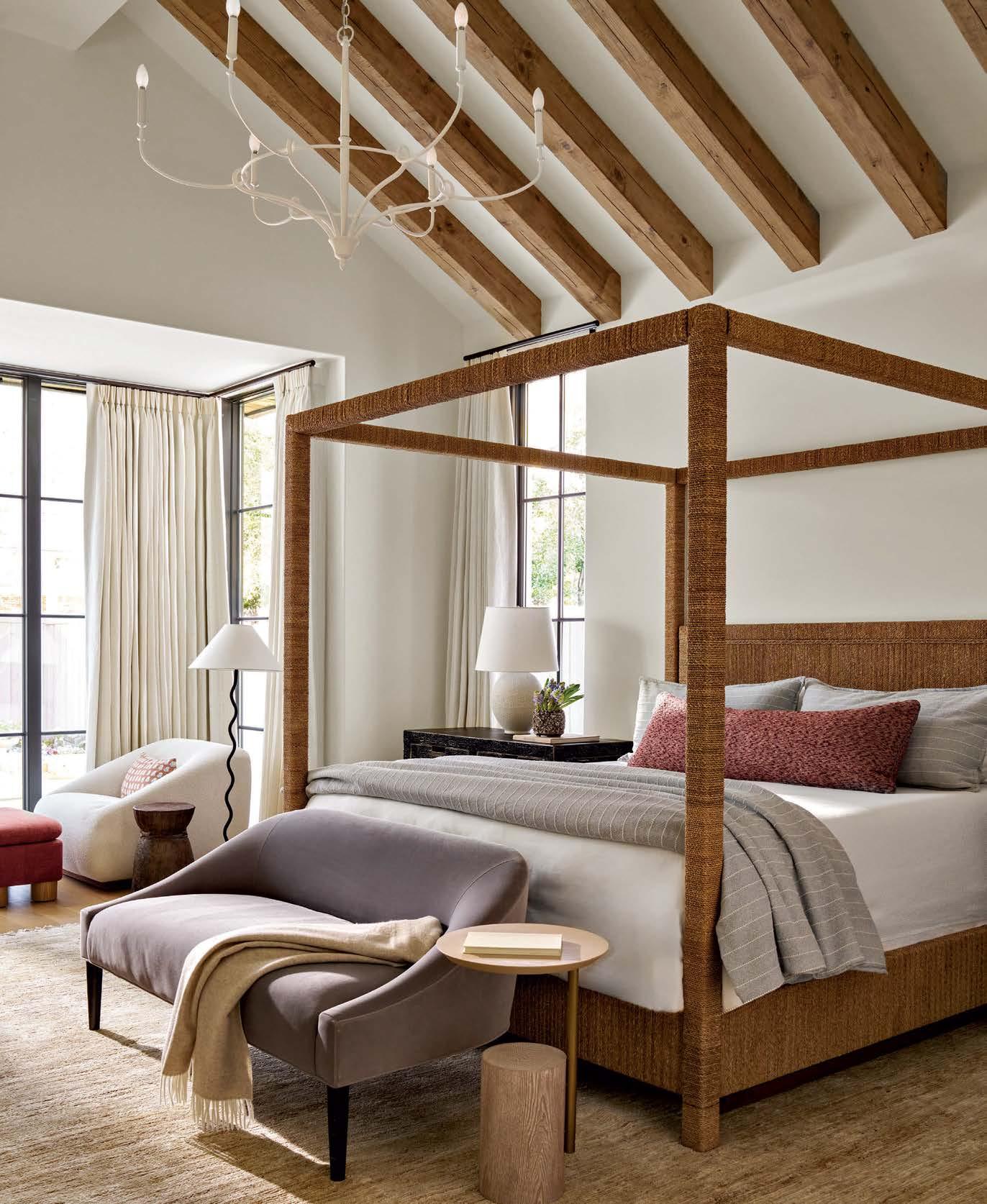 While referencing the owners’ past, the designer frequently straddled her gaze on the future. The balance is evident in the curation of new pieces, which interpret traditional textures in fresh ways. Familiar Spanish Colonial Revival features like wood and wicker brought weighted heft to the otherwise streamlined furniture, weaving through the main gathering area’s deep-seated sofas, broadarmed chairs and pedestal tables as well as the couple’s jute-wrapped four-poster bed. The rugs, upholstery and gauzy drapes preserved the neutral tones of the surrounding materials. “We took that terra-cotta base and added soothing whites, oatmeals and earthy greens,” Sander points out.