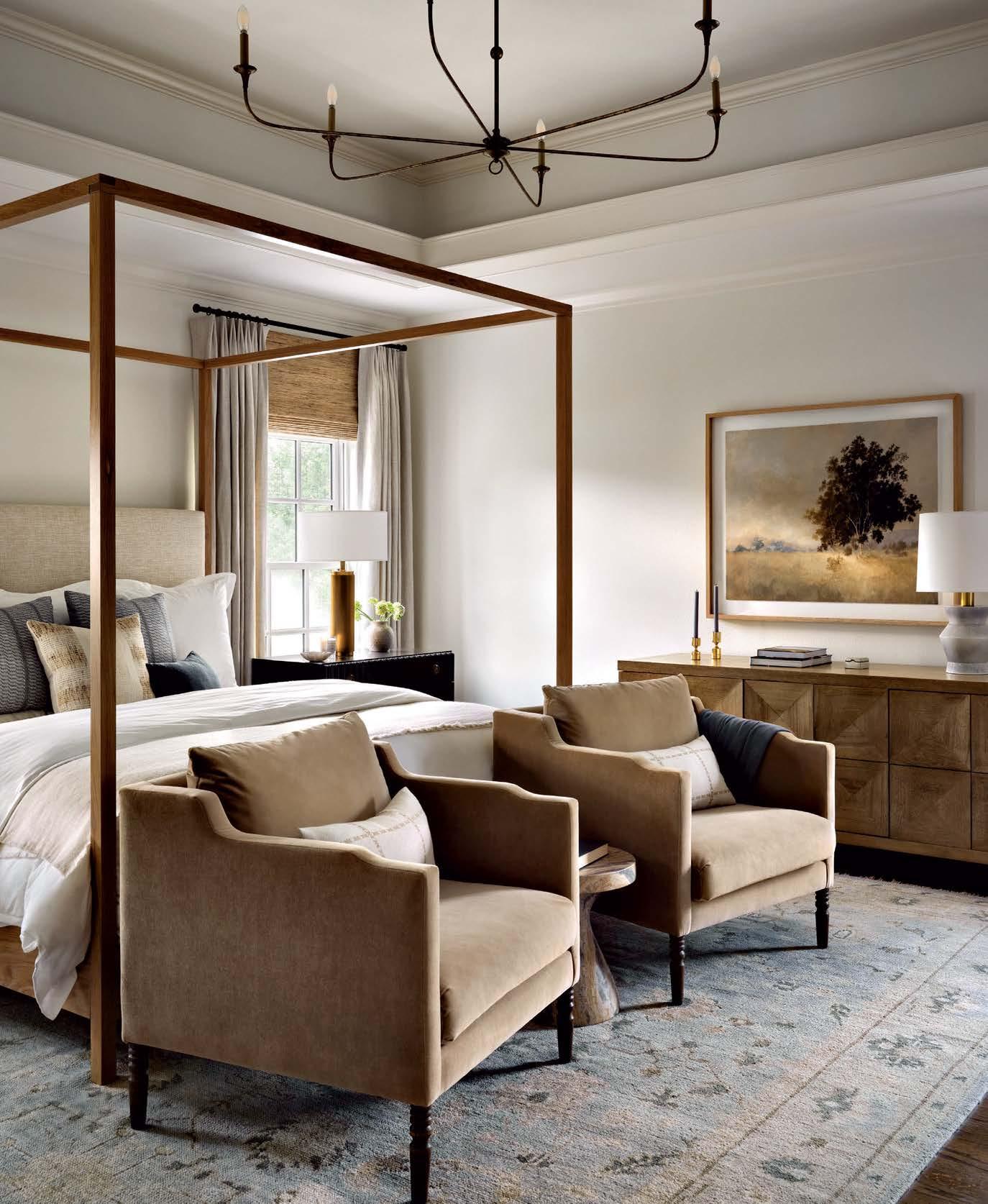 Opposite: A bespoke oak canopy bed by Community MFG is the focal point of the primary bedroom. Velvet lounge chairs by McGee & Co. flank an Arteriors table at the foot of the bed. The vintage-inspired floor covering is by Loloi Rugs.