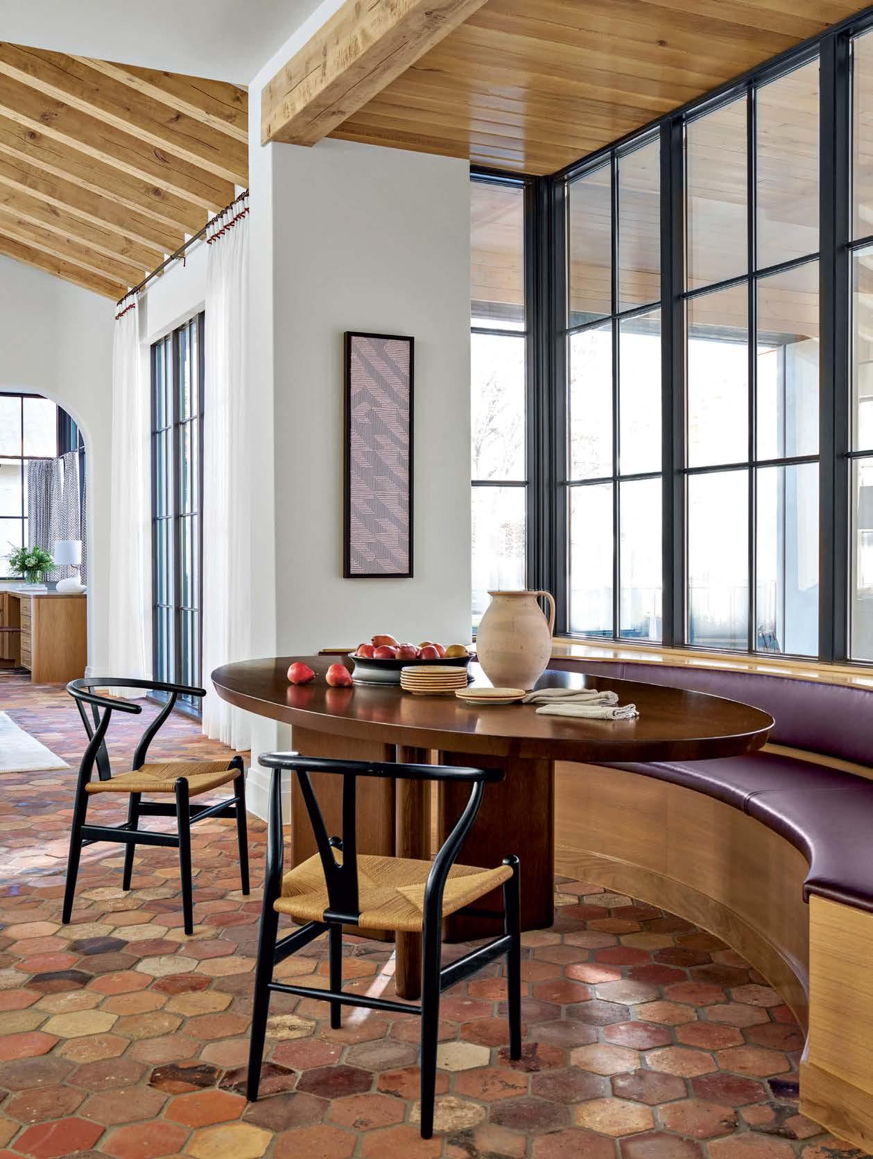 Opposite: Made for intimate family dining, the curved breakfast banquette wears a lush Fabricut leather by Perez Custom Upholstery. An oval wood table from David W. Gilbert & Associates’ The Sheffield Collection and a pair of classic wishbone chairs complete the cozy nook.