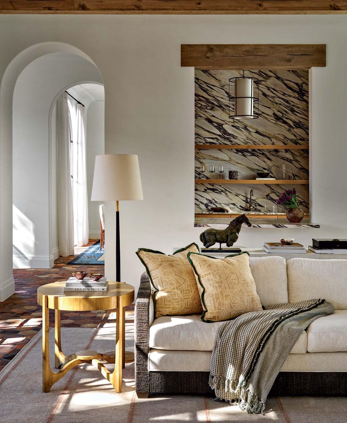 Opposite: Organic hues and textures infuse the living room with warmth, from the ropedtrim Palecek sofa to the hand-loomed flat-weave rug. Behind, a shaded George Cameron Nash lantern illuminates the bar alcove lined in Calacatta Viola marble.