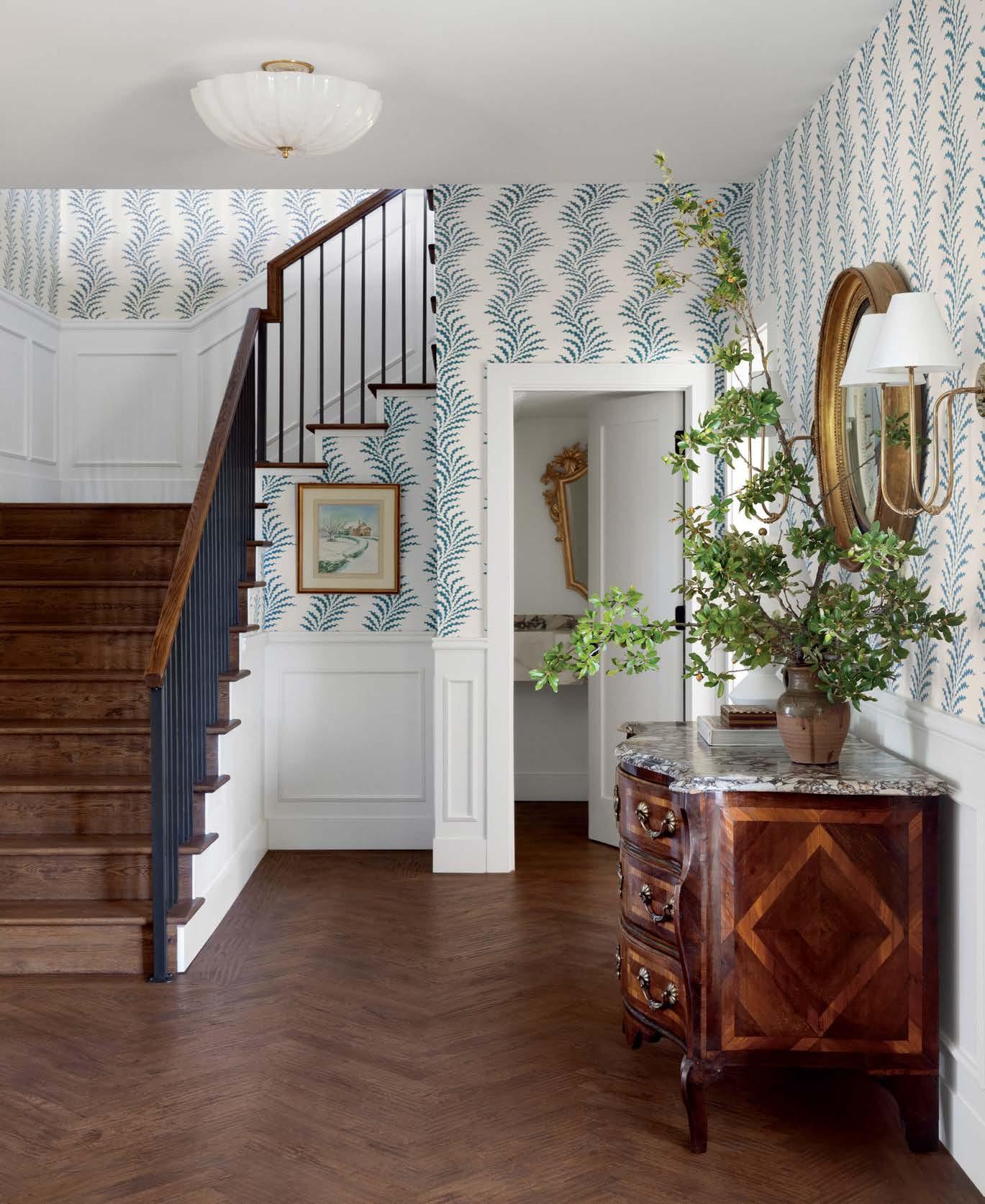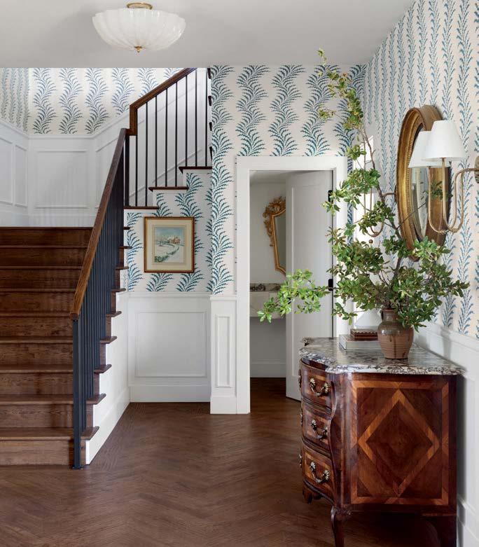 Enter designer Paloma Contreras. “The client really wanted to give this house new life,” she recalls. While keeping the historical façade intact, the interiors were taken down to the studs. “I tried to imagine who her grandmother would be and how she would want her home designed if she were a young woman today,” Contreras says. The designer and her team started by reworking the layout. In the entry, they expanded and widened the foyer and stair hall, then added a white-and-blue leafy scrolling wallpaper that climbs the walls to the second level. The entry’s wood floors were laid in a herringbone pattern to contrast the adjoining rooms while still making it feel like its own space.