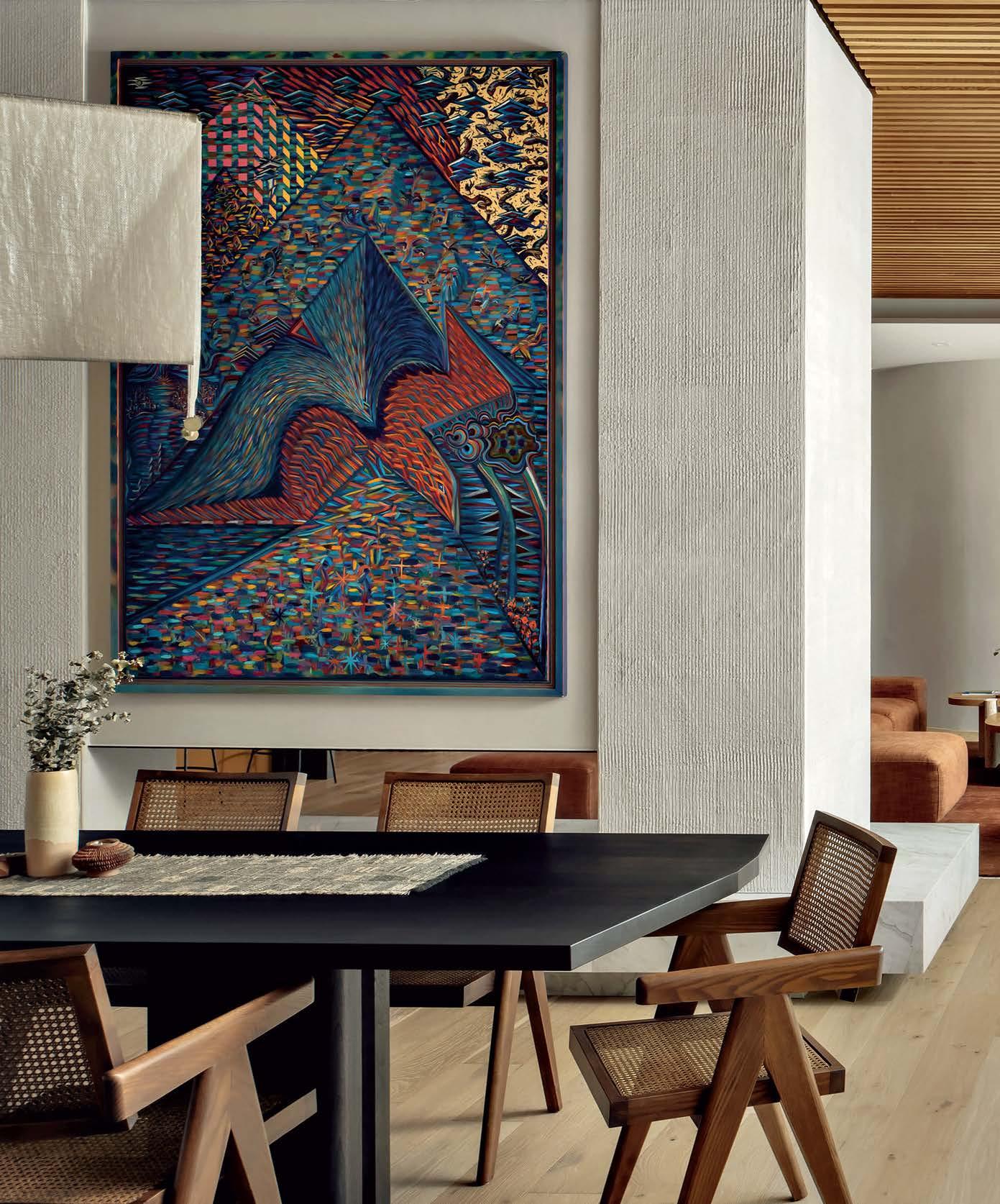 dining room. The Pierre Jeanneret-style chairs are from 1stdibs, where the chandelier— a vintage piece by Pier Giacomo Castiglioni for Flos—was also sourced. The Zach Harris painting was found through Perrotin.
