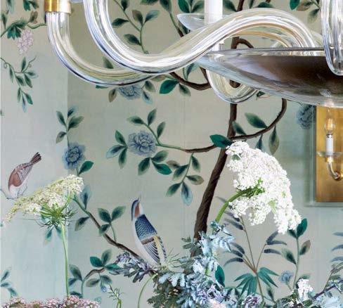 Previous page: De Gournay’s Nordic Garden wallpaper creates an elegant backdrop for the dining room, embellished with Paloma Contreras’ Brigitte chandelier from Visual Comfort & Co. Custom leather chairs by House + Town surround the bespoke table from Neal & Co.