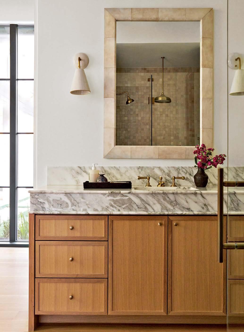 Left: In the primary bathroom, the bespoke vanity features rift white oak millwork and an Arabescato Vagli marble countertop. Twin NPage Studio sconces flank the RH Lucien parchment mirror.