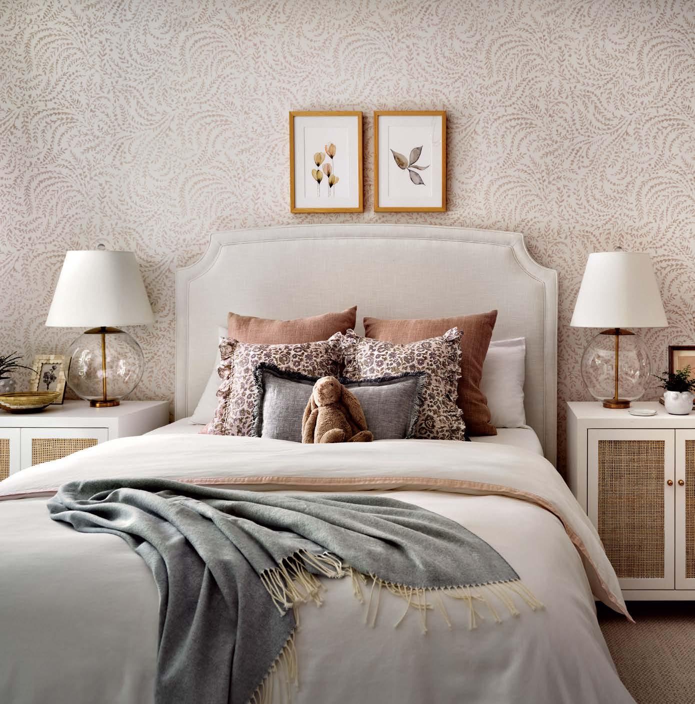 Opposite: The primary bedroom showcases a custom bed built by EMC Interiors with a headboard covered in a Designs of the Time fabric from Canvas Showroom.