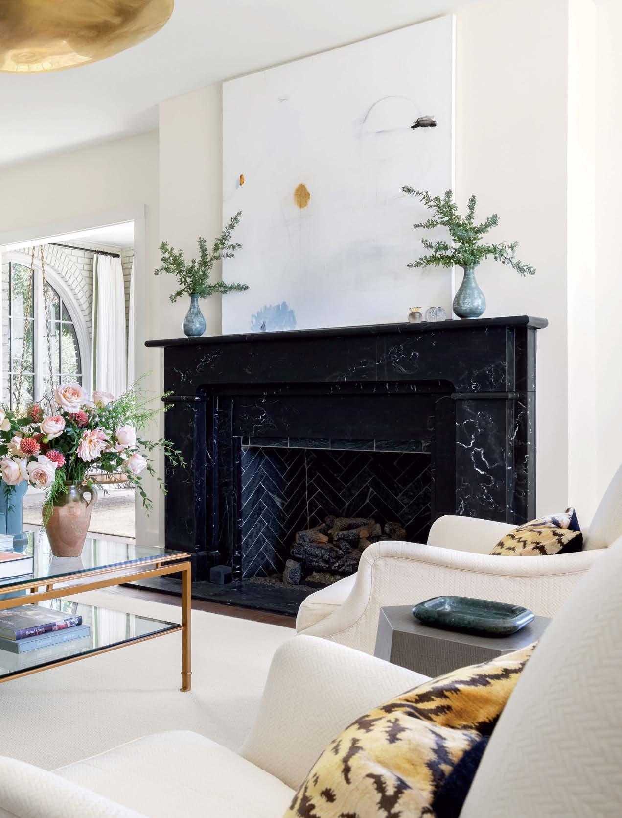 Denise McGaha’s Etienne fireplace in the living room offers mantel space for a painting by Chris Brandell. Carlos Moreno fabricated the custom skirted sofa, which wears a Kravet velvet. A Paloma Contreras chandelier hangs above the Montpelier cocktail table by Suzanne Kasler.