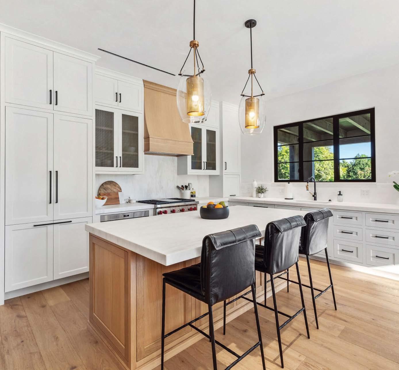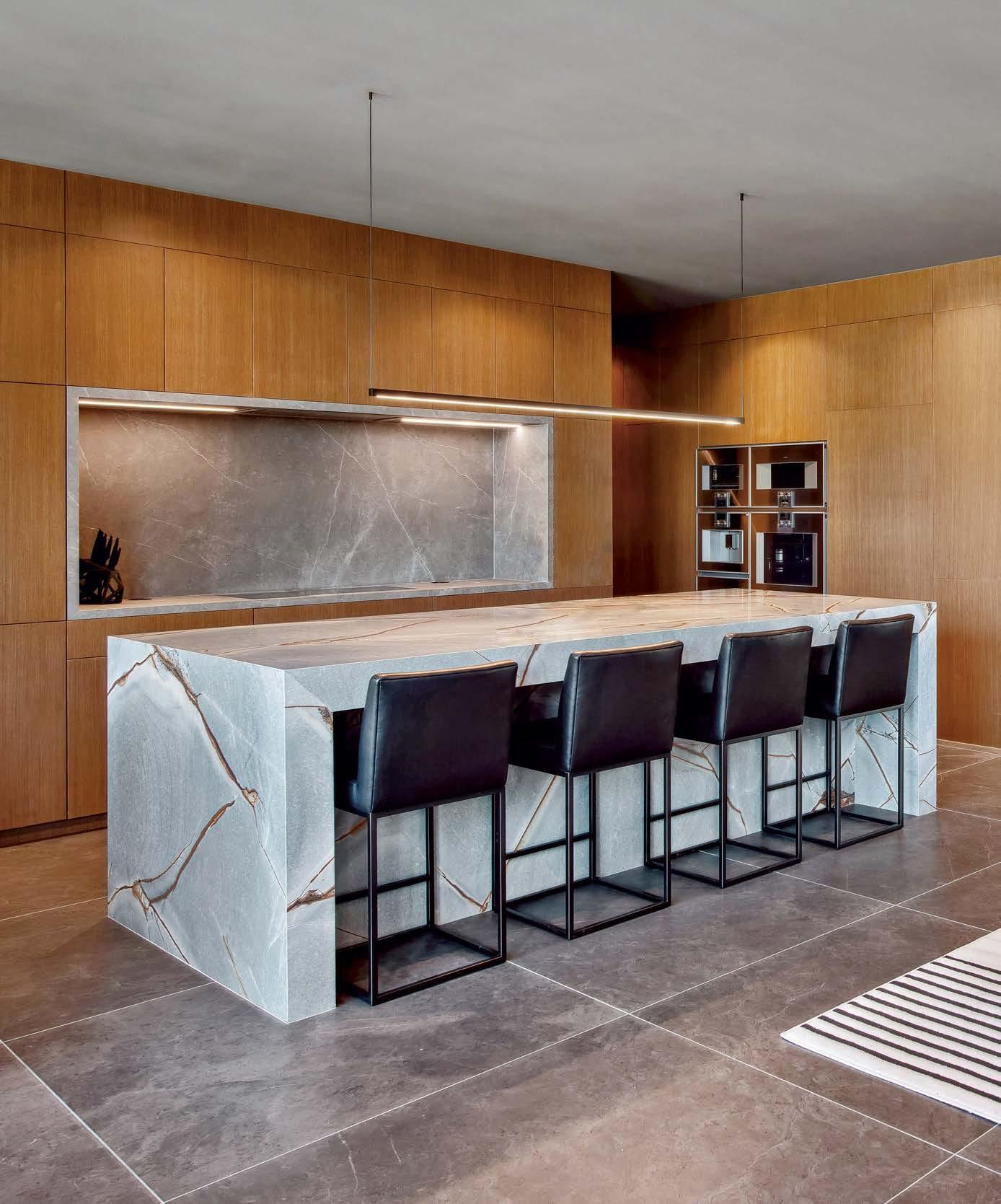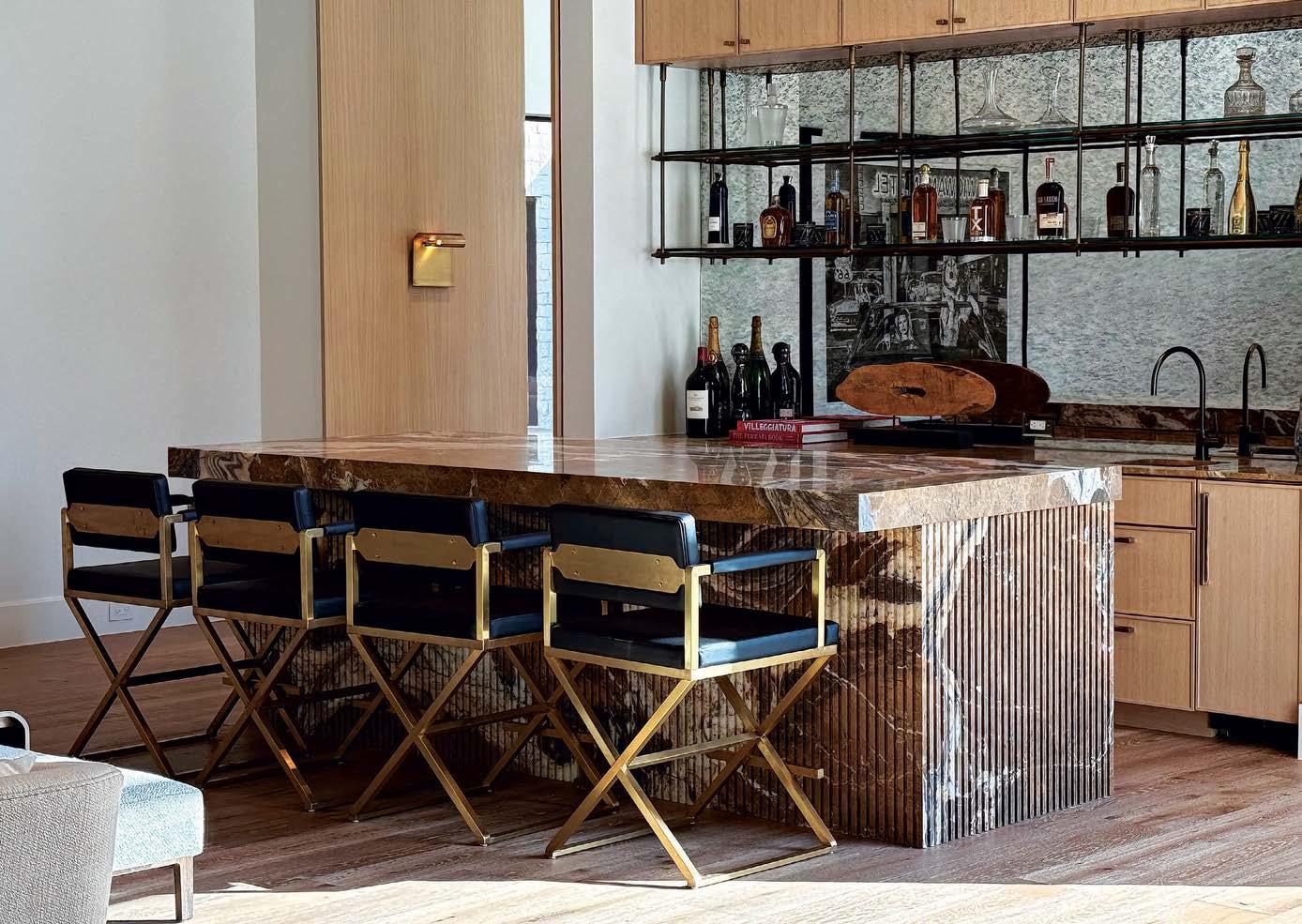 The kitchen’s custom cabinetry by Metroplex Cabinets complements the Neolith Calacatta Gold countertops and backsplash from Il Granito. Palecek stools cozy up to the 11-foot-long kitchen island, which is lit by a billiard pendant from The Urban Electric Co.