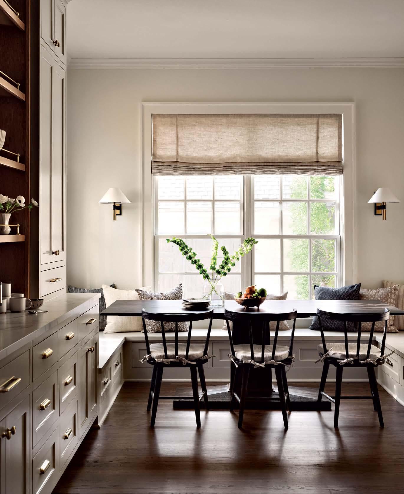 Opposite: In the breakfast nook, Christopher extended the kitchen cabinetry all the way to the U-shaped banquette. Lewis Windsor chairs from Four Hands line a custom oval pedestal table. Agnes sconces by The Urban Electric Co. illuminate the space.