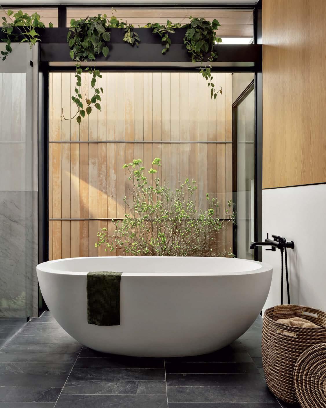 A Native Trails tub anchors the primary bathroom paired with a filler and hand shower from Waterworks. Slate flooring from clé completes the scene.