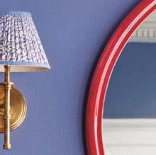 In the entry, walls are clad in an azure scrolling fern wallpaper by Soane Britain. An antique Louis XV-style commode with a marble top nods to the home’s history, while Aerin’s Rosehill semi-flush light fixture provides an elegant update overhead.