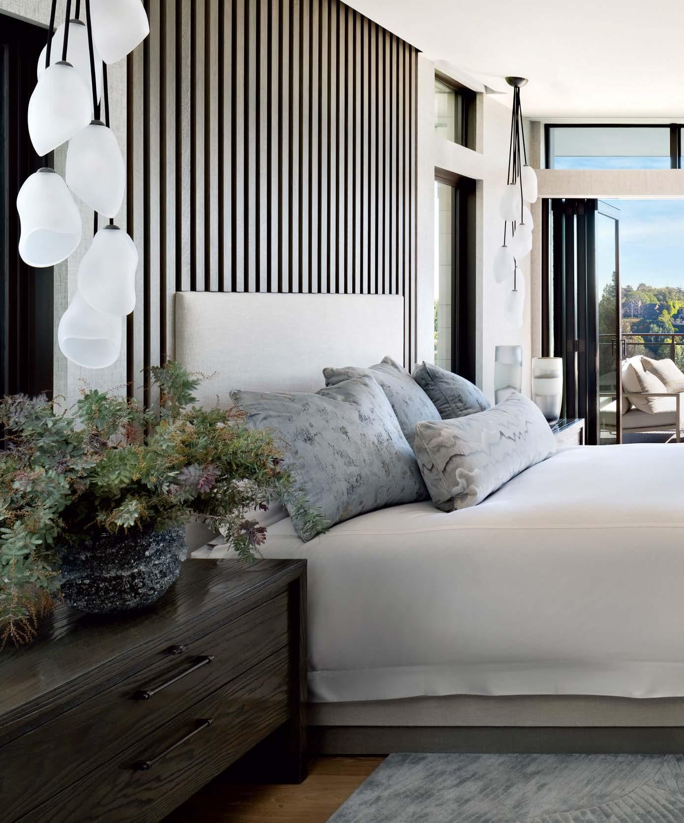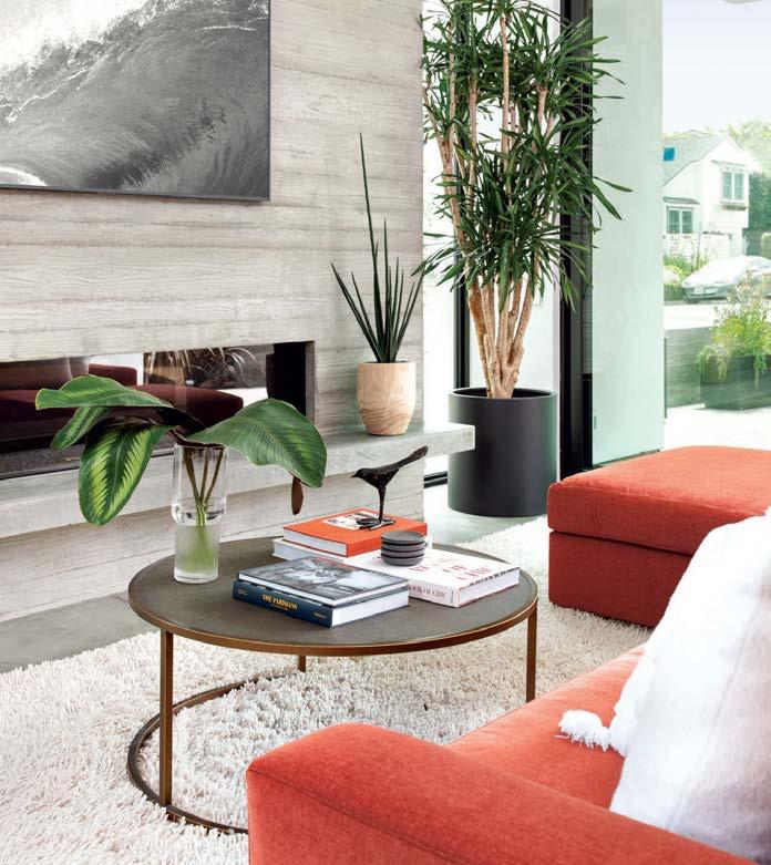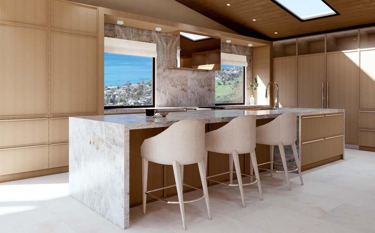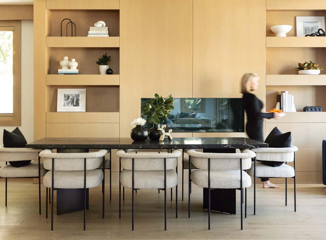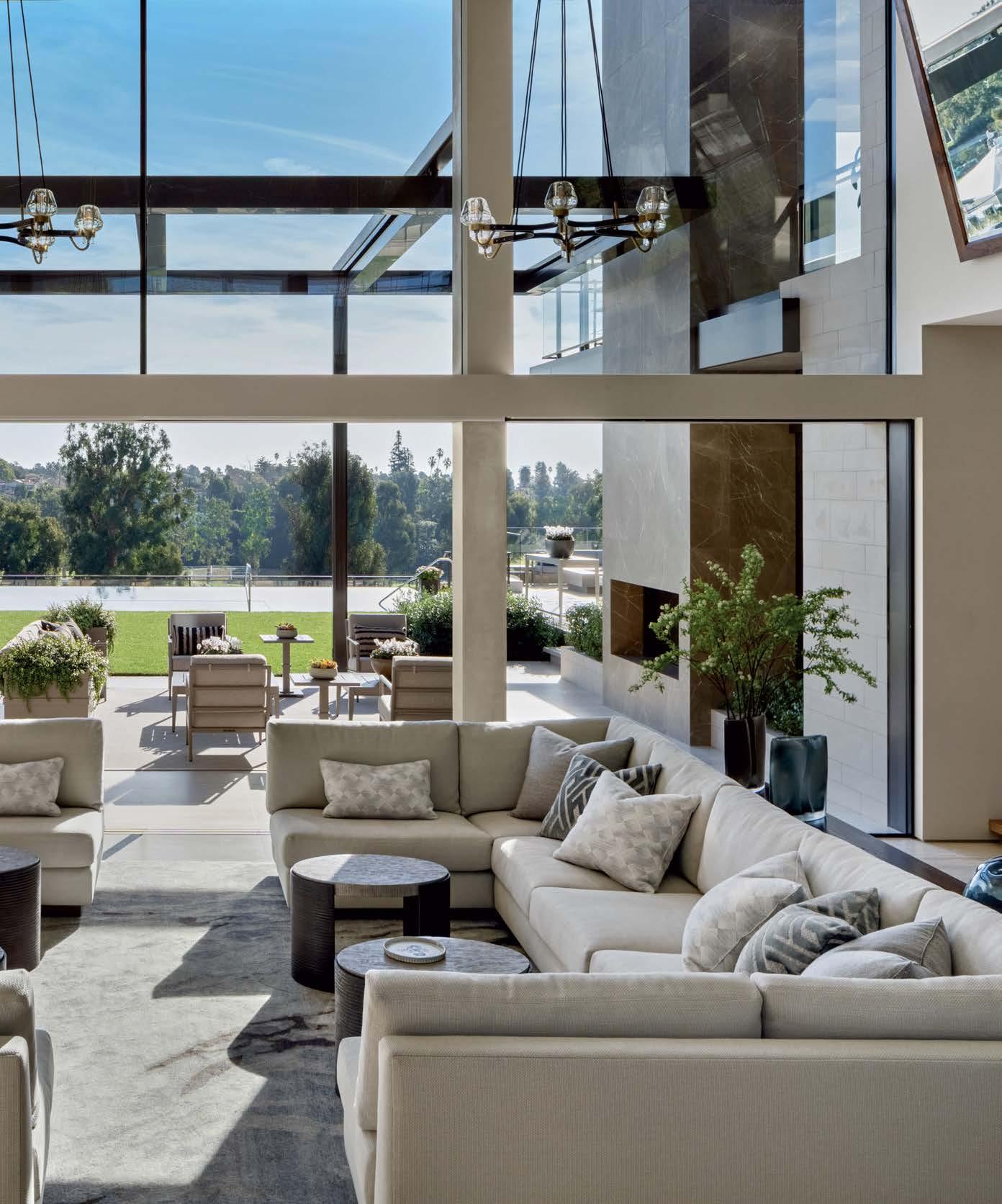 Some homes reveal themselves gradually, slowly lifting the veil. Others announce themselves immediately and confidently display their treasures. This Pacific Palisades home, a modernist-inspired masterpiece overlooking a golf course, falls into the latter category. “It’s not an intimate little entry; you walk right into everything—which really engages all your senses,” describes designer Jeff Andrews of architect Kip Kelly’s vision. It’s true: From the threshold, most of the openconcept main-level rooms and a portion of the second floor’s glass-railed bridge are visible. And every space is backdropped by a two-story façade of glass showcasing a fairway view. “There’s a lot to look at, but the vibe is calm and serene,” continues Andrews. “It’s the kind of house that really pulls you in, but as it does, nothing feels overwhelming.” The architect agrees, musing, “The quality of light invited into each room just makes you happy. It’s a magical place.” He would know. Kelly designed the residence in 2005, then was tapped by its new owners to reimagine it in collaboration with Andrews and general contractor Dana Benson. He welcomed the opportunity to refresh his work. Conceived as two pavilion-style structures with an open living space in the center and a second-story bridge connecting the wings (“allowing you to float above that interior area,” notes the architect), the house is defined by its strong lines, dramatic cantilevered roofs and an extensive use of glass that erases the line between inside and out. At the highest plane, a linear skylight runs end to end, “balancing all the daylight,” says Kelly. The homeowners, golf enthusiasts and frequent entertainers, opted to keep the core of the house’s original layout intact, but desired fewer dividers. “Previously, the kitchen and family room were walled off from the living room, but as our clients live more casually, we opened them all up in this iteration to create a true great room,” adds the architect.