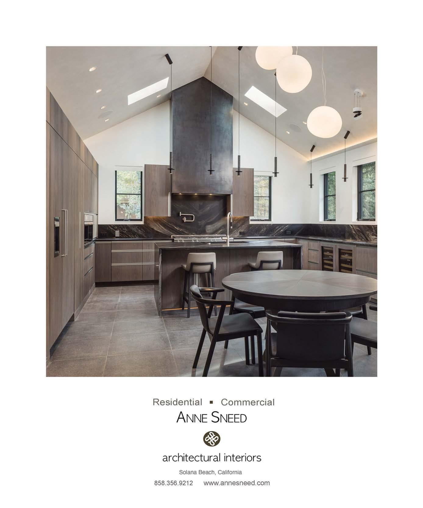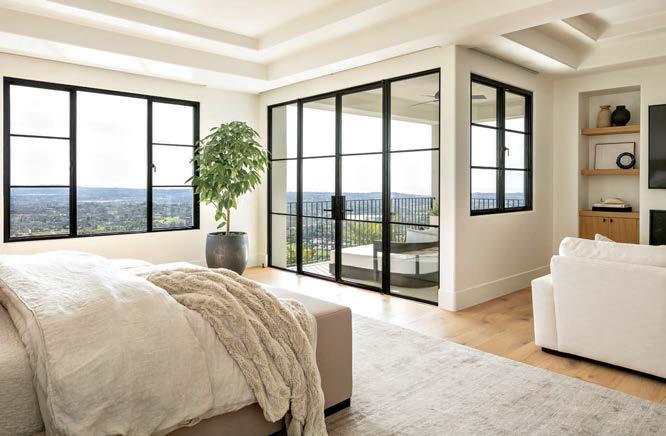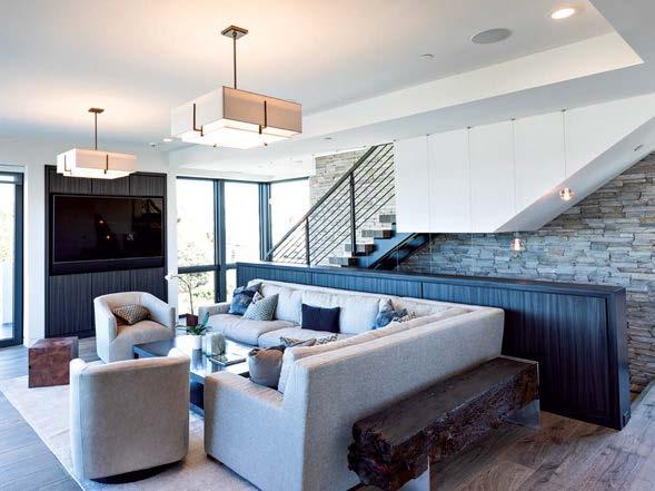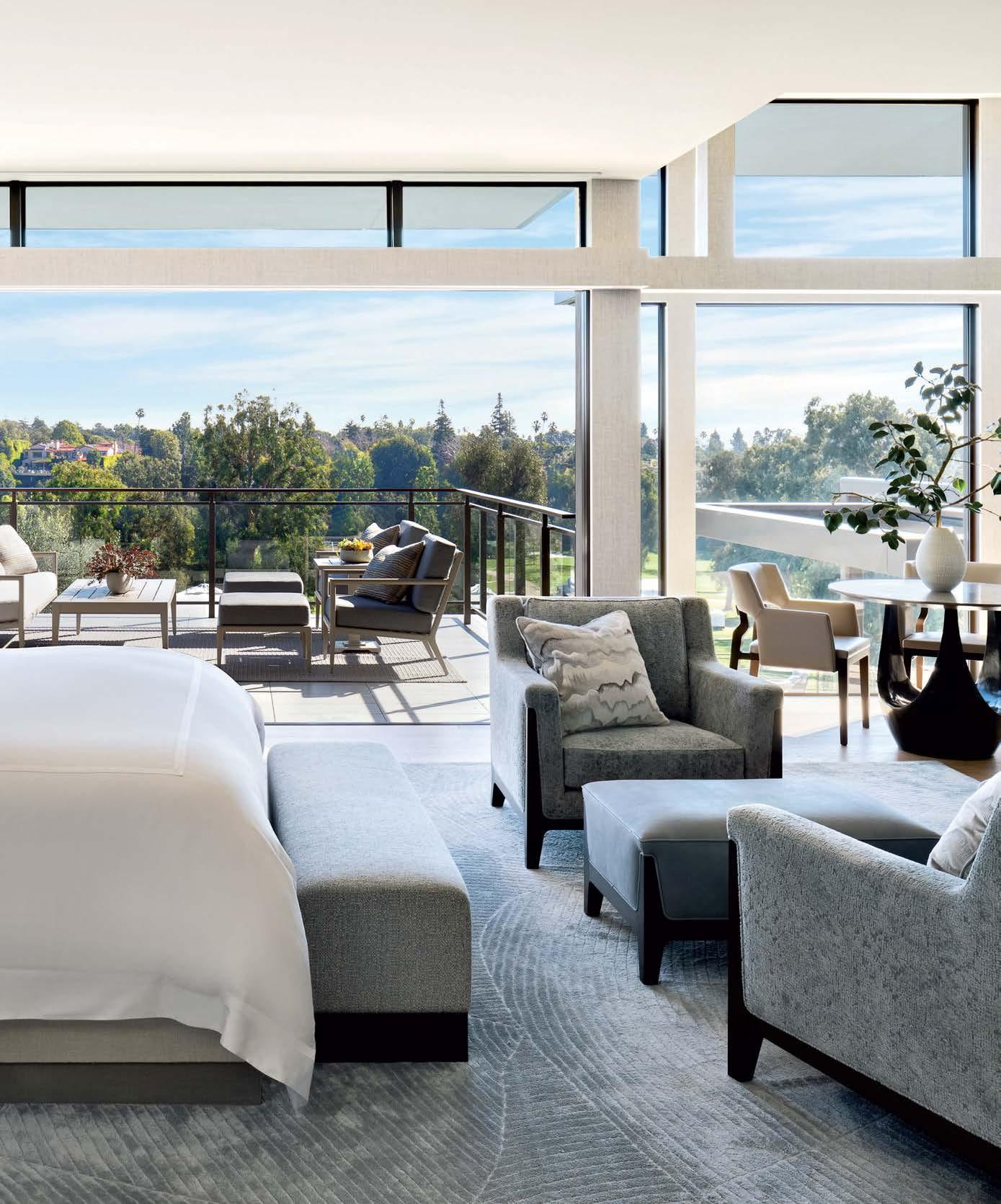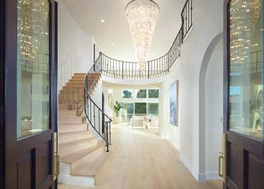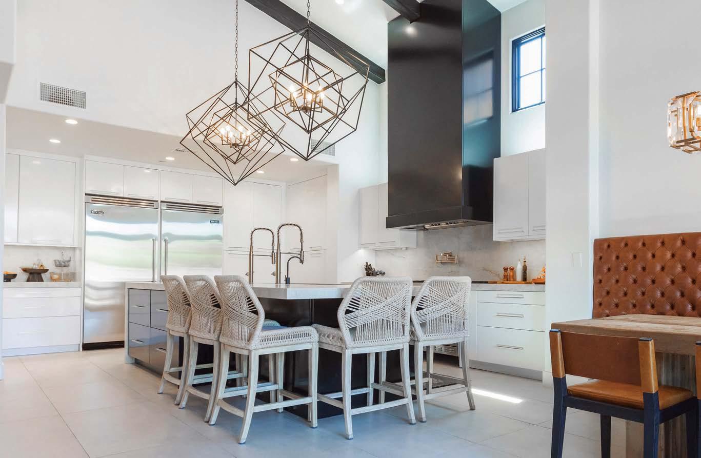 Some homes reveal themselves gradually, slowly lifting the veil. Others announce themselves immediately and confidently display their treasures. This Pacific Palisades home, a modernist-inspired masterpiece overlooking a golf course, falls into the latter category. “It’s not an intimate little entry; you walk right into everything—which really engages all your senses,” describes designer Jeff Andrews of architect Kip Kelly’s vision. It’s true: From the threshold, most of the openconcept main-level rooms and a portion of the second floor’s glass-railed bridge are visible. And every space is backdropped by a two-story façade of glass showcasing a fairway view. “There’s a lot to look at, but the vibe is calm and serene,” continues Andrews. “It’s the kind of house that really pulls you in, but as it does, nothing feels overwhelming.” The architect agrees, musing, “The quality of light invited into each room just makes you happy. It’s a magical place.” He would know. Kelly designed the residence in 2005, then was tapped by its new owners to reimagine it in collaboration with Andrews and general contractor Dana Benson. He welcomed the opportunity to refresh his work. Conceived as two pavilion-style structures with an open living space in the center and a second-story bridge connecting the wings (“allowing you to float above that interior area,” notes the architect), the house is defined by its strong lines, dramatic cantilevered roofs and an extensive use of glass that erases the line between inside and out. At the highest plane, a linear skylight runs end to end, “balancing all the daylight,” says Kelly. The homeowners, golf enthusiasts and frequent entertainers, opted to keep the core of the house’s original layout intact, but desired fewer dividers. “Previously, the kitchen and family room were walled off from the living room, but as our clients live more casually, we opened them all up in this iteration to create a true great room,” adds the architect.