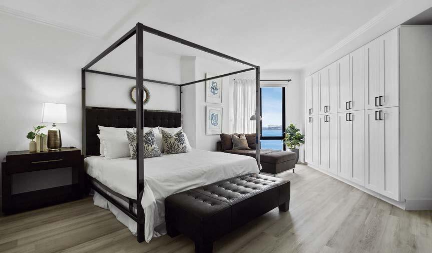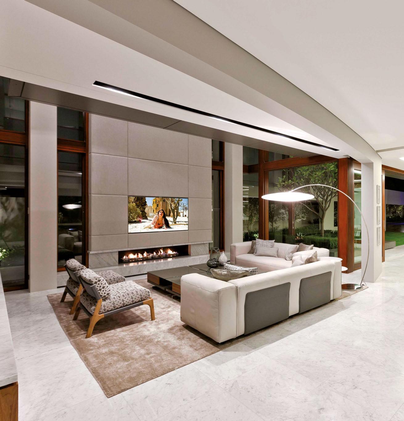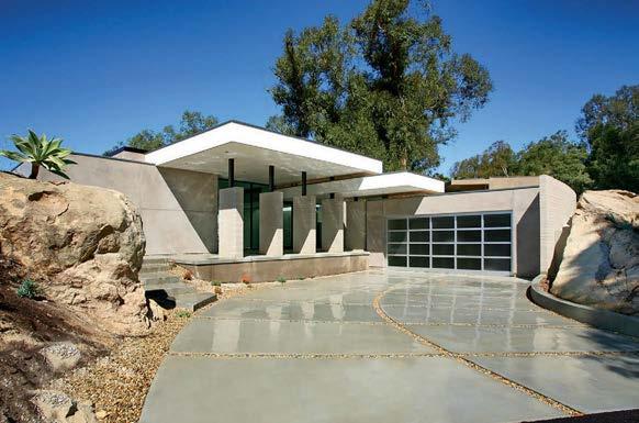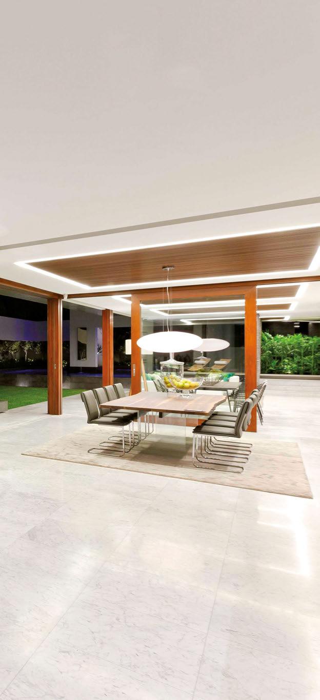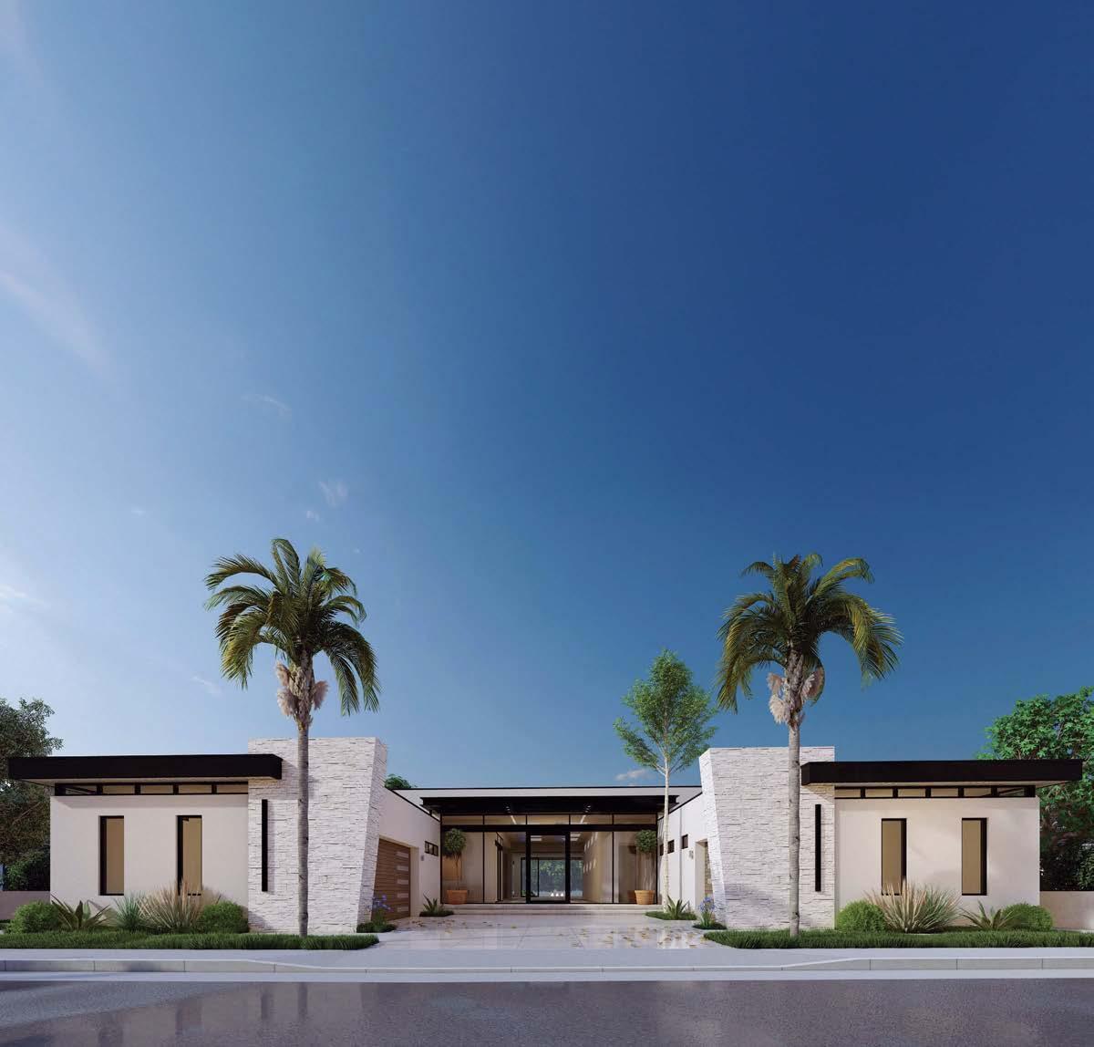 Some homes reveal themselves gradually, slowly lifting the veil. Others announce themselves immediately and confidently display their treasures. This Pacific Palisades home, a modernist-inspired masterpiece overlooking a golf course, falls into the latter category. “It’s not an intimate little entry; you walk right into everything—which really engages all your senses,” describes designer Jeff Andrews of architect Kip Kelly’s vision. It’s true: From the threshold, most of the openconcept main-level rooms and a portion of the second floor’s glass-railed bridge are visible. And every space is backdropped by a two-story façade of glass showcasing a fairway view. “There’s a lot to look at, but the vibe is calm and serene,” continues Andrews. “It’s the kind of house that really pulls you in, but as it does, nothing feels overwhelming.” The architect agrees, musing, “The quality of light invited into each room just makes you happy. It’s a magical place.” He would know. Kelly designed the residence in 2005, then was tapped by its new owners to reimagine it in collaboration with Andrews and general contractor Dana Benson. He welcomed the opportunity to refresh his work. Conceived as two pavilion-style structures with an open living space in the center and a second-story bridge connecting the wings (“allowing you to float above that interior area,” notes the architect), the house is defined by its strong lines, dramatic cantilevered roofs and an extensive use of glass that erases the line between inside and out. At the highest plane, a linear skylight runs end to end, “balancing all the daylight,” says Kelly. The homeowners, golf enthusiasts and frequent entertainers, opted to keep the core of the house’s original layout intact, but desired fewer dividers. “Previously, the kitchen and family room were walled off from the living room, but as our clients live more casually, we opened them all up in this iteration to create a true great room,” adds the architect.