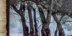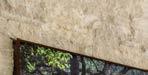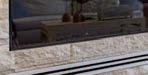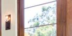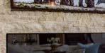 Another view of the courtyard showcases a hallway that crosses through the outdoor sanctuary. Euroline sliders on either side of it pocket away completely, erasing its walls. A water feature fitted into a limestone accent wall between two olive trees creates ambience.