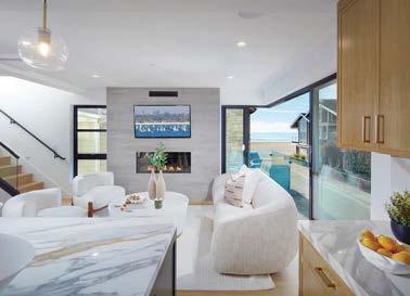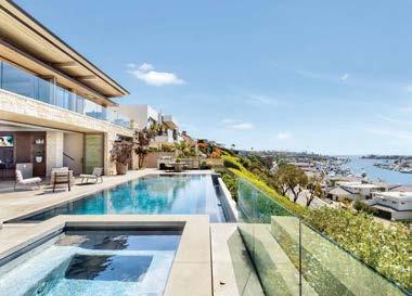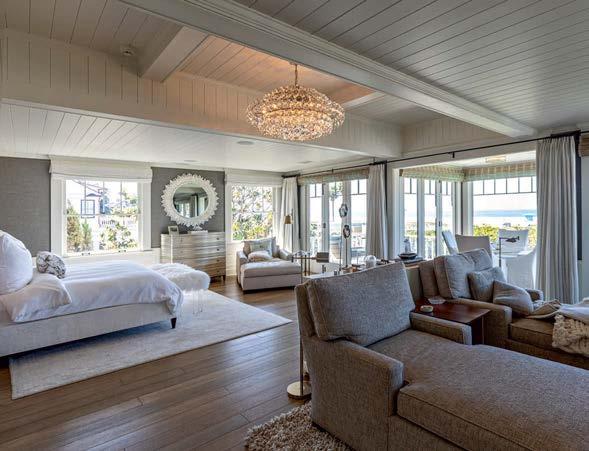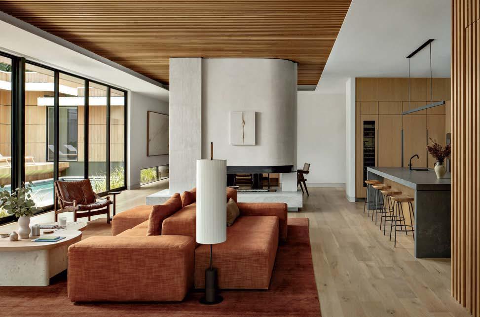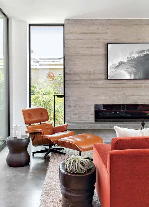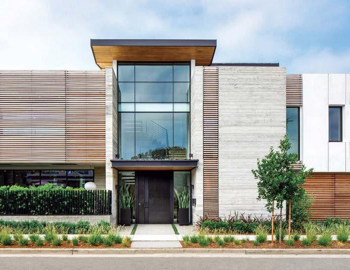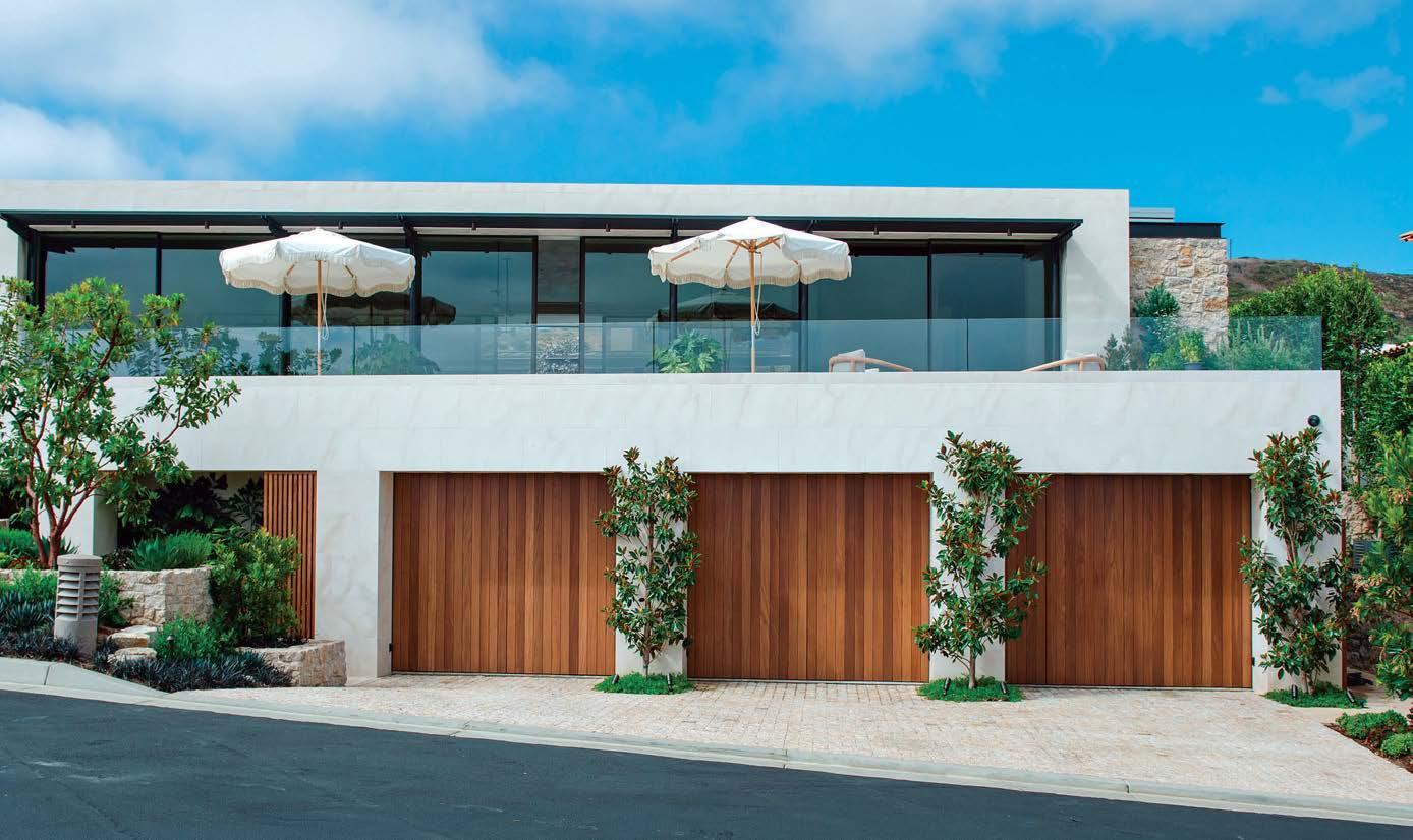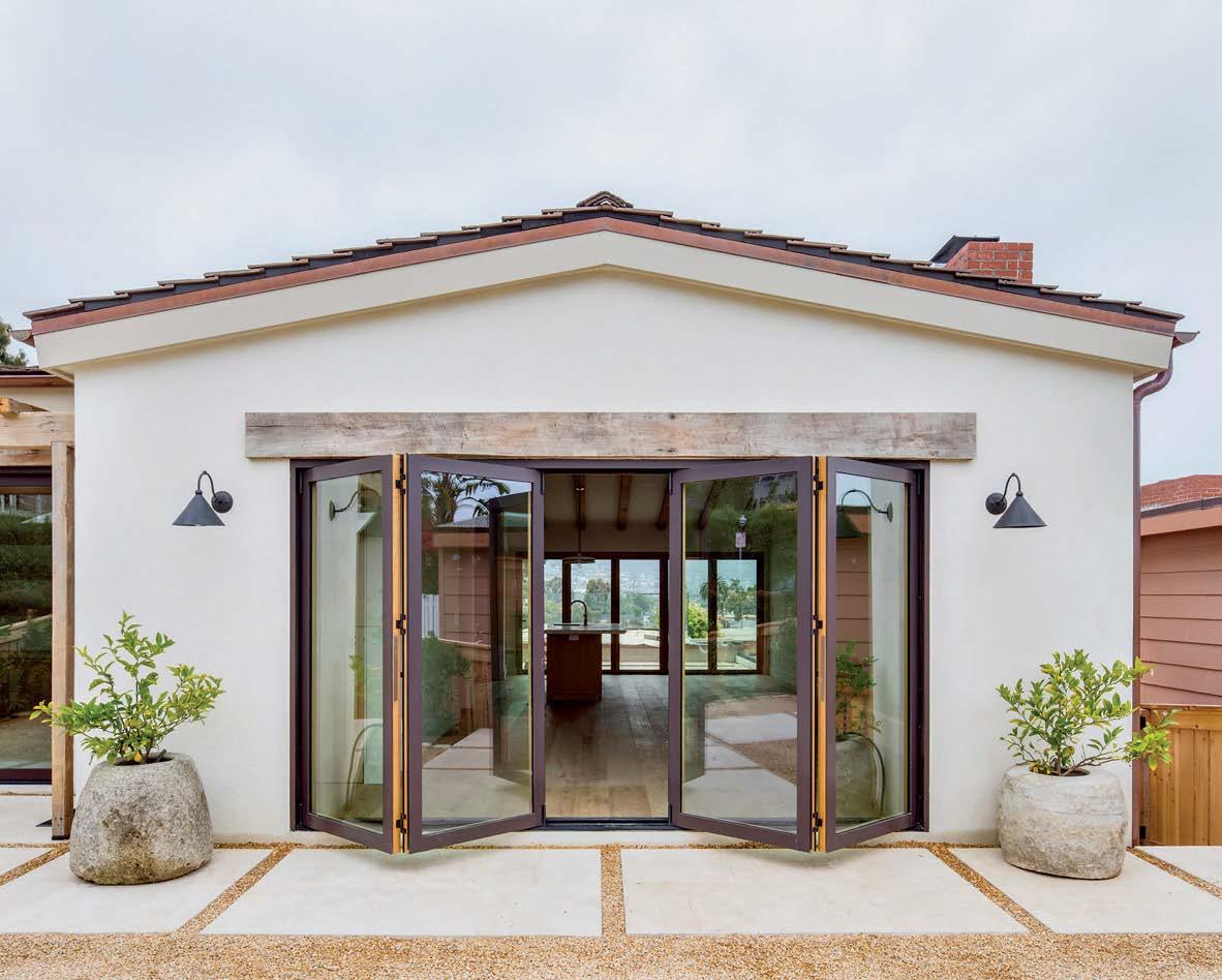 Clasen. The surfaces she’s referring to, deliberately rugged finishes of roughsawn cedar, wire-brushed oak and textured limestone, all of which repeat on the exterior, can handle it. And as the athletic owner is an avid surfer, the appearance of a few dings from his board is likely. His love of surfing actually factored into the project from the start: He contacted Clasen after admiring her playful, laid-back design of pro wave rider Kelly Slater’s renowned Surf Ranch resort. After an initial attempt at a renovation made clear the need for a brand-new build, architect Eric Olsen dived in, dreaming up a design that embraces indooroutdoor living and celebrates the Corona del Mar property’s close connection with the ocean.