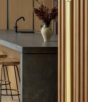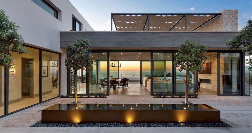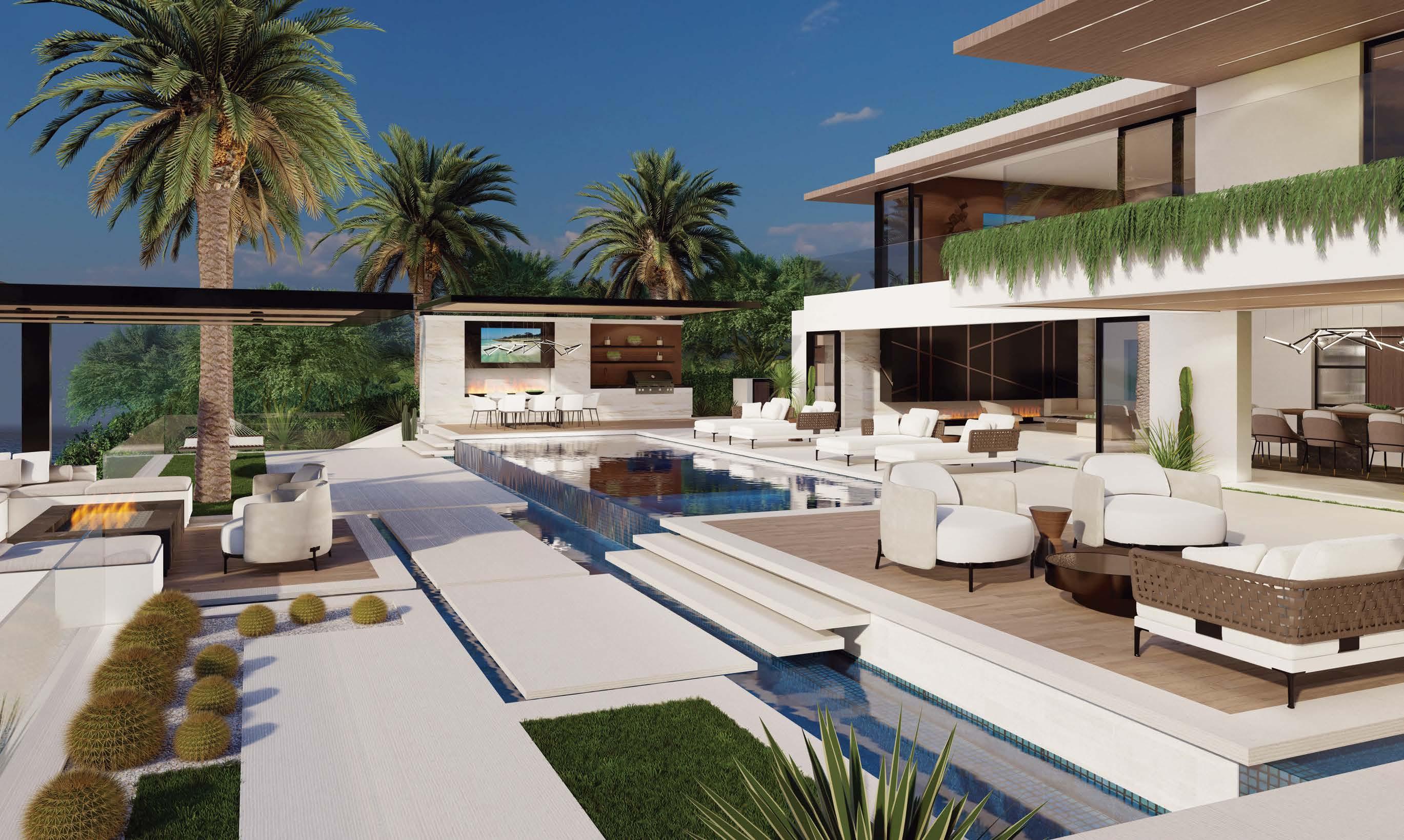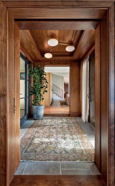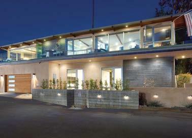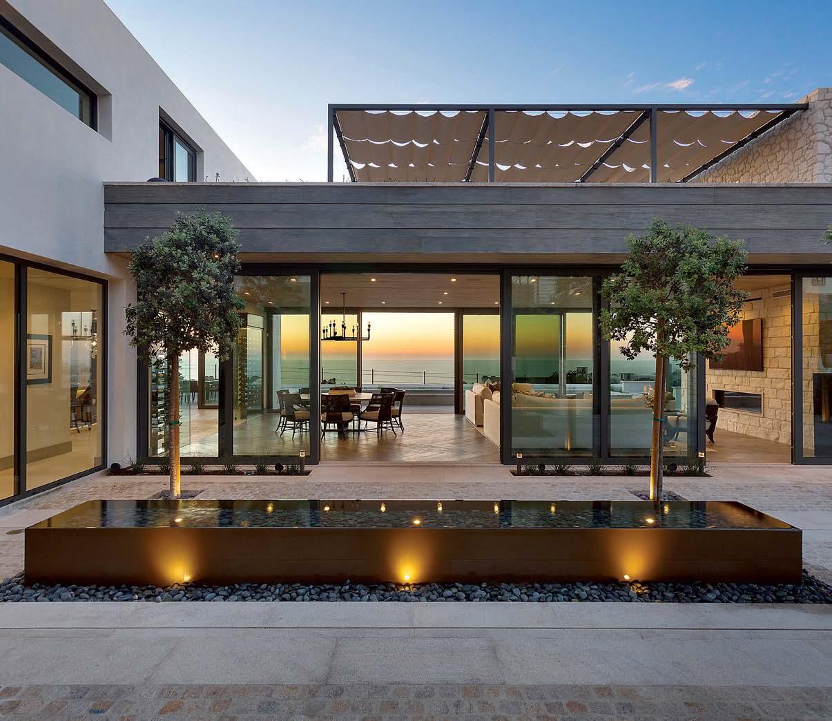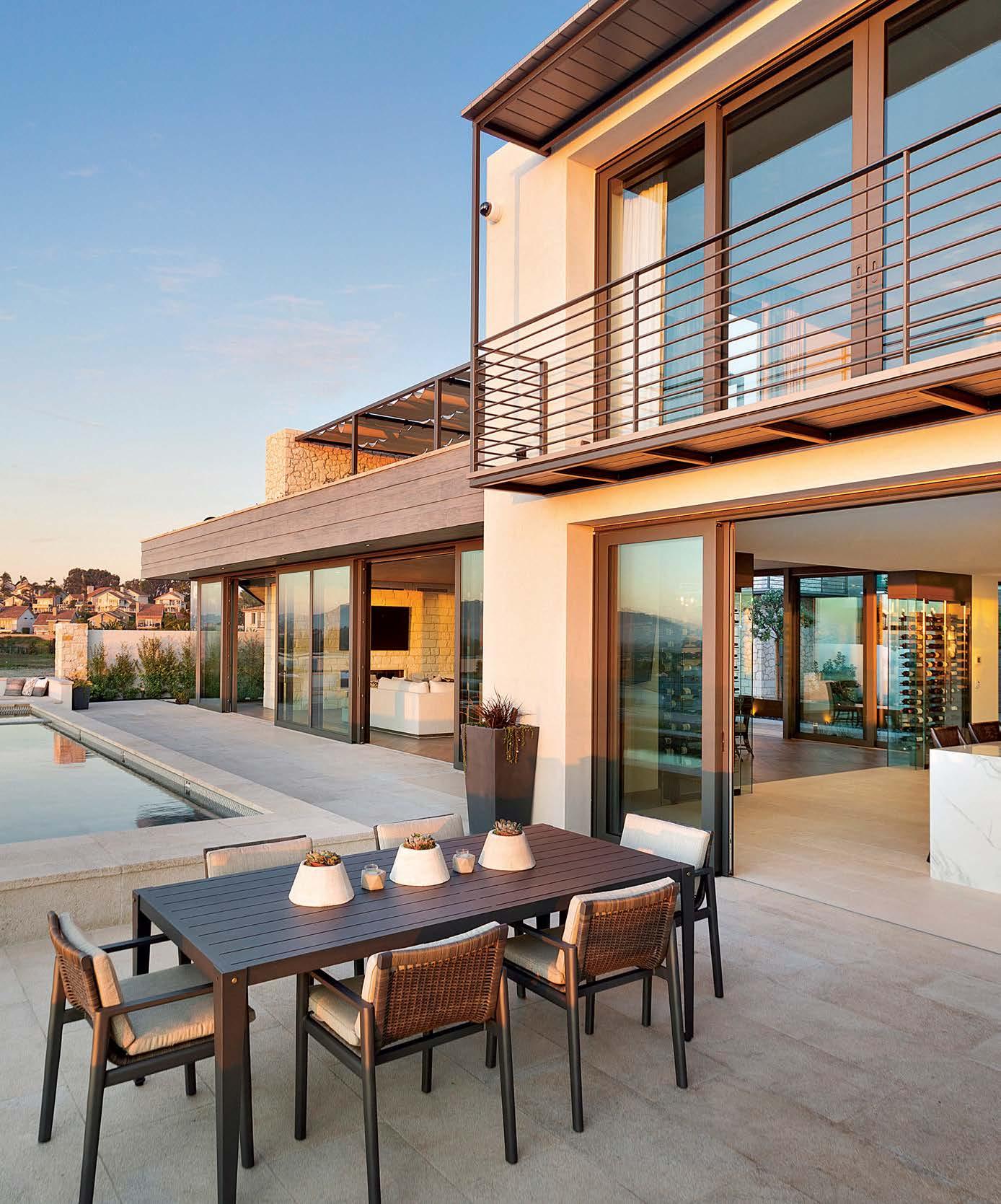 Clasen. The surfaces she’s referring to, deliberately rugged finishes of roughsawn cedar, wire-brushed oak and textured limestone, all of which repeat on the exterior, can handle it. And as the athletic owner is an avid surfer, the appearance of a few dings from his board is likely. His love of surfing actually factored into the project from the start: He contacted Clasen after admiring her playful, laid-back design of pro wave rider Kelly Slater’s renowned Surf Ranch resort. After an initial attempt at a renovation made clear the need for a brand-new build, architect Eric Olsen dived in, dreaming up a design that embraces indooroutdoor living and celebrates the Corona del Mar property’s close connection with the ocean.