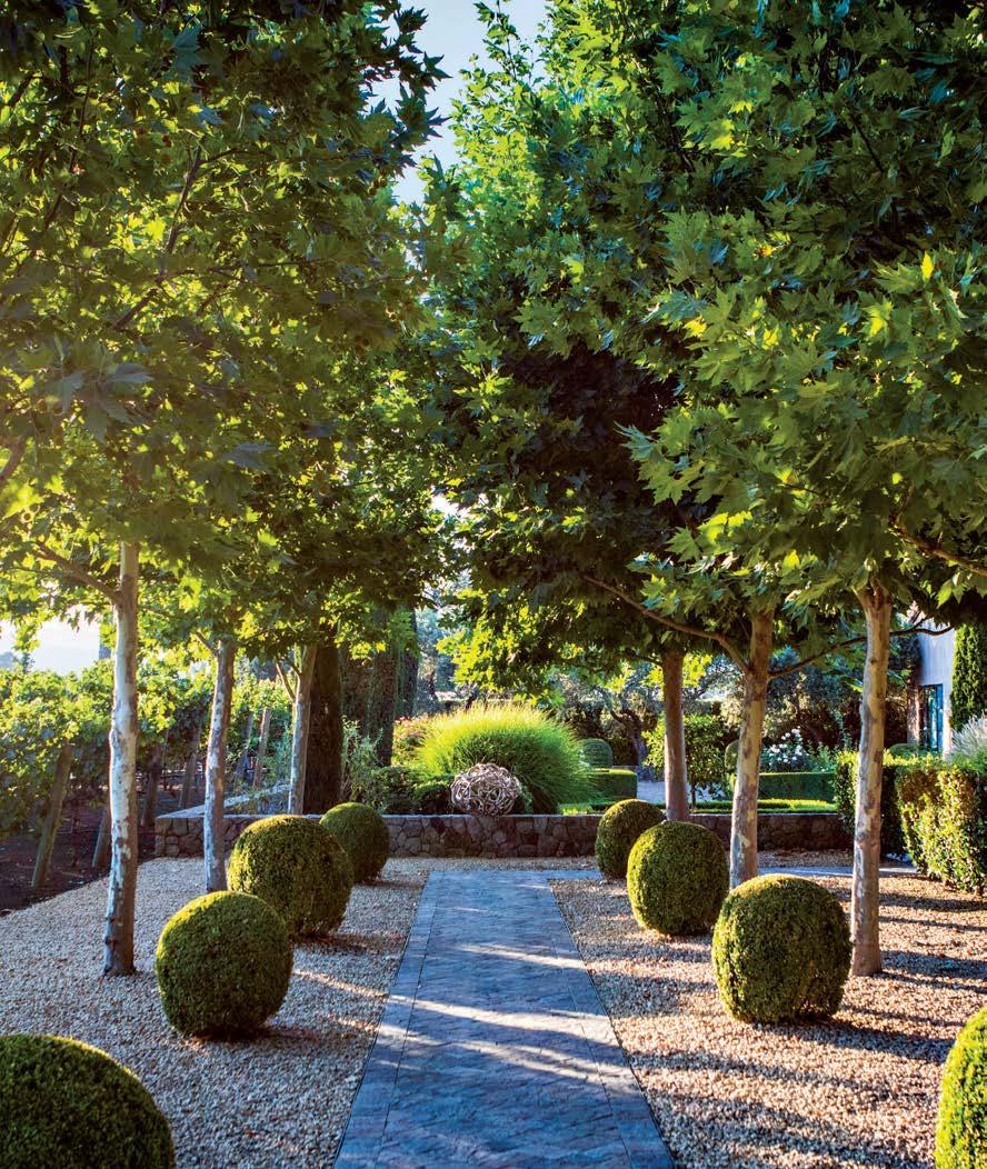 Landscape designer Alyssa Pettersen lined the entryway with shrubs and perennials, including boxwood globes, dwarf olive shrubs and salvia, overlooked by graceful maple trees. Garonne limestone sourced via Eco Outdoor accents the façade.