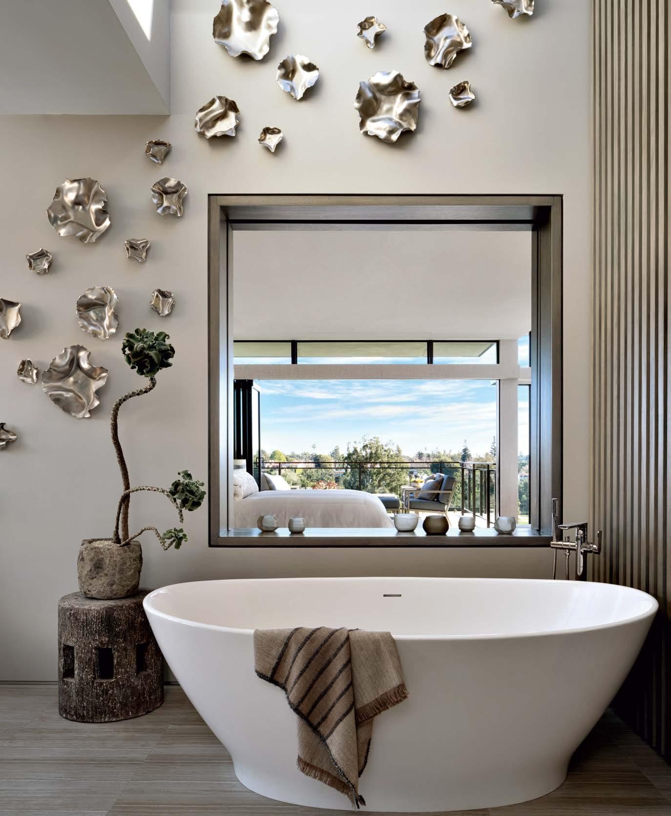 Opposite: In the same space, Ron Dier Design ceramics drift down the wall above an Aquatic tub, which also features Kallista hardware. The carved stool is from Blackman Cruz. An inner window looks into the primary bedroom.