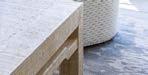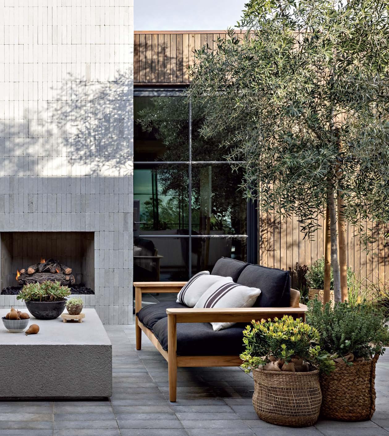 Previous page: Aged Moroccan limestone tile from Exquisite Surfaces, paired with a fireplace of tumbled Garonne limestone, adds texture to an inner courtyard. The lounge chairs and sofa are Design Within Reach and the table is RH.