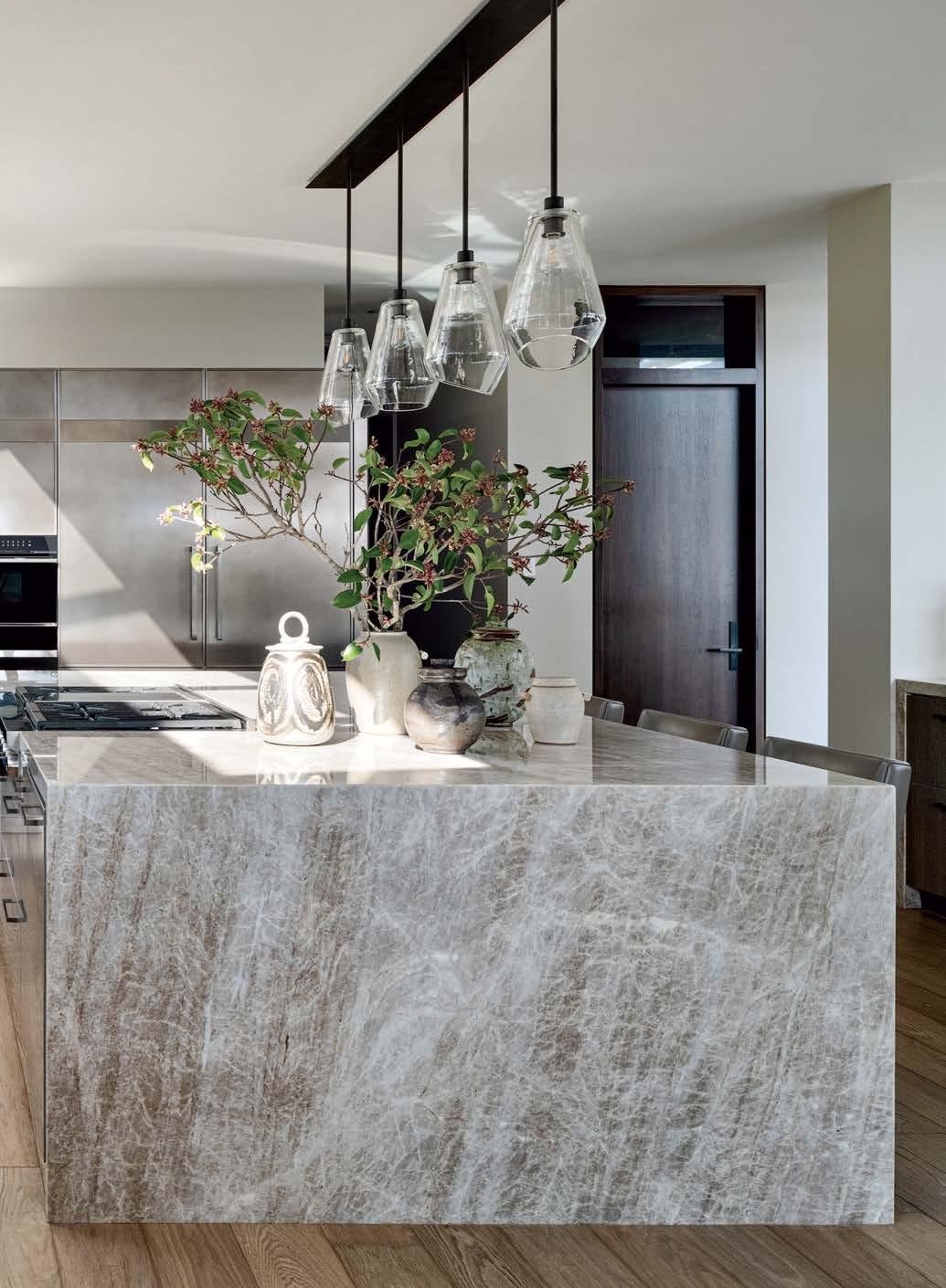 Bespoke kitchen cabinetry designed in collaboration with Cooper Pacific pairs elegantly with a large island of Perla quartzite topped with a Zia Priven linear chandelier. The ceramic vessels are vintage finds by designer Jeff Andrews.