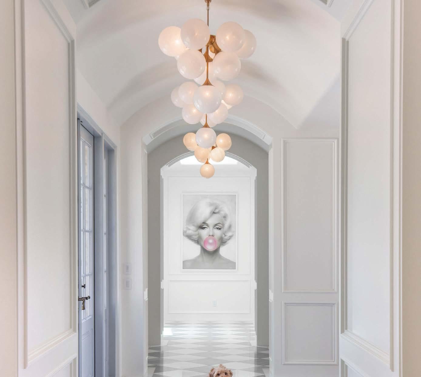 Previous page: The Rug Company’s Calacatta carpet grounds A.Rudin sofas and Gregorius Pineo tables near the living area’s Jurassic marble-lined fireplace. Jonathan Browning Studios chandeliers fill the space overhead.