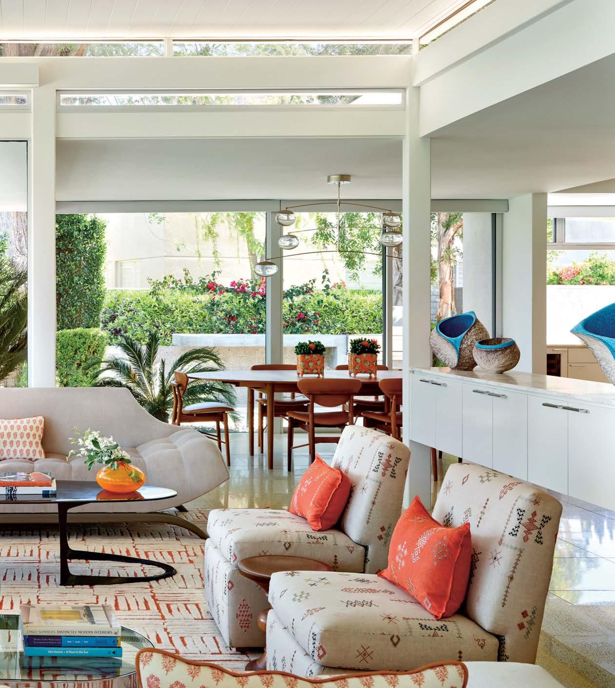 and allow for effortless movement outdoors. Alongside all the floor-to-ceiling glass, white walls and pale terrazzo-tile floors serve as a clean canvas that neatly ties all the spaces together. Summers selected vibrant hues to help drive her design (“The desert loves color, that’s for sure,” she says). In the living room, a space defined yet visually open to the dining room and kitchen, a tufted orange-and-white rug strikes a cheerful note. “I can’t resist a touch of orange; it’s a great accent color,” the designer comments. “It works especially well in this area, as its surrounded by orange and tangerine trees.” She peppered the hue into various textiles throughout the house, even selecting a midcentury starburst clock in the peppy shade for the open kitchen, where it winks from white walls. “Keeping the kitchen so neutral made it very easy to assimilate into the flow of the whole house,” Summers says. “This is such a casual living style.”