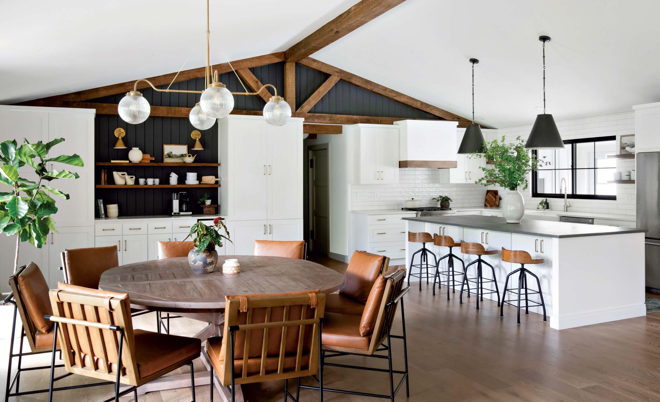 Under In Common With pendants, an Arhaus dining table and CB2 chairs in a Zinc Textile fabric rest at the great room’s center. A living area features a custom sectional and J. Hefner Designs side table. Euroline sliders connect to the courtyard.