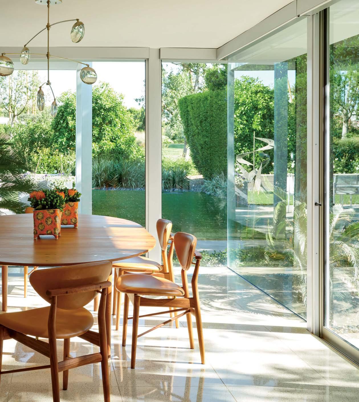 Finn Juhl’s 108 chairs, introduced in 1955, and Silver Table, an iconic 1948 design, nod to the home’s midcentury origins within a glass-walled dining area. Ochre’s Gaia pendant dangles overhead.