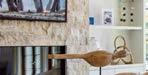 For instance, the white-veined taupe marble of the extensive living room fireplace makes a quiet but powerful statement; the kitchen’s massive island of warm ivory quartzite adds ample visual interest; and the owners’ bathroom includes the surprise of pewter-finish ceramic sculptures that trickle down a wall (“giving more gleam than glitz,” Andrews points out).