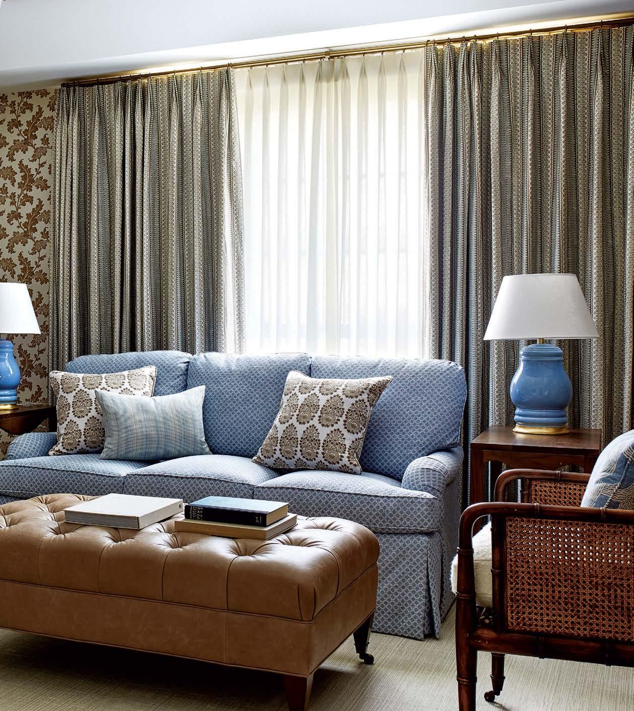 While the designer effortlessly conjures a sense of place through the palette and the occasional touch of rattan, there’s nary a ropewrapped lamp or sea-glass accent in sight. Instead, she envisioned a family-friendly retreat with elevated finishes. Take the living room, where a sand-toned grass-cloth wallcovering provides a textural backdrop for dollops of vibrant French blue, Indian-inspired paisley pillows and a graphic rug that grounds the room with deeper shades of cocoa. As a nod to the