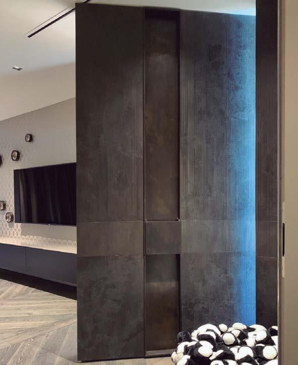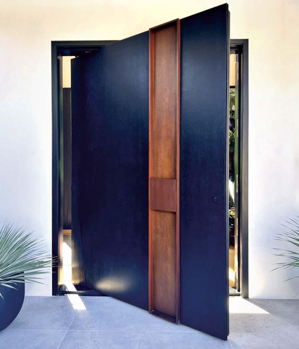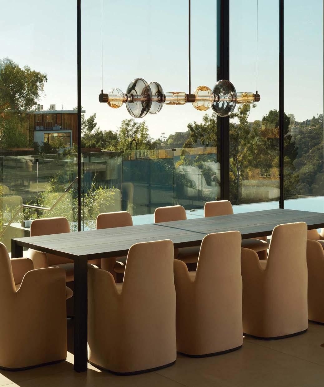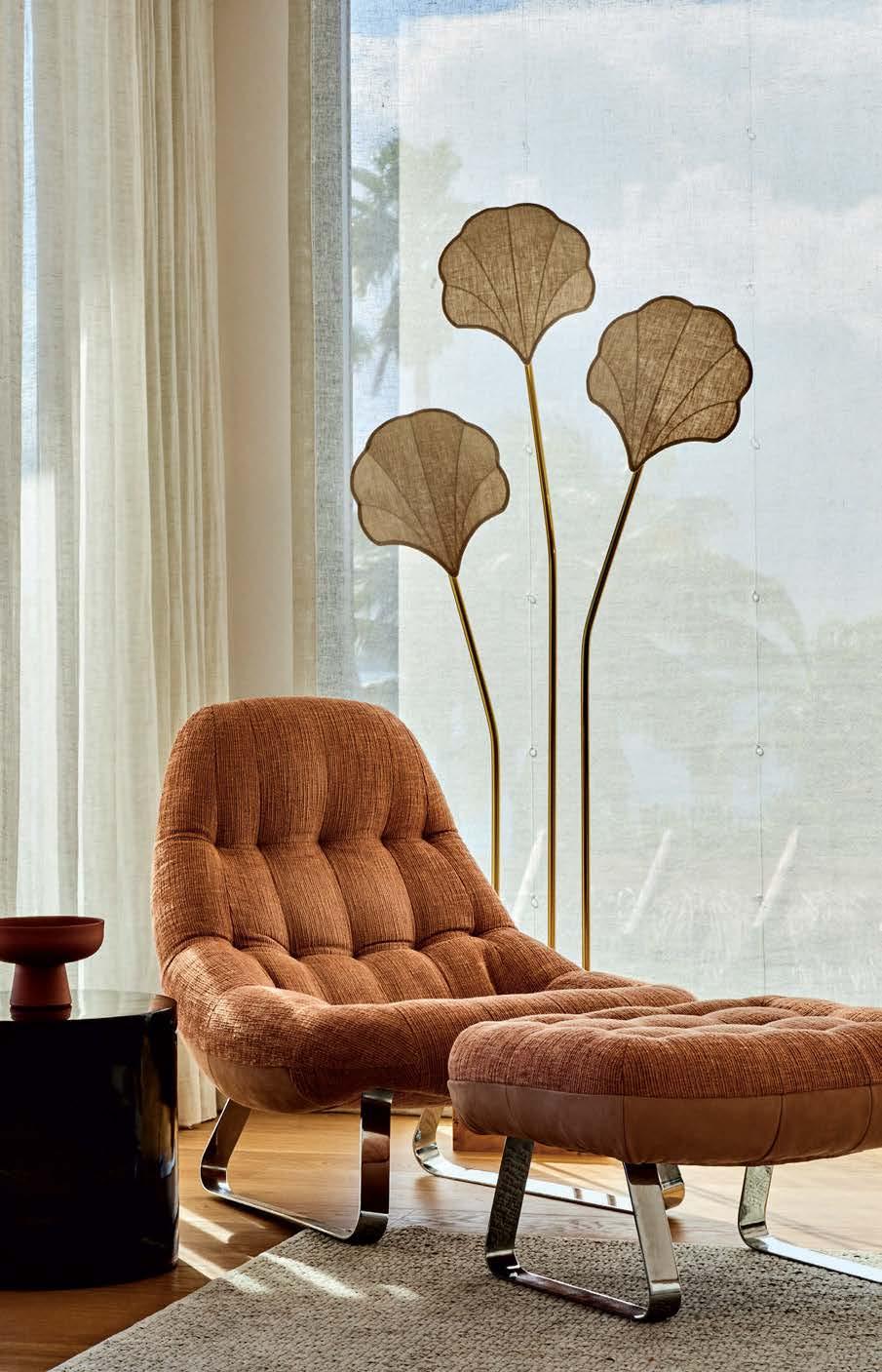 Taking into account the structure’s flat roof, double-height overhangs, large columns and generous windows, the designer wasted no time showing her clients conceptual presentations and mood boards full of ideas. Inspiration came from the West Coast, specifically the architecture and interiors of midcentury Los Angeles homes. “The house’s lines hark back to residences by Pierre Koenig, Raphael Soriano and Richard Neutra,” Collarte says. To enhance the indooroutdoor experience, she employed an earthy color palette, incorporating a range of beige, ochre and chocolate tones with statement touches of black.