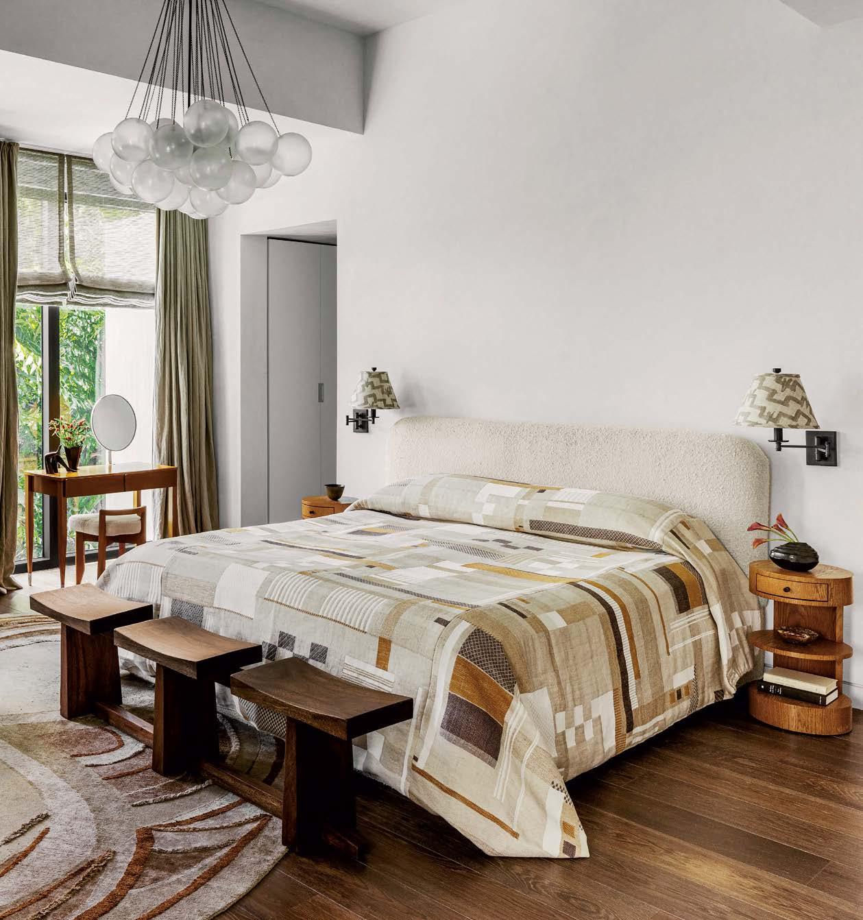 The clients arrived with a beloved collection of furnishings, decor and eclectic artworks, so the designer worked closely with them to round out the home with a unique array of pieces. For instance, surrounding the kitchen’s new iron table are the owners’ Brutalist stools. To occupy space beneath an existing geometric green artwork in the foyer, she acquired a 1960s French sideboard. A wall hanging and a midcentury chair that had adorned the family’s former living room are now accompanied by a sculptural brass floor lamp and a parasol-like chandelier in their new space. And in the primary bedroom, Collarte paired the couple’s curvy sofa with a custom bedspread boasting warm, natural hues. “There was a lot of adaptation and seeing how we could add new pieces and elements to what they already had to make it feel fresh,” she says.