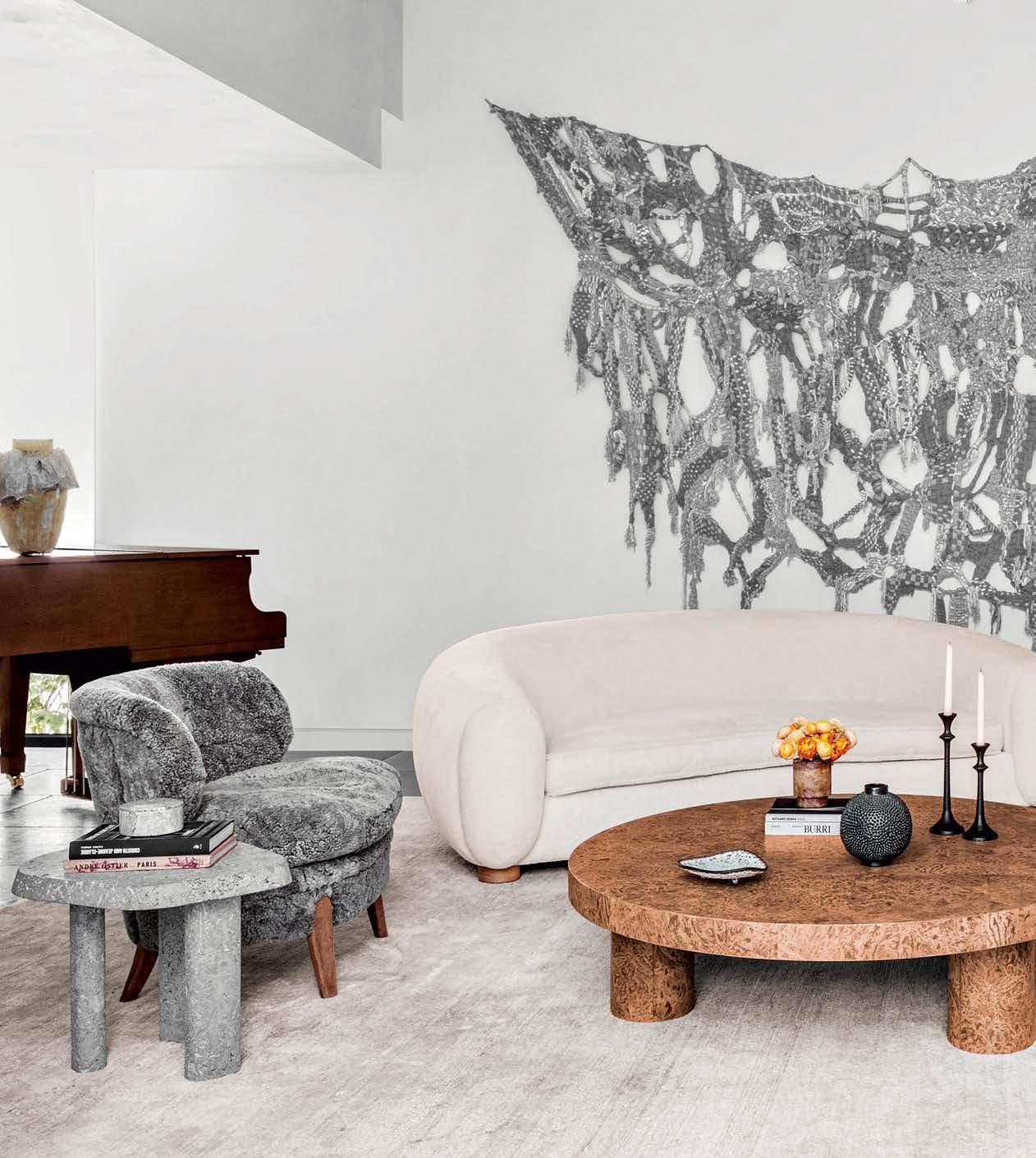 Tanya Aguiñiga artwork oversees the living area. An Otto Schulz for Boet chair joins Paul Matter’s Monolith floor lamp and custom pieces including the sofa, armchair and coffee table— all atop a Woven rug.
