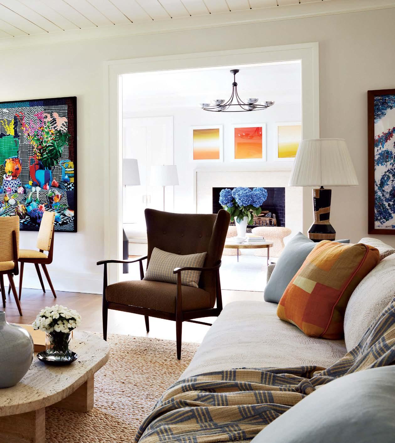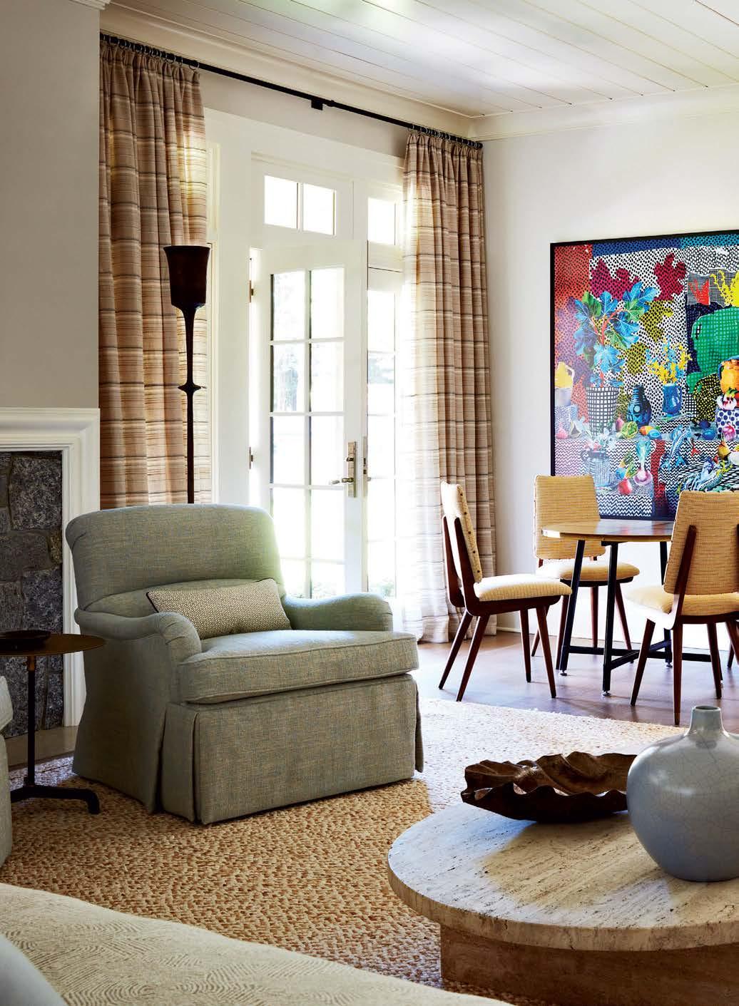 “The standard mentality is that art needs to be displayed on a plain white wall,” Carrier notes. “We opted for paint colors and wall treatments instead.” This was game changing for the design, allowing for a playful dialogue between art and decor—as well as between the spaces themselves. Take the formal living room, which embraces a classic Hamptons feel with its blue-and-white scheme established by pale furniture and a cerulean, Swedishinspired carpet. Here, the color shock of three citrus-hued James Welling photographs above the mantel keeps the interior from feeling traditional. In the adjoining family room, the designers then used the same hues but reversed them, with neutrals providing the base layer for cozy seating in colors that relate to the carpet and photography in the living room. “There’s definitely a distinction between the two rooms,” Carrier adds. “The family area is more loungelike. There’s nothing pretentious about it.”