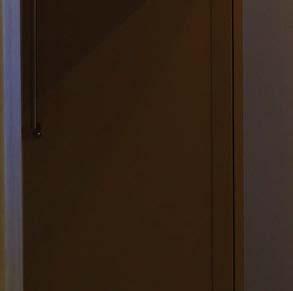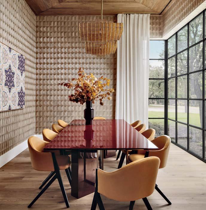 But if the crowd craves a cozier place to enjoy a meal or a cocktail, the dining room—with its deepgreen, hand-glazed walls—is the place to be. “It’s an evening room,” Carrier explains. “Our ethos is to go dark in that type of internal space to create the right atmosphere.” The moody wall color also works to offset the art. “You can see how beautifully the pieces respond to that green,” he says. For contrast, the ceiling was given a mint lacquer treatment and the 12-seater dining table was paired with chairs upholstered in tomato-red leather. And, since the clients wanted a more intimate option for enjoying meals together, Carrier and Miller installed a banquette and marble pedestal table at the far end of the room. “It’s like a cozy booth at your favorite restaurant,” Carrier muses.