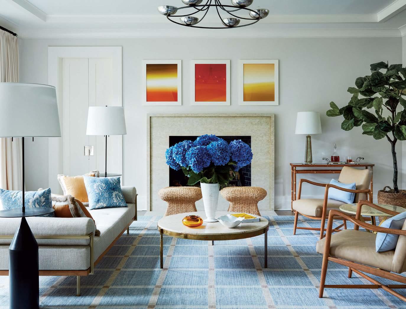 Above: Classic Hamptons design notes are reflected in the living room’s blue-and-white Rug & Kilim carpet, Carrier and Company for Century Furniture woven stools and, of course, the hydrangeas. A trio of James Welling photographs above the mantel provides an unexpected punch.